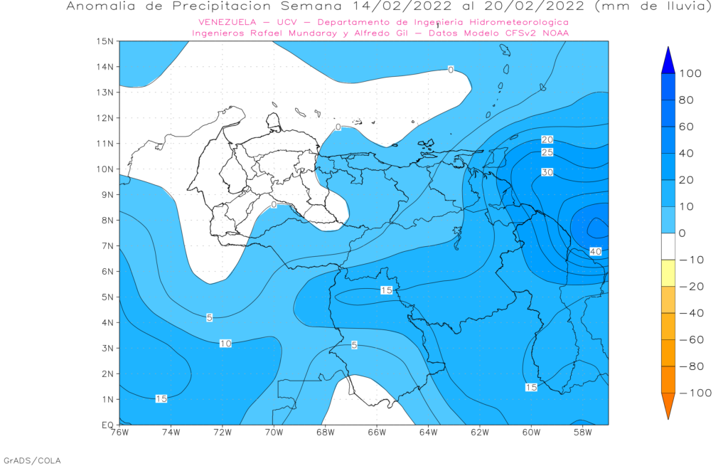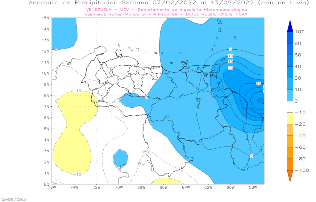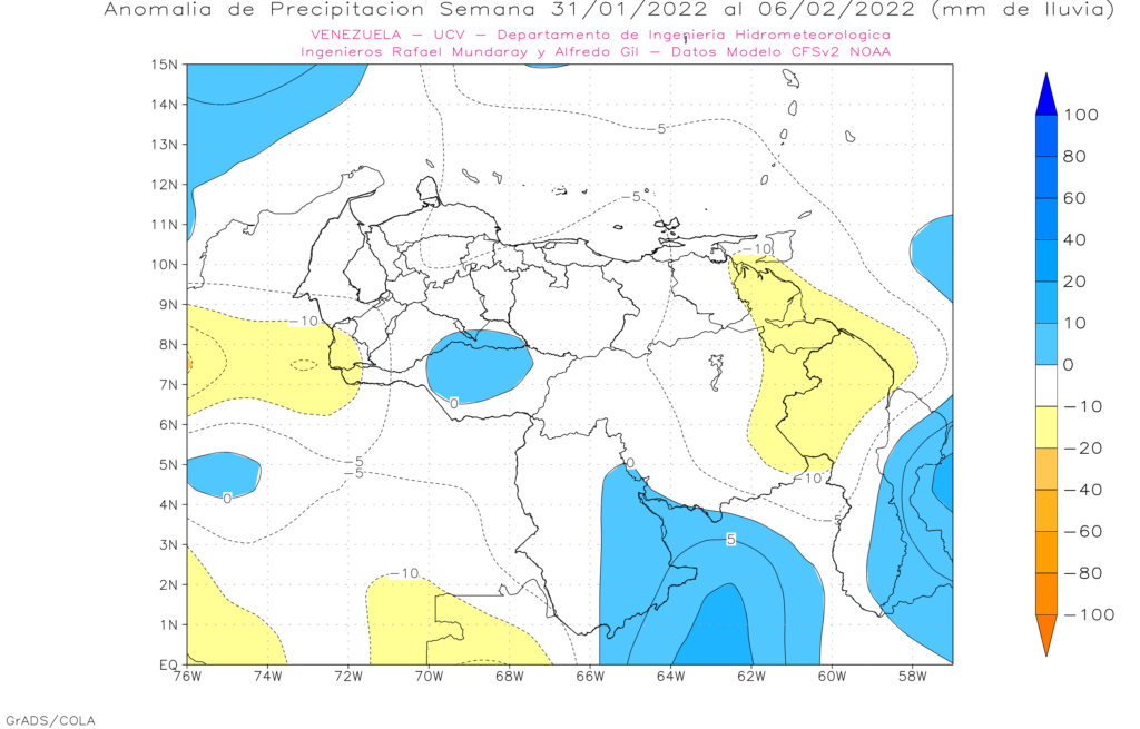 El modelo GFSV2 prevé en general eventos de precipitaciones dentro del promedio histórico, las anomalías negativas se esperan en en el Delta Amacuro y este de los estados Sucre y Monagas.