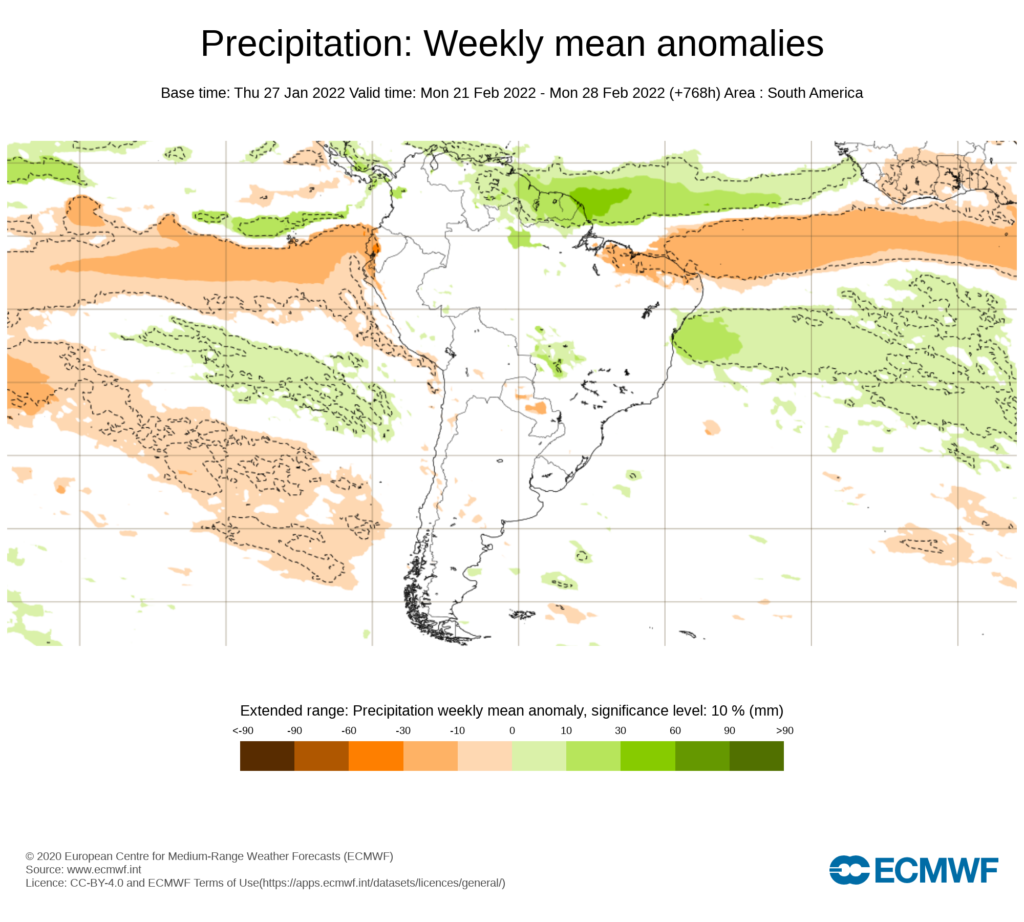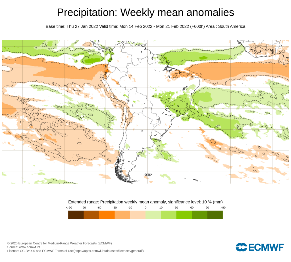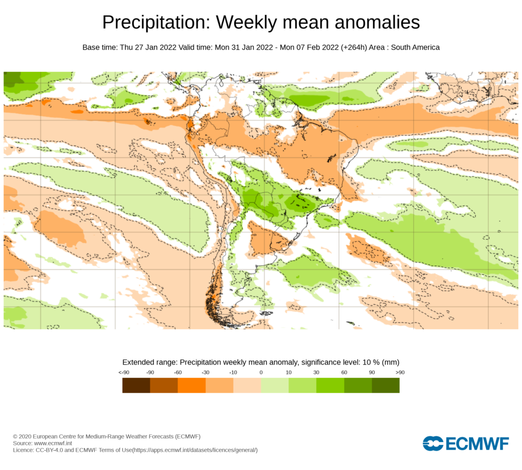 El pronostico semanal emitido por European Centre for Medium-Range Weather Forecast (ECMWF), se esperan precipitaciones dentro del promedio histórico.
