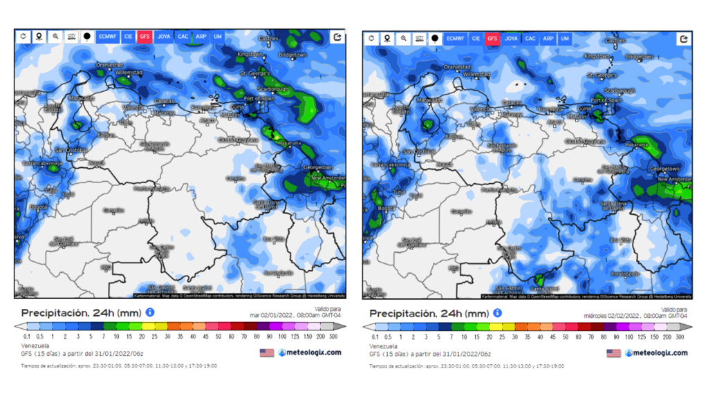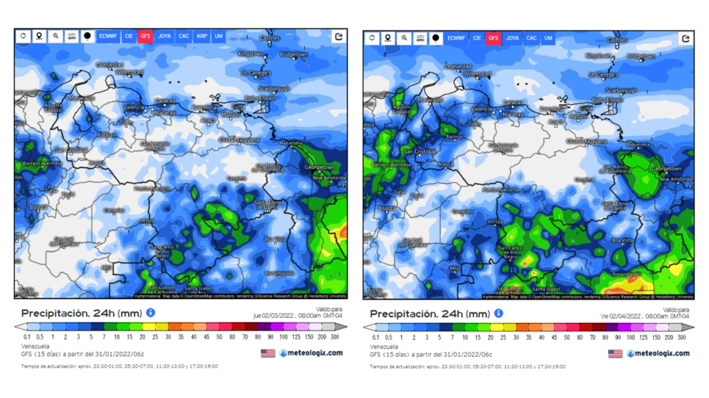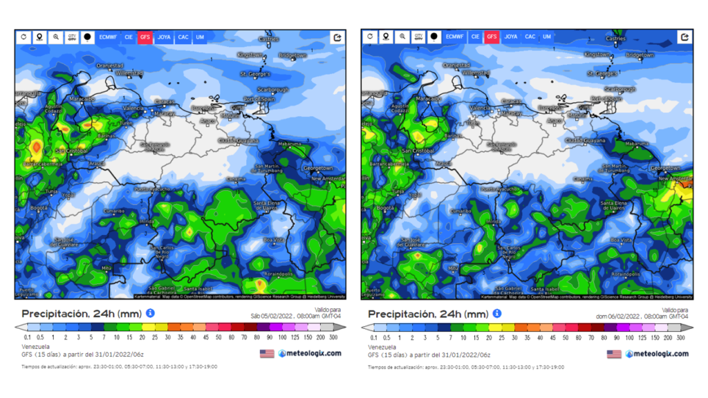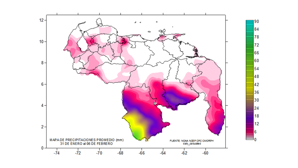 En el pronostico diario del modelo GFS del 31 de enero al 06 de febrero, se observan escasos eventos de precipitaciones en el transcurso de la semana, algunos eventos a lo largo del eje norte costero, para mediaidos de semana eventos al sur de de Bolívar y Amazonas, y para el final lluvias en los andes, Zulia y se mantiene algunos eventos en Bolívar y Amazonas