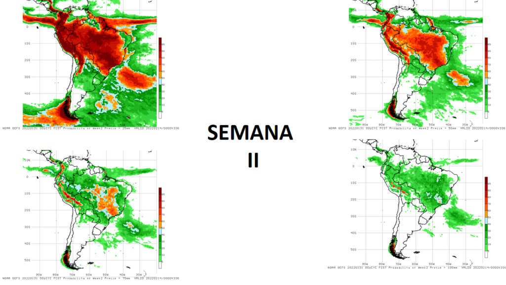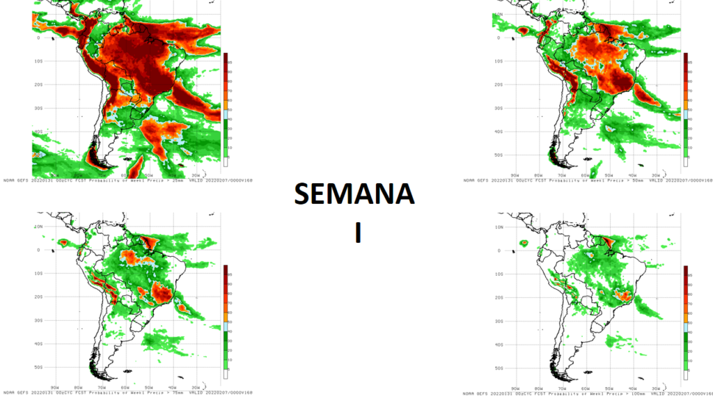 Las Probabilidades de excedencia total de precipitación para semana del 31 de enero al 07 de febrero, superiores a 25, 50, 75 y 100 mm, se prevé las mayores probabilidades para eventos mayores de 25 mm Bolívar, Amazonas, los andes y Delta Amacuro, la mayor probabilidad de 50 mm sur de los estados Amazonas y Bolívar, para eventos mayores de 75 y 100 mm las probabilidades se reducen y no se observan puntos importantes.