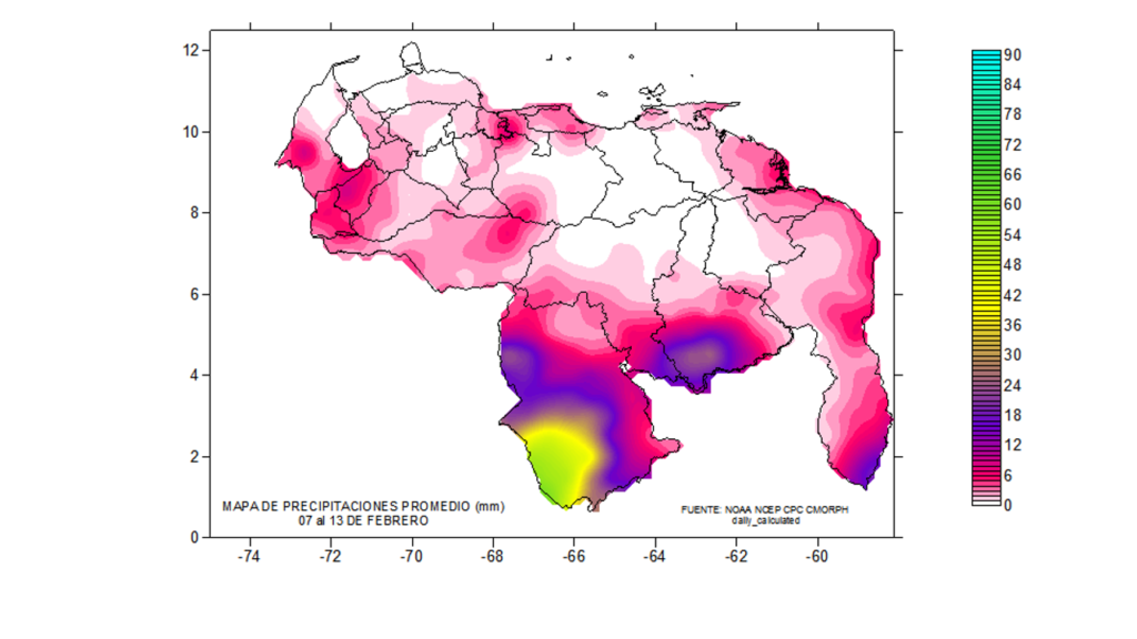 De acuerdo a la estadística de la precipitación estimada ( NOAA NCEP CPC CMORPH, daily_calculated) durante el periodo del 31/01 al 27/02/22, se observa que los principales eventos de precipitaciones ocurren al sur del país (Amazonas y sur de Bolívar), algunos eventos dispersos en el resto del país.