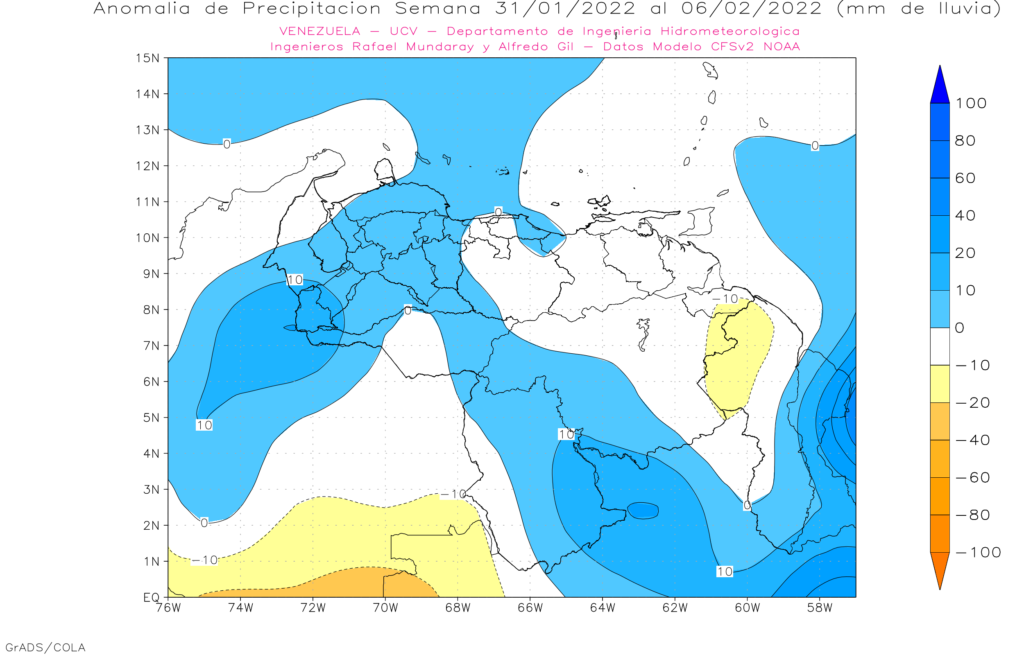 Pronostico de Anomalías Semanales para Venezuela, del 31/01 al 27/02/22, usando datos del Modelo CFSv2 de NOAA y ECMWF.
