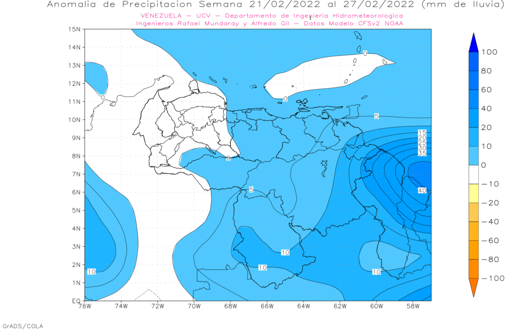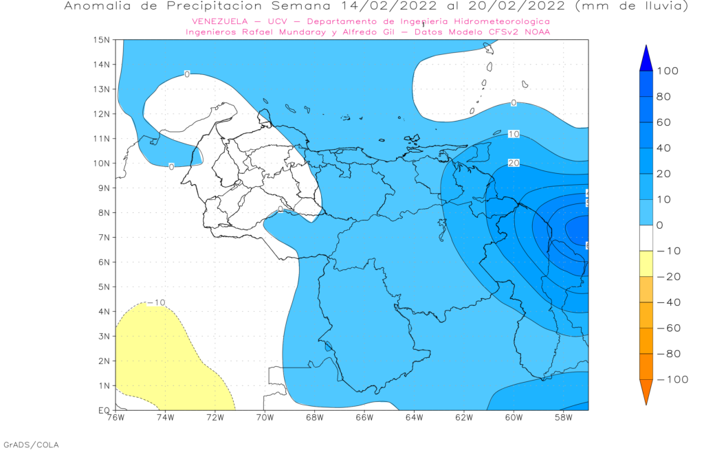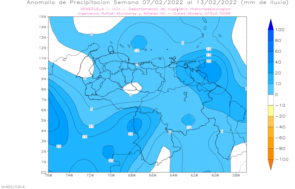 El modelo GFSV2 prevé en general eventos de precipitaciones dentro del promedio histórico, las anomalías positivas al este Amazonas y Táchira.