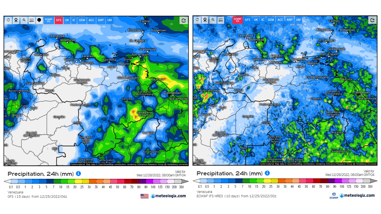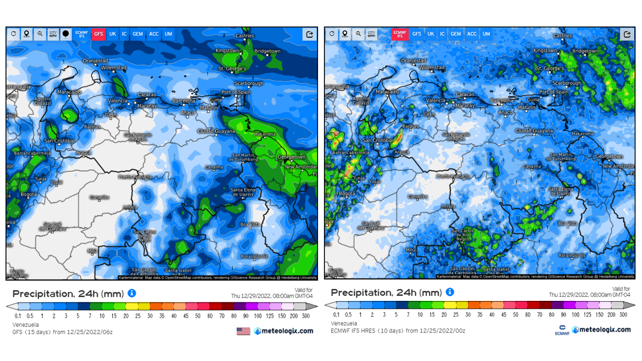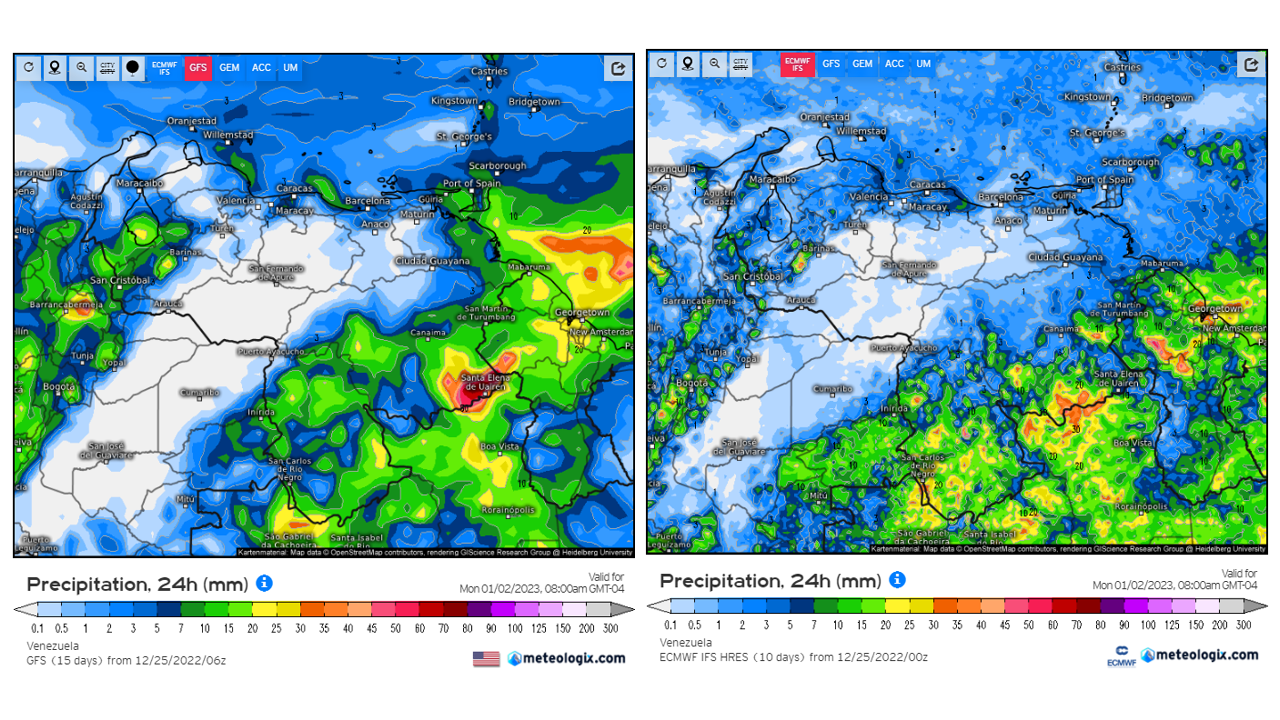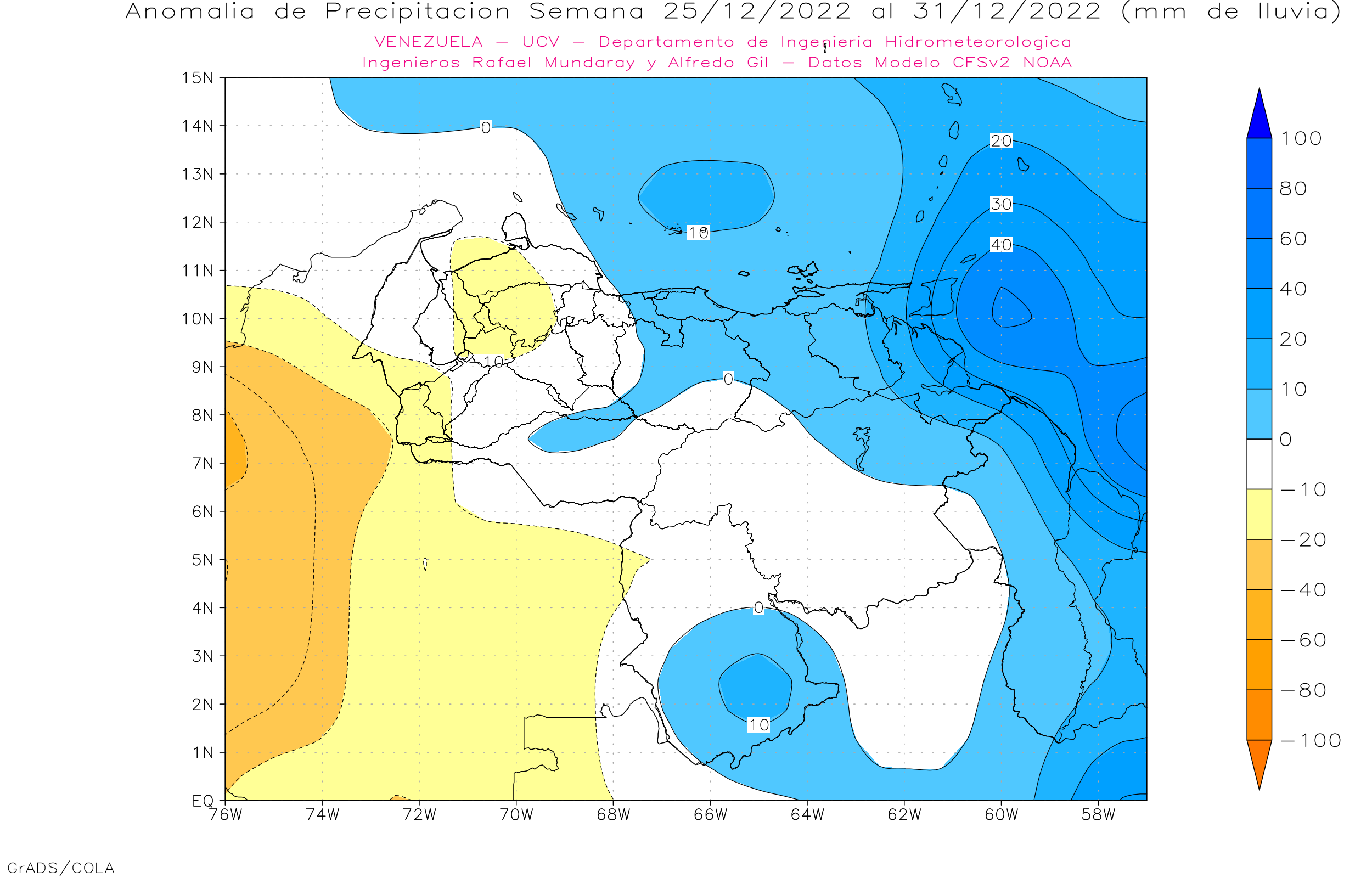 Pronostico de Anomalías Semanales para Venezuela, del 25/12/2022 al 21/01/2023, usando datos del Modelo CFSv2 de NOAA y ECMWF.