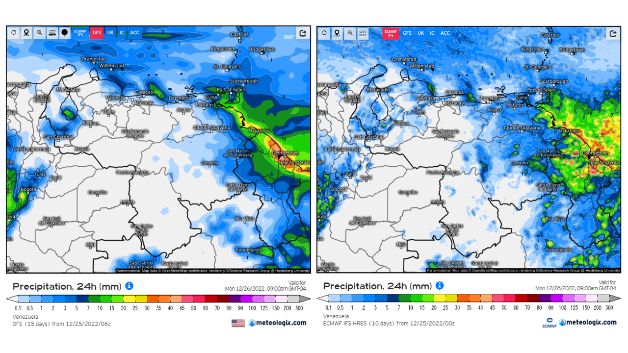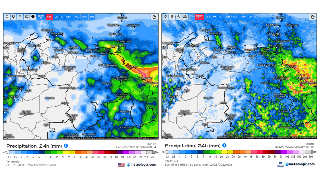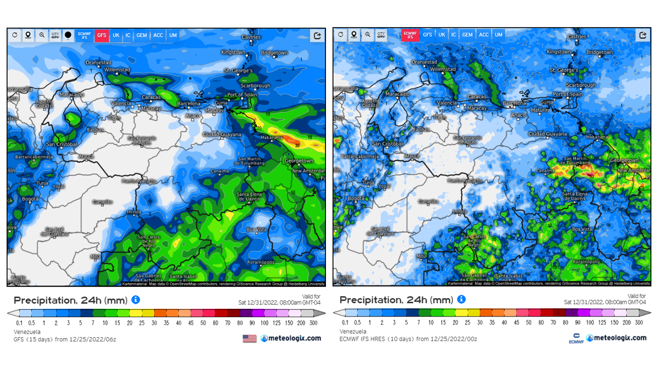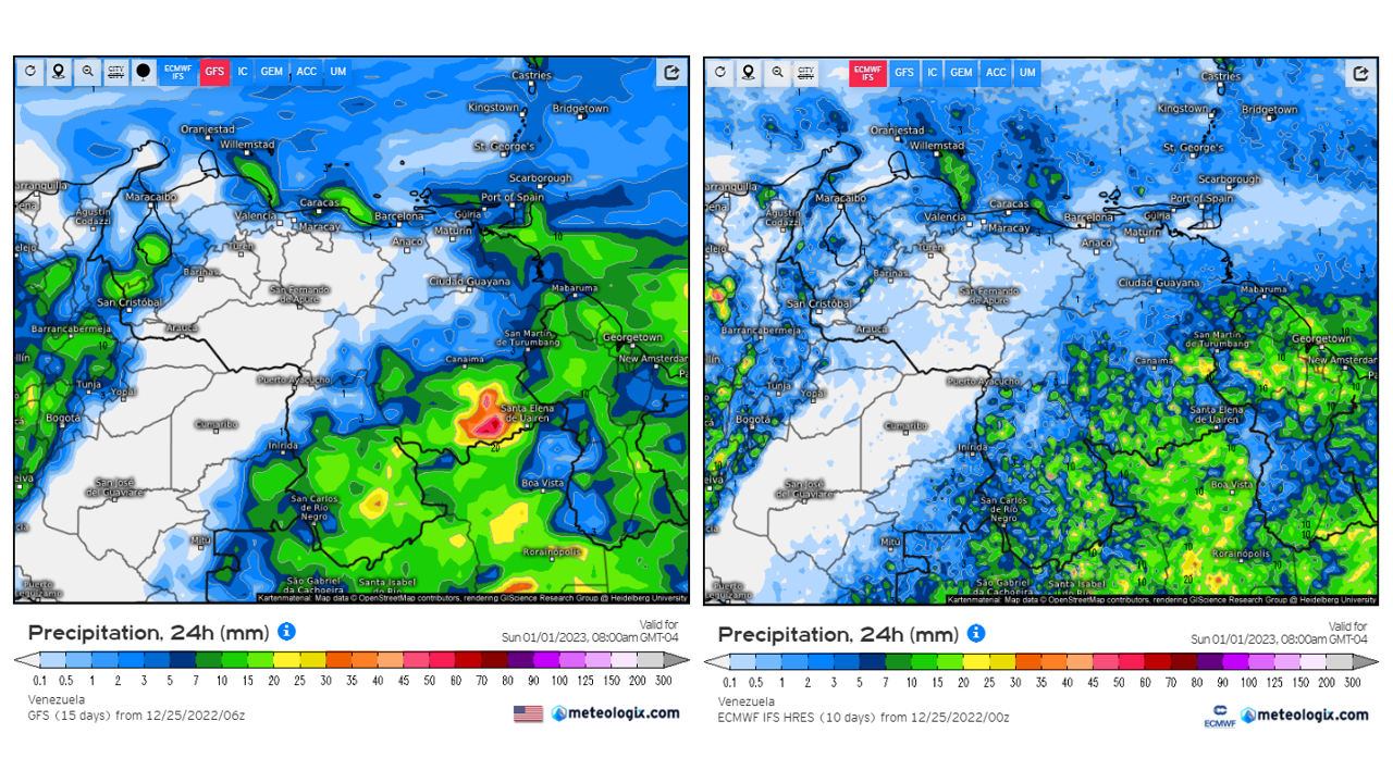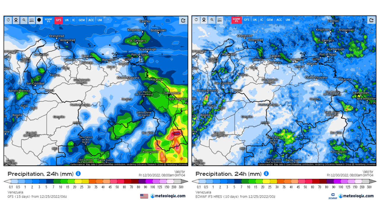 Pronostico de Anomalías Semanales para Venezuela, del 25/12/2022 al 21/01/2023, usando datos del Modelo CFSv2 de NOAA y ECMWF.