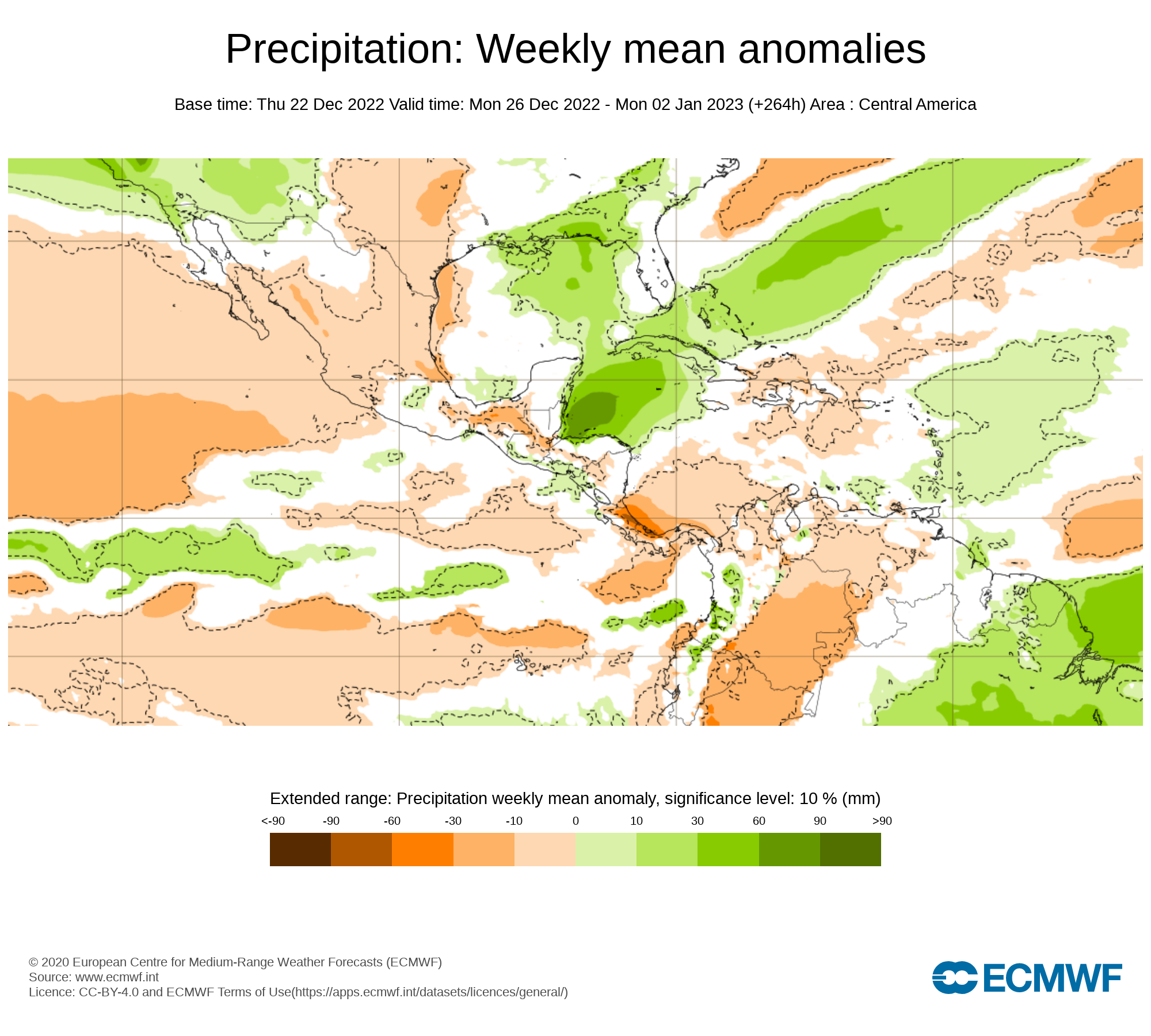 El pronostico semanal emitido por European Centre for Medium-Range Weather Forecast (ECMWF), se esperan eventos de precipitaciones promedio sobre el territorio nacional. Las anomalías postivas mas importantes en los andes, Zulia, oeste de los estados Falcón y Lara.