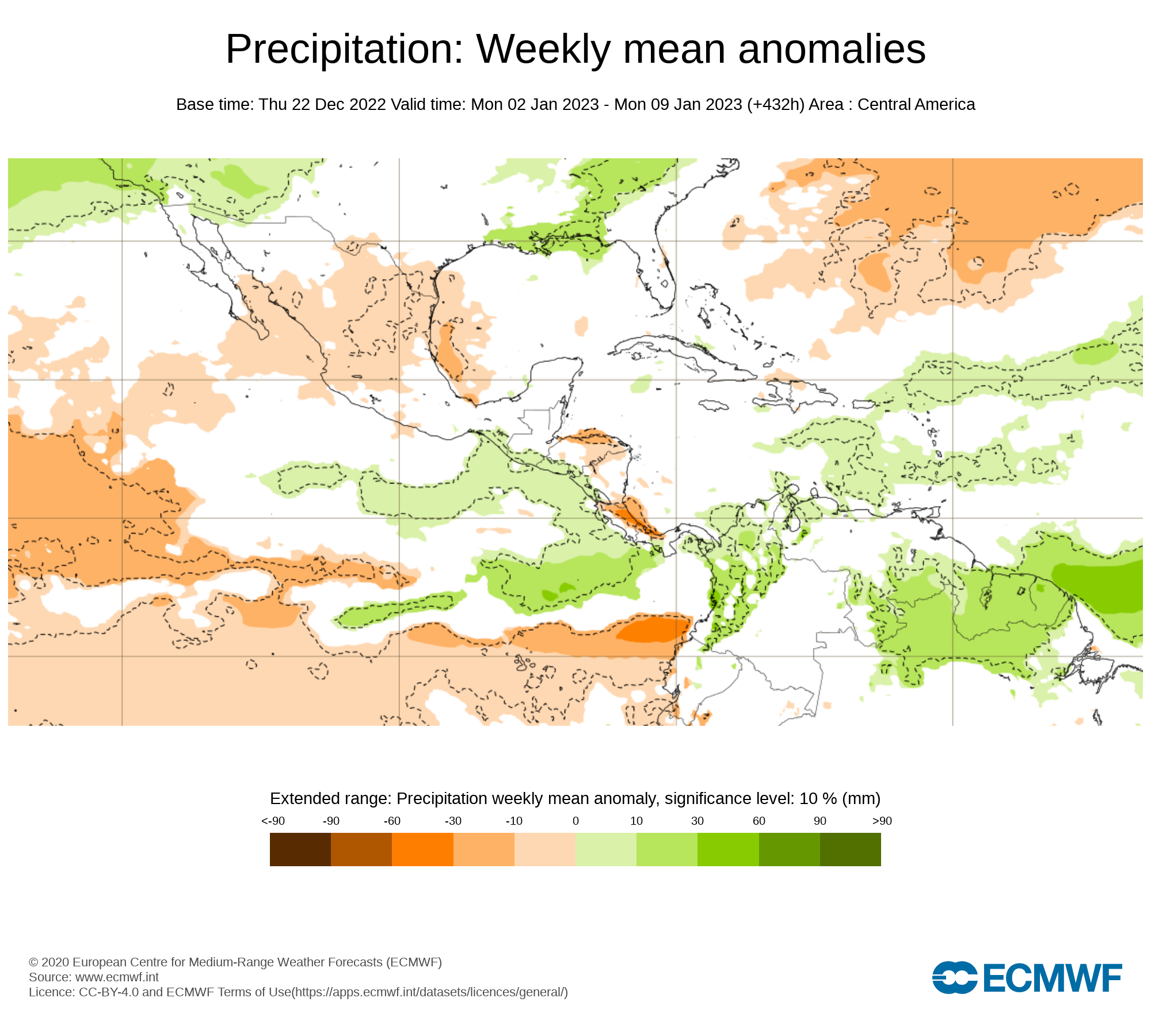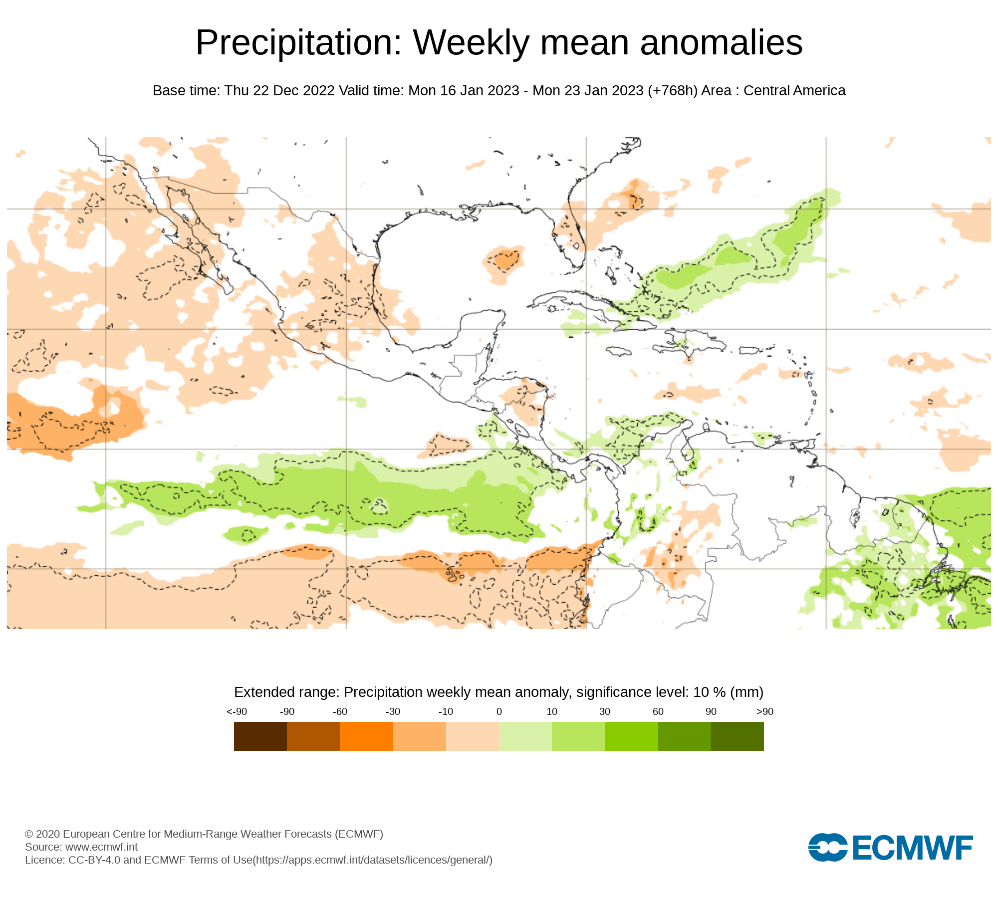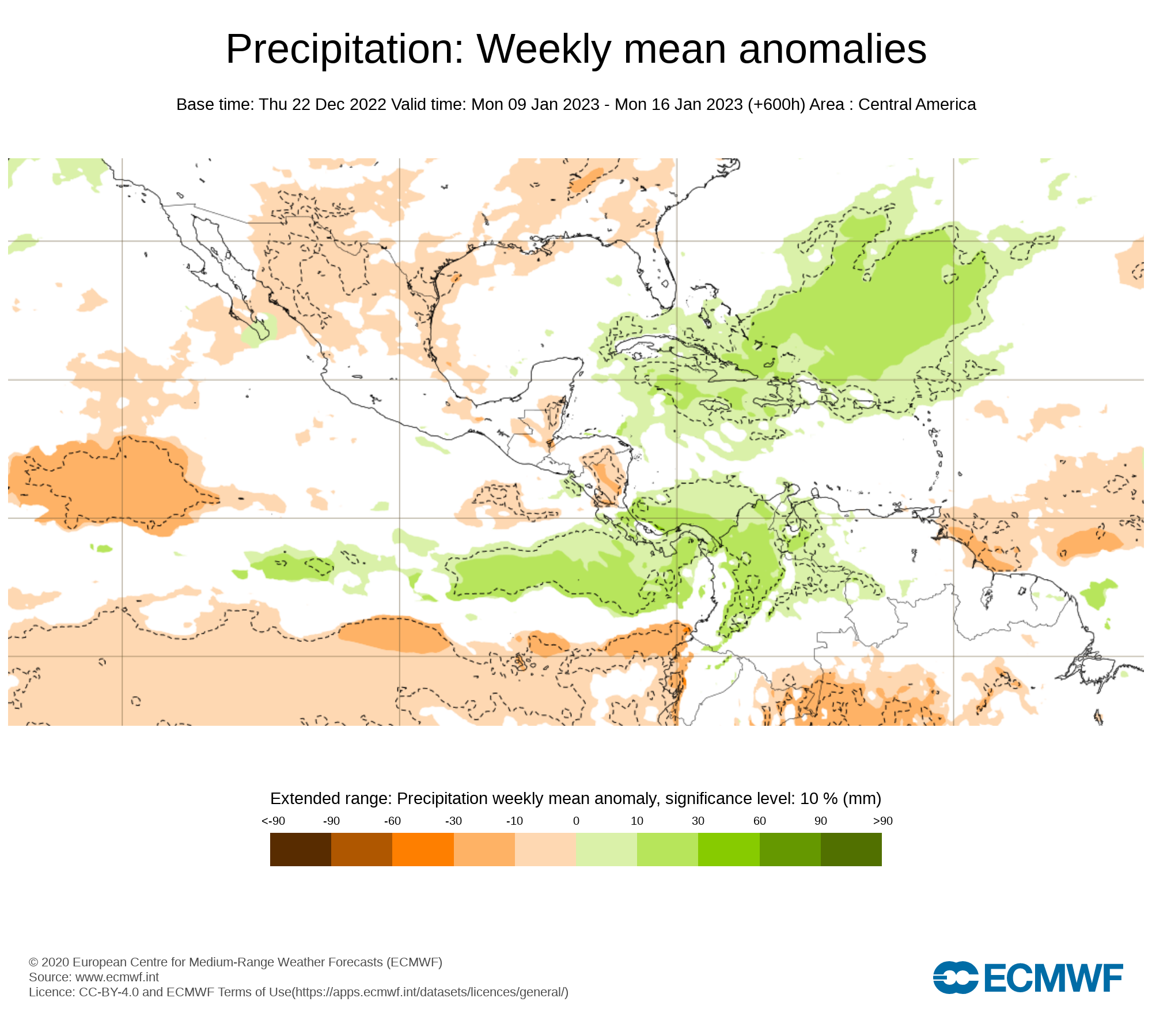 El pronostico semanal emitido por European Centre for Medium-Range Weather Forecast (ECMWF), se esperan eventos de precipitaciones promedio sobre el territorio nacional., con anomalías negativas en los llanos occidentales.
