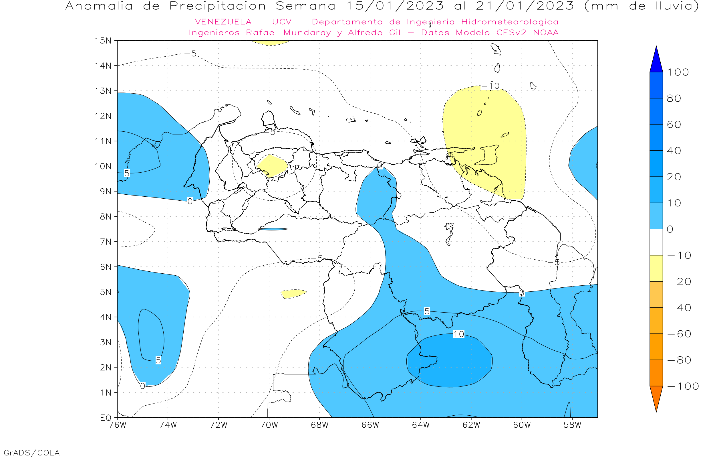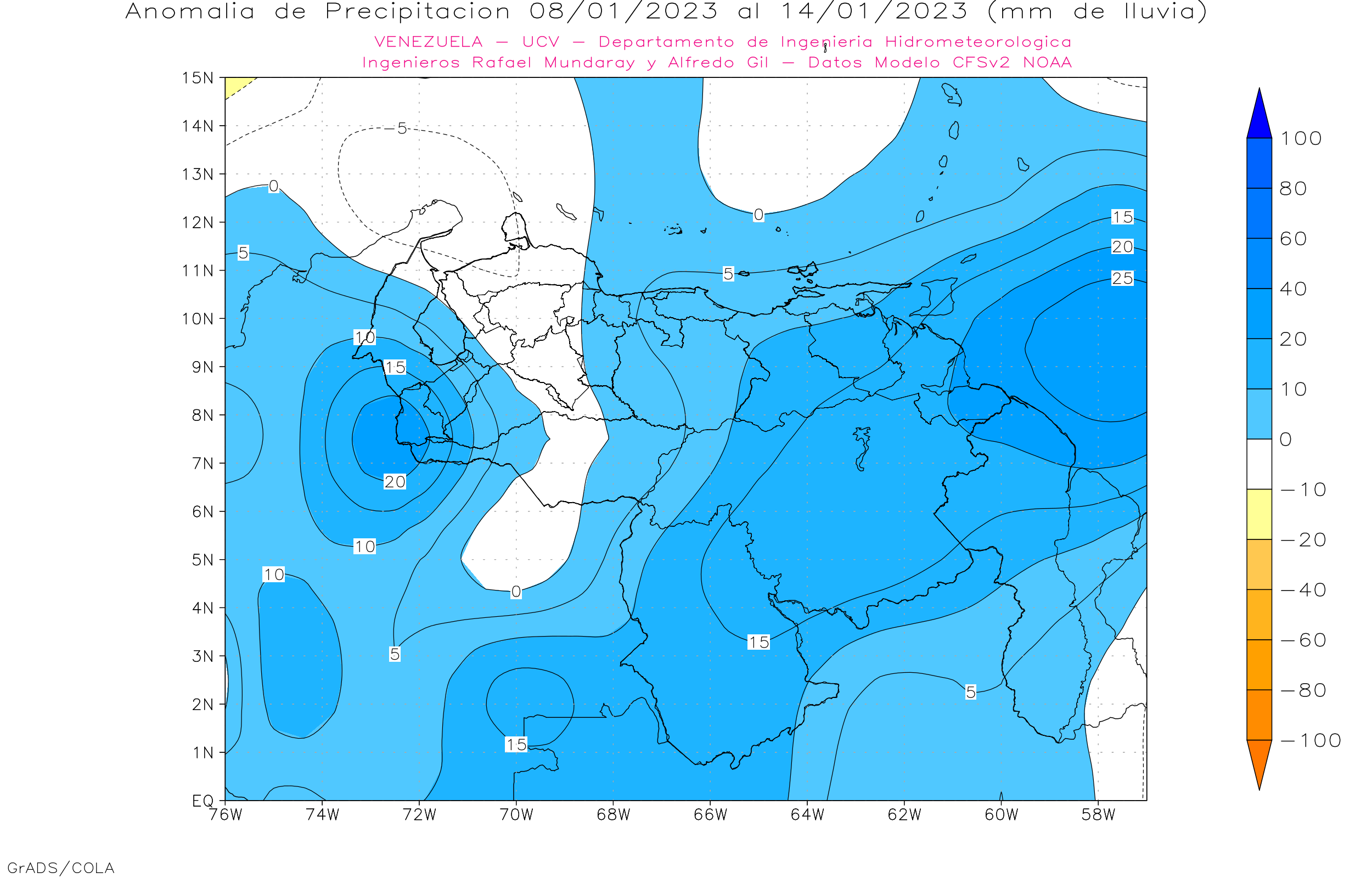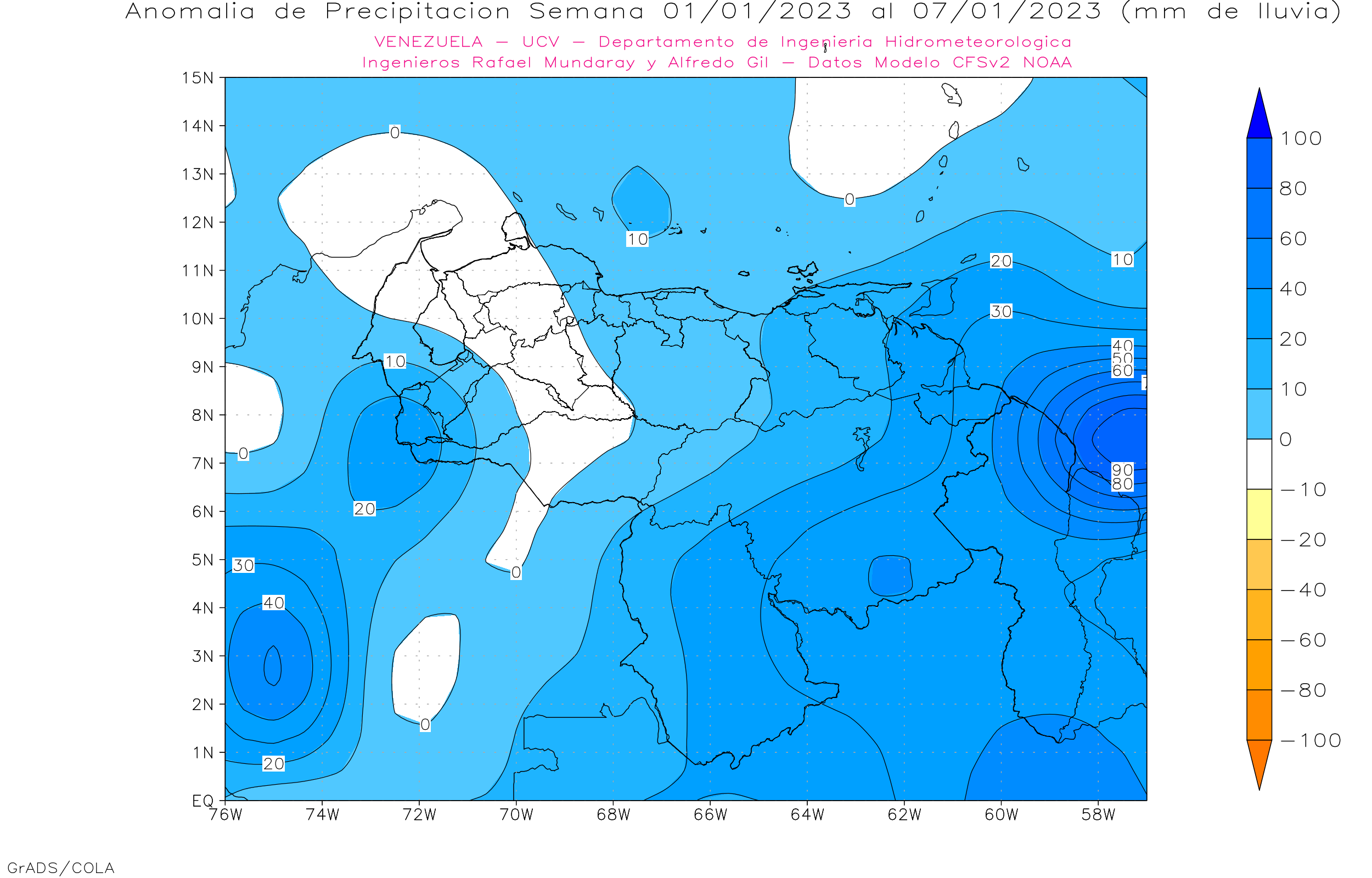 El modelo GFSv2 prevé en general eventos de precipitaciones dentro del promedio histórico en casi todo el territorio nacional. Anomalías positivas al este del Delta Amacuro