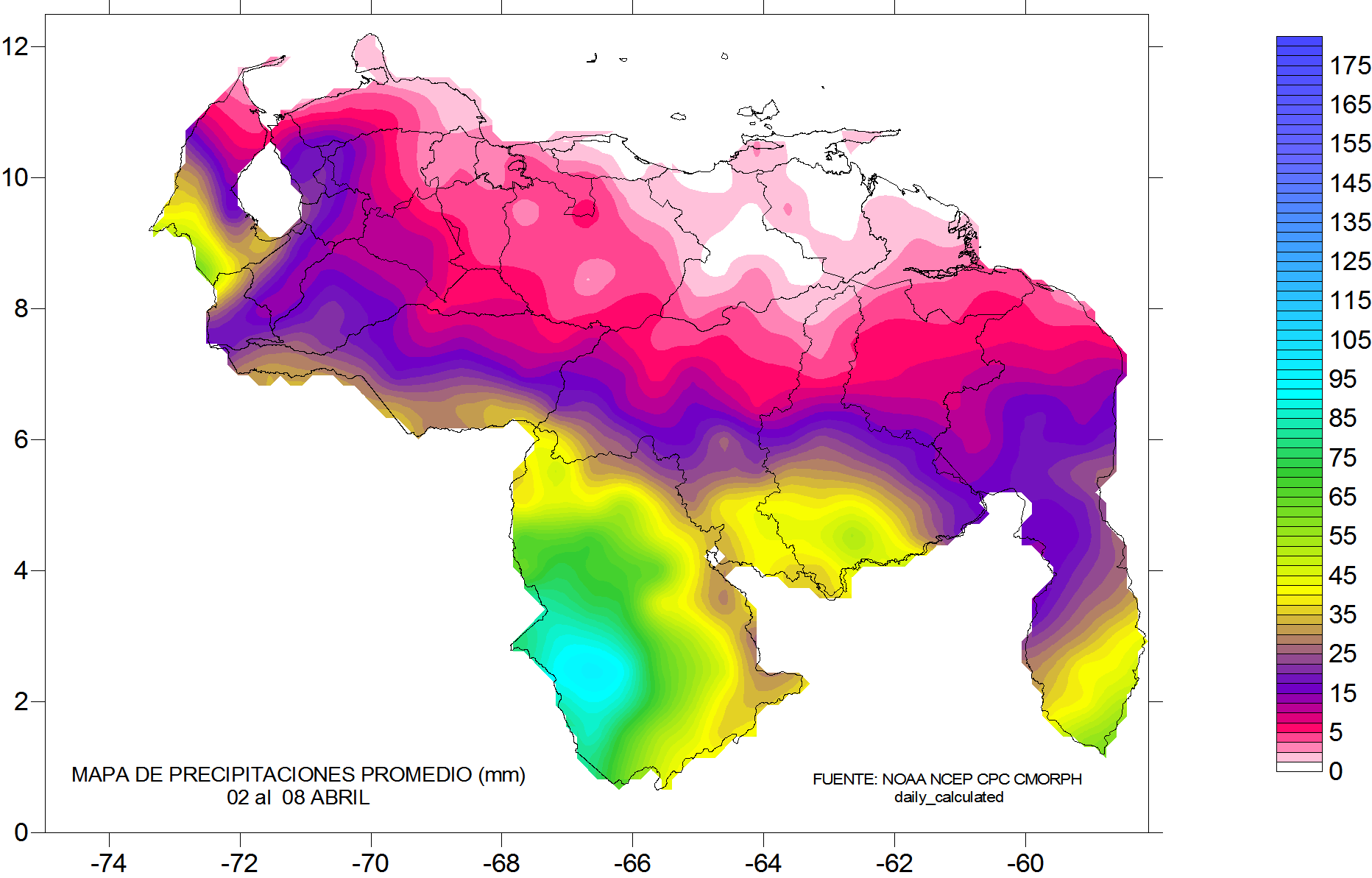 De acuerdo a la estadística de las precipitaciones estimadas para esta semana, se observa que los eventos más importantes se mantiene al sur del país, los centro de lluvias cercanos a 90 en el suroeste de Amazonas y 70 mm en el suroeste de Bolívar. Ya se observa que las lluvias por encima de los 30 mm se ubican al sur de 6° norte. Los llanos occidentales comienza a mostrar los primeros eventos de precipitaciones, la región central y oriental con valores cercanos a 5 mm. Oeste de Zulia con centro de lluvias de 70 mm, Ya se aprecia un incremento de las lluvias en varios sectores del país.