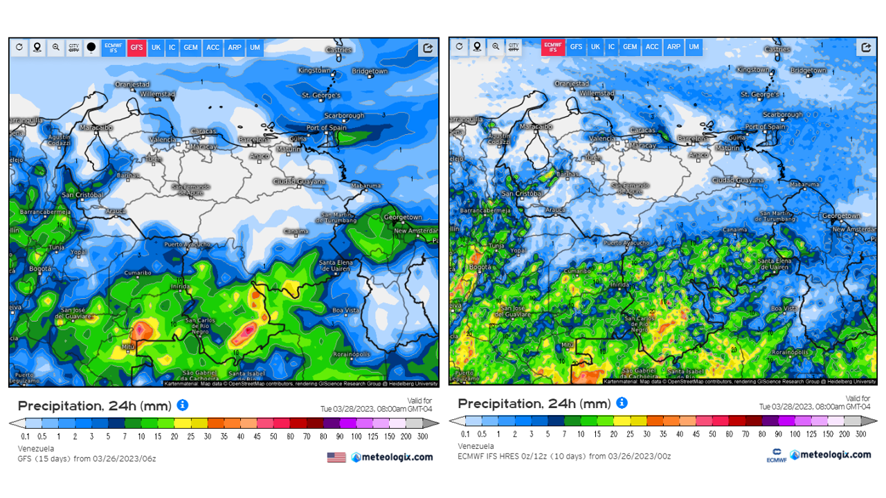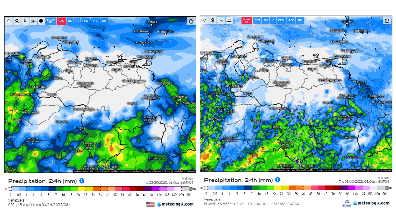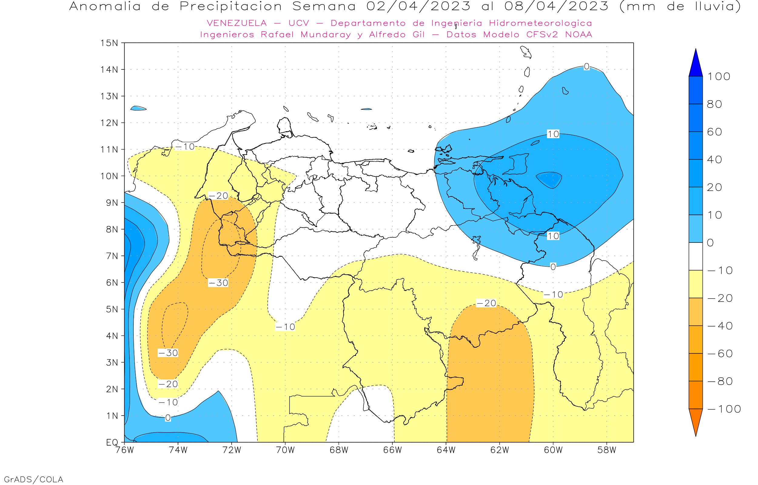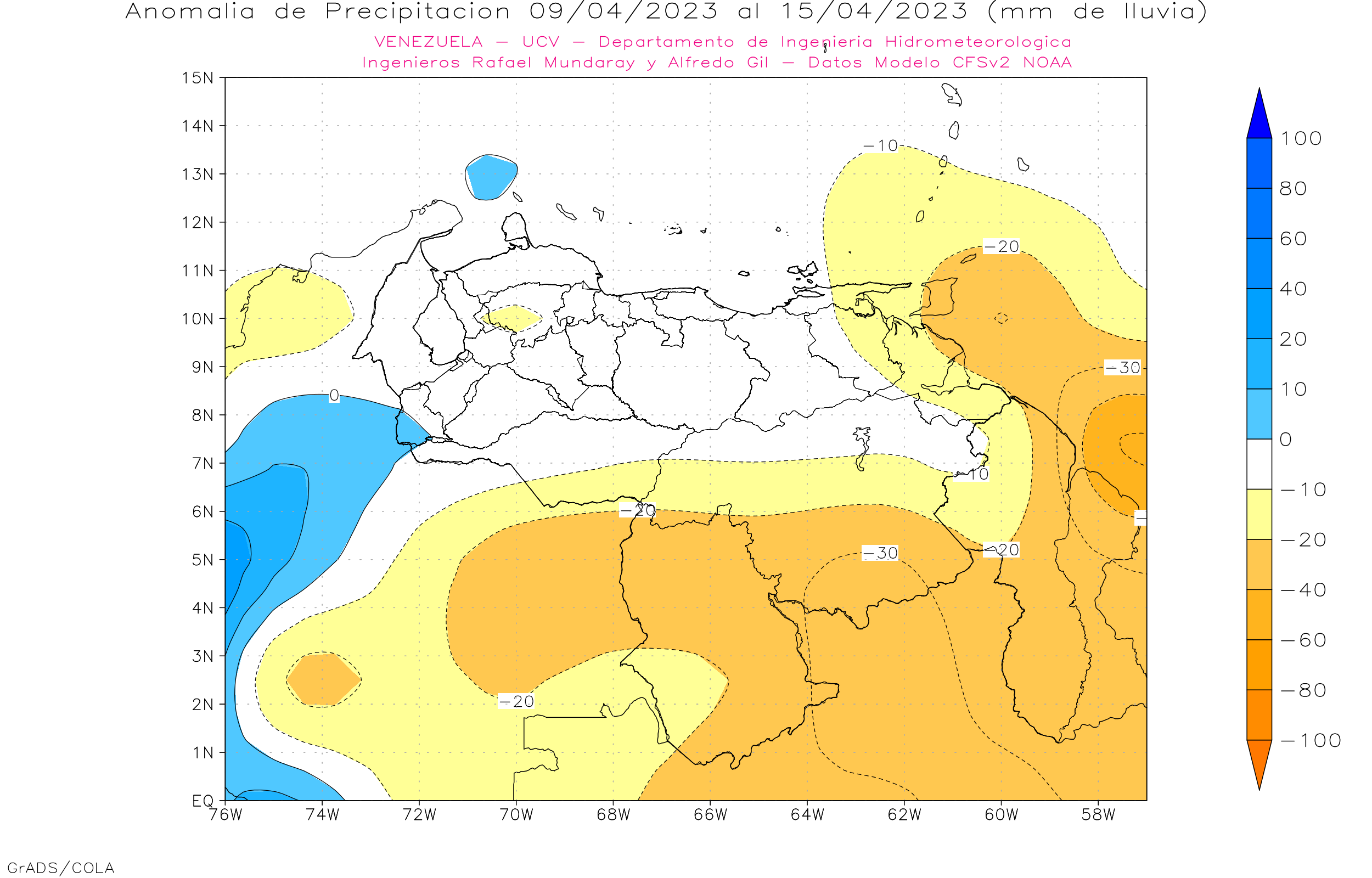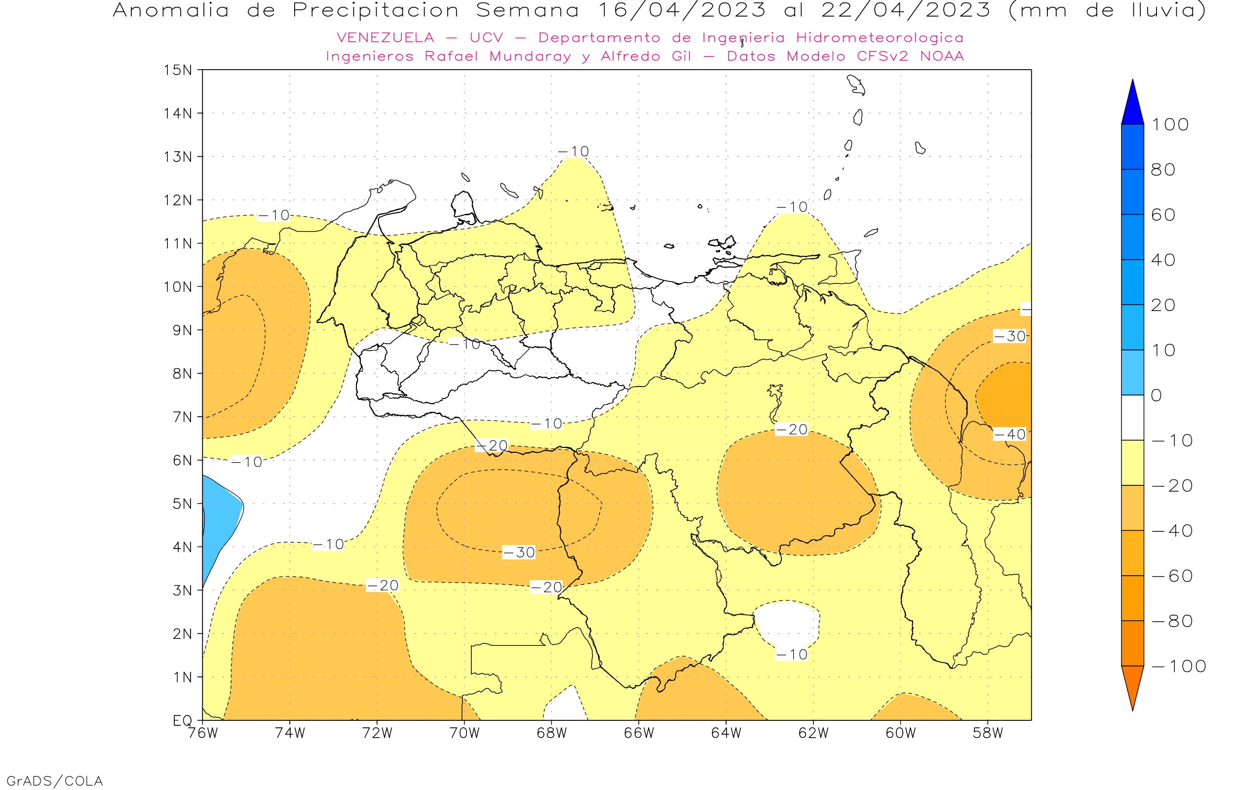 El modelo GFSv2 prevé en general eventos de precipitaciones dentro del promedio histórico en casi todo el territorio nacional, con anomalís negativas al sur de Bolívar, Táchira, sur de Zulia y Mérida.