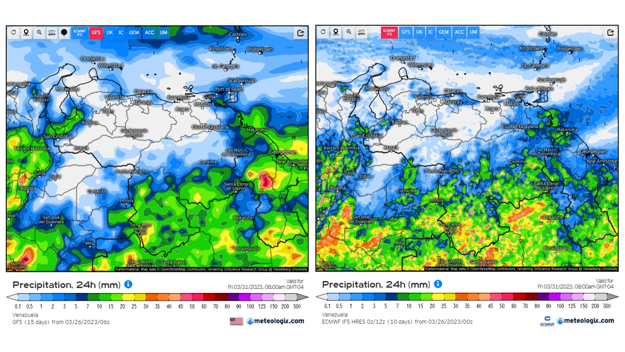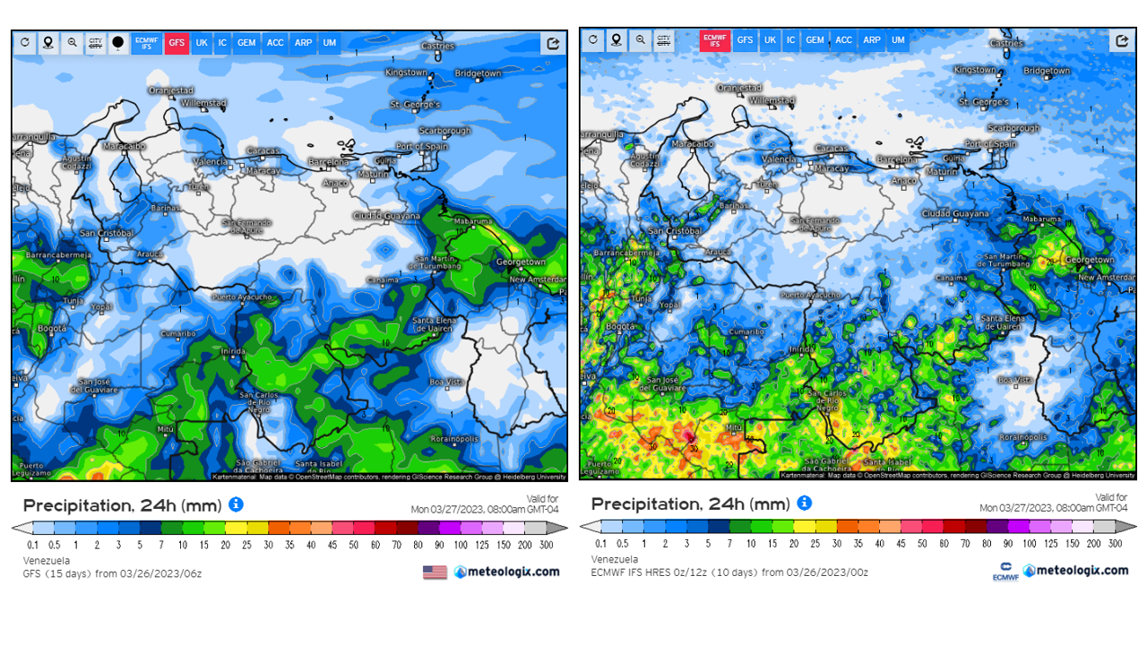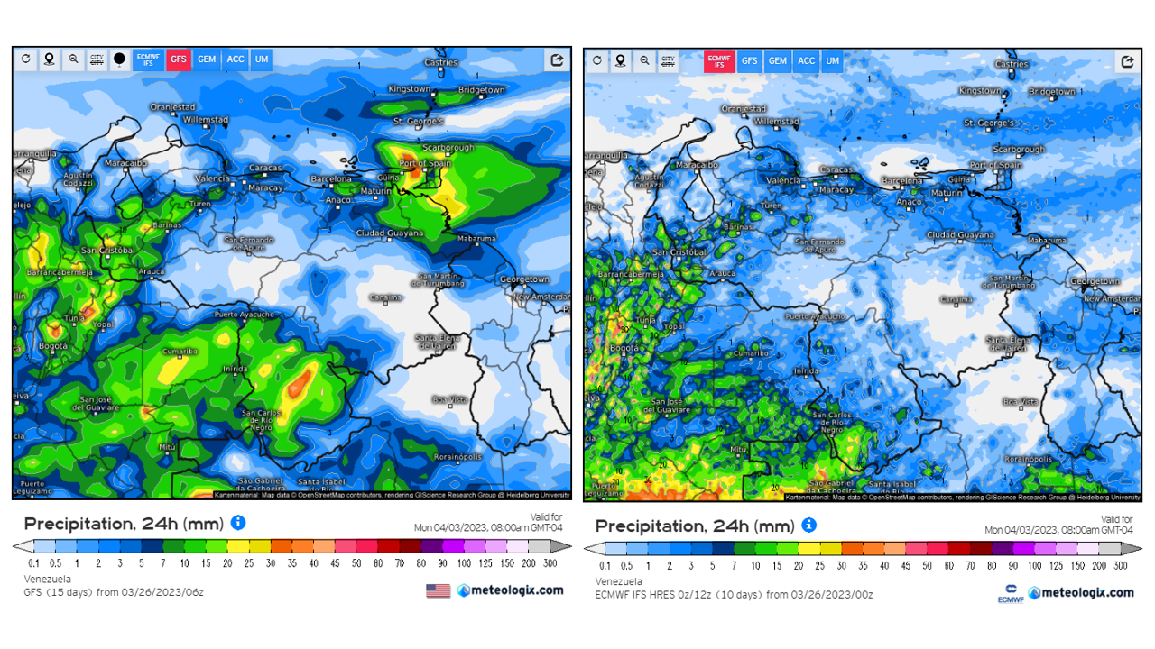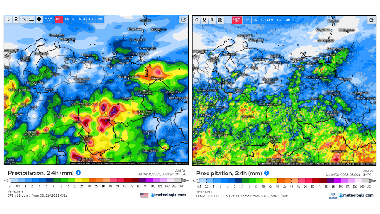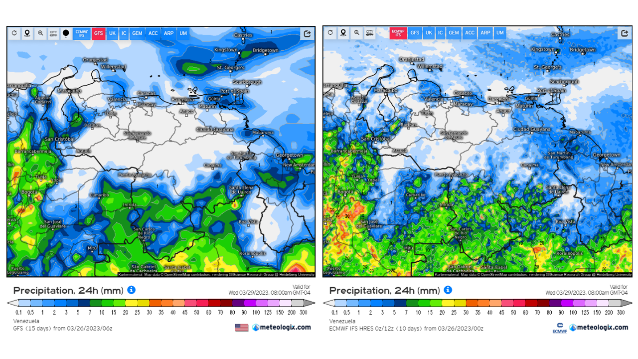 El modelo GFSv2 prevé en general eventos de precipitaciones dentro del promedio histórico en casi todo el territorio nacional, con anomalís negativas al sur de Bolívar, Táchira, sur de Zulia y Mérida.
