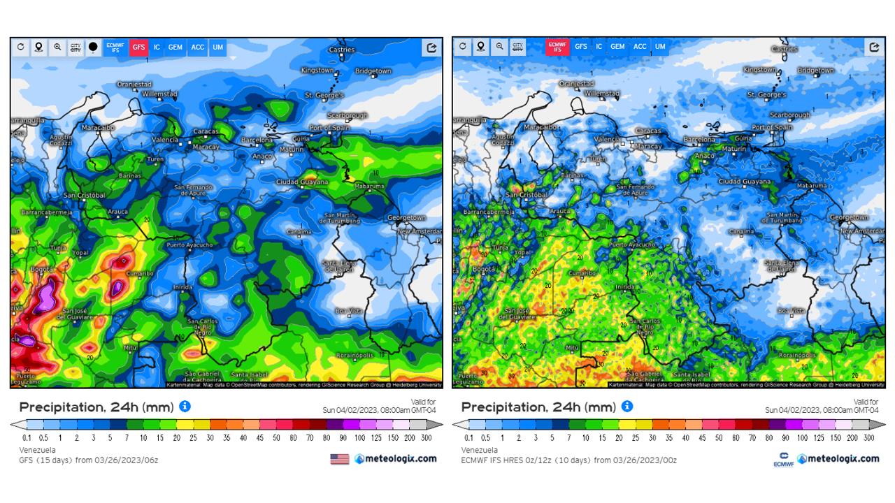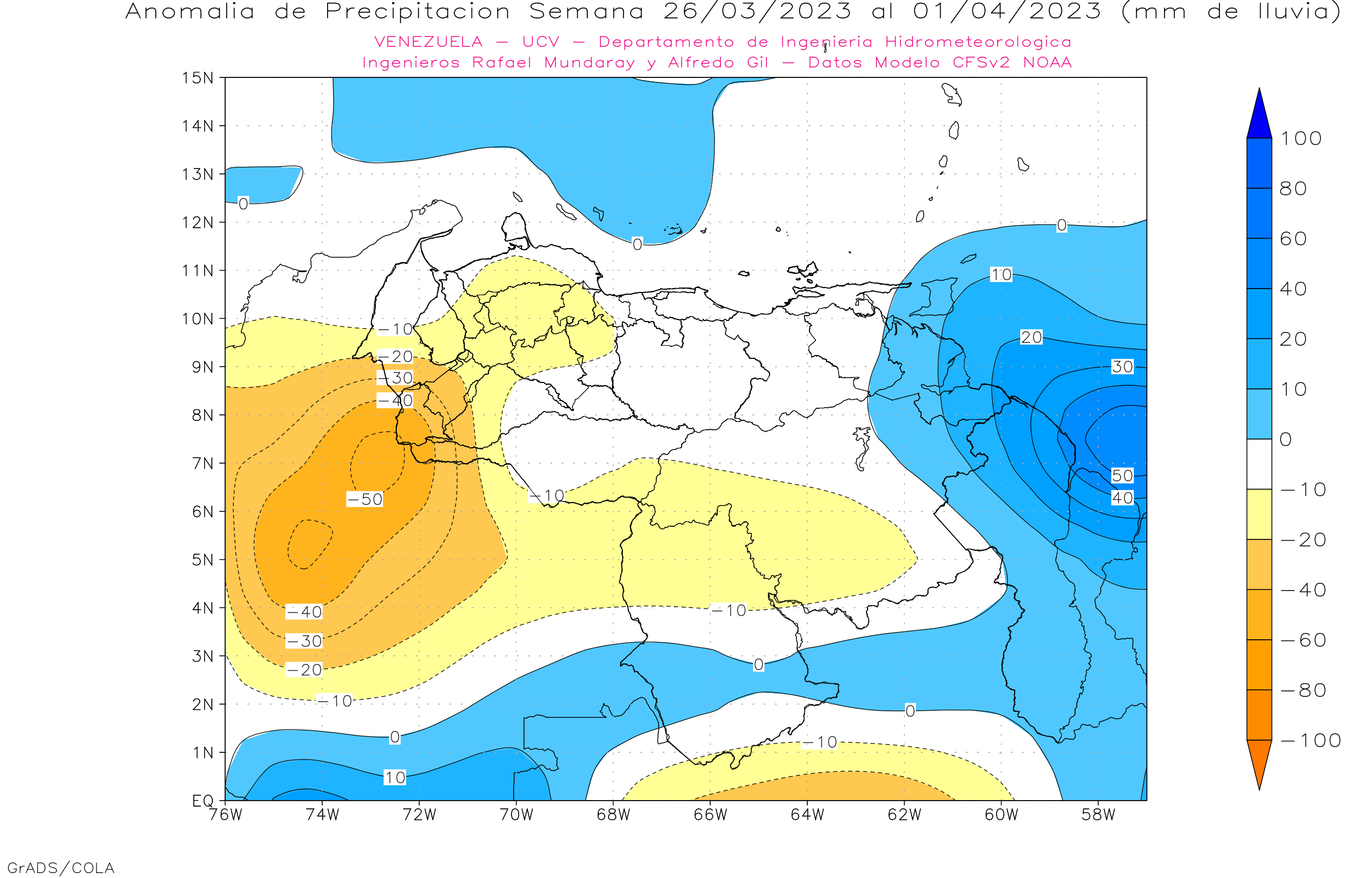 Pronostico de Anomalías Semanales para Venezuela, del 26/03 al 22/04/2023, usando datos del Modelo CFSv2 de NOAA y ECMWF.