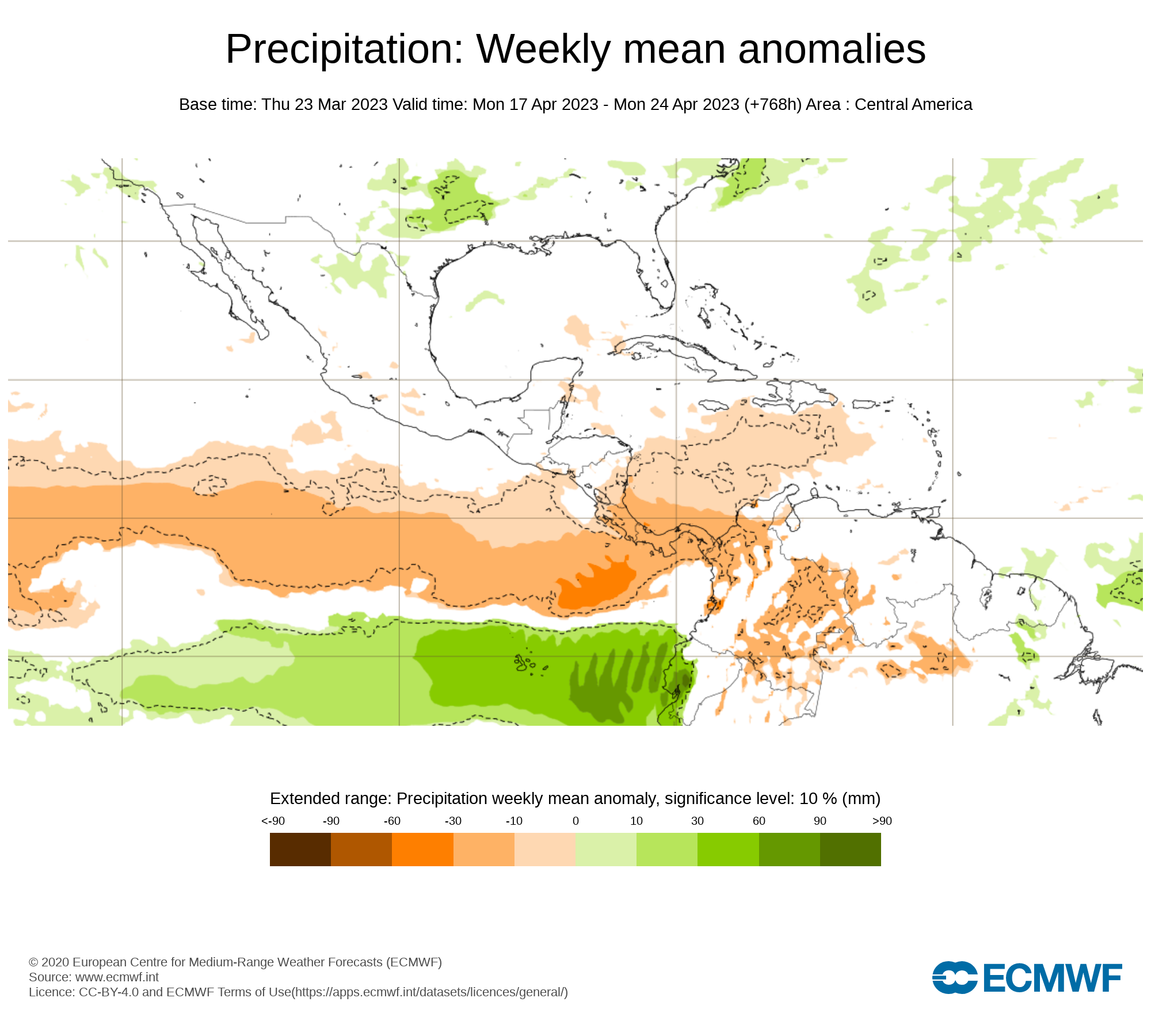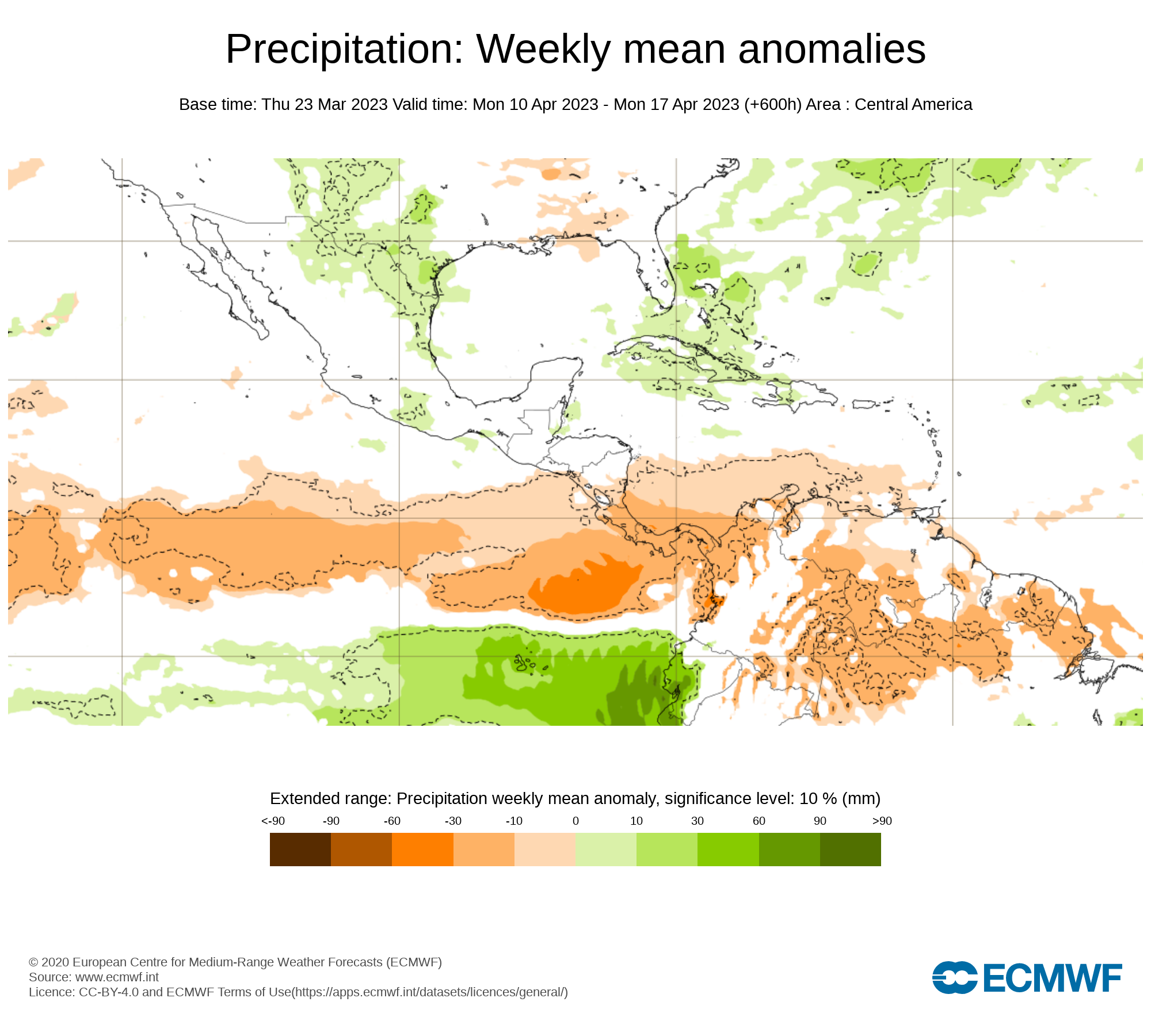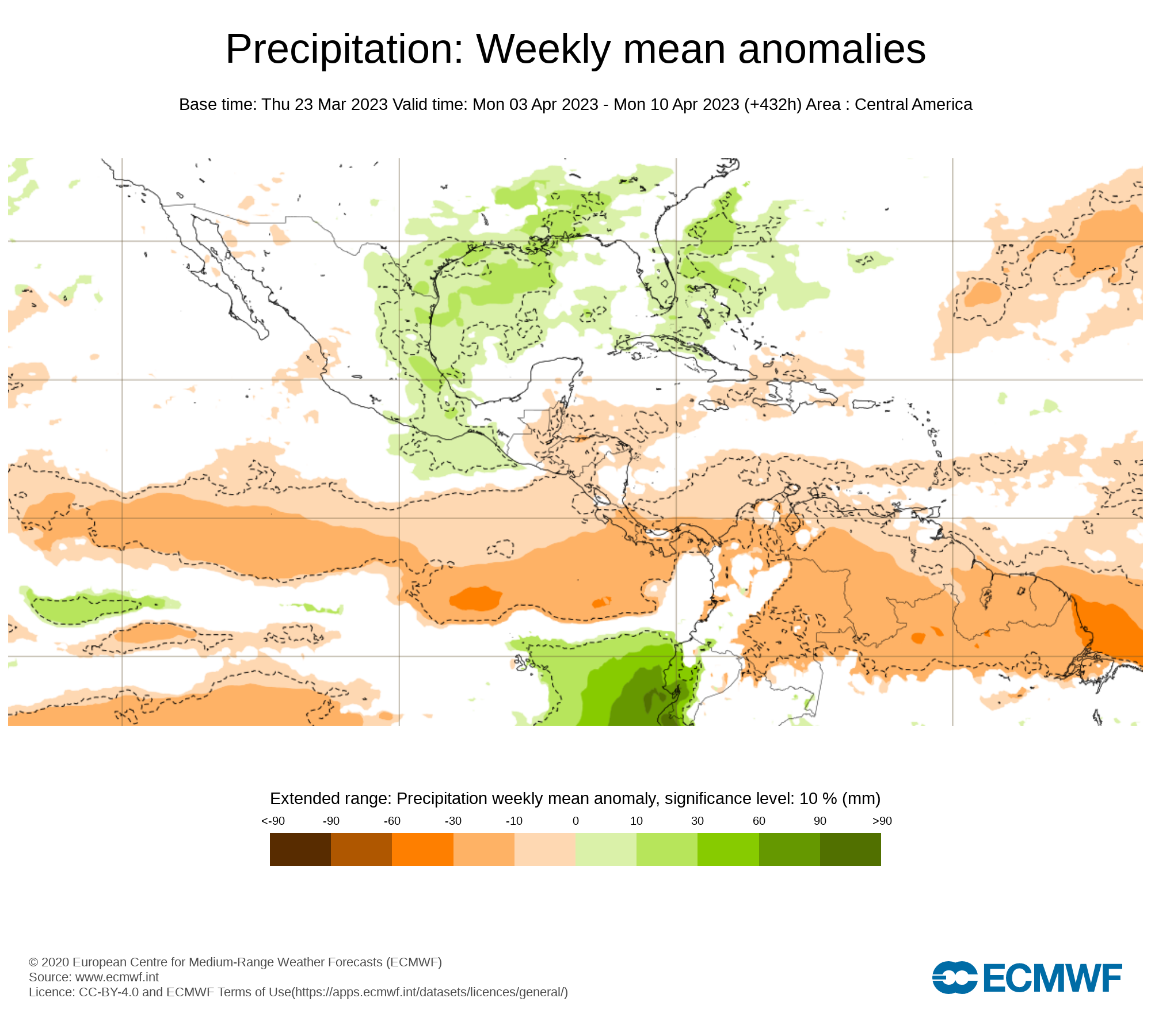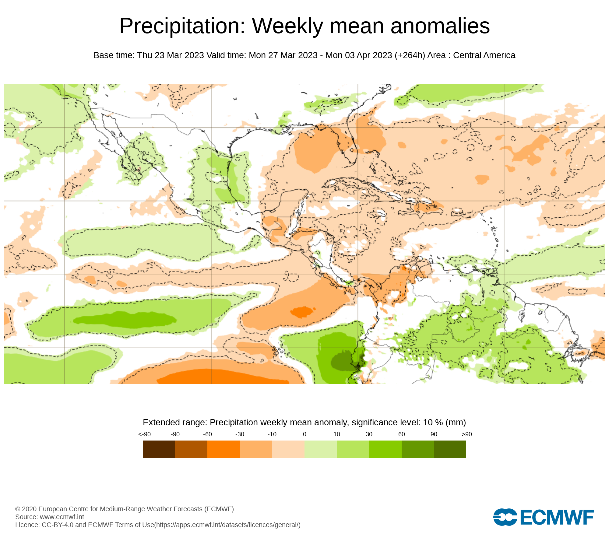 El pronostico semanal emitido por European Centre for Medium-Range Weather Forecast (ECMWF), se esperan eventos de precipitaciones promedio sobre el territorio nacional, con anomalías negativas al sur del país.