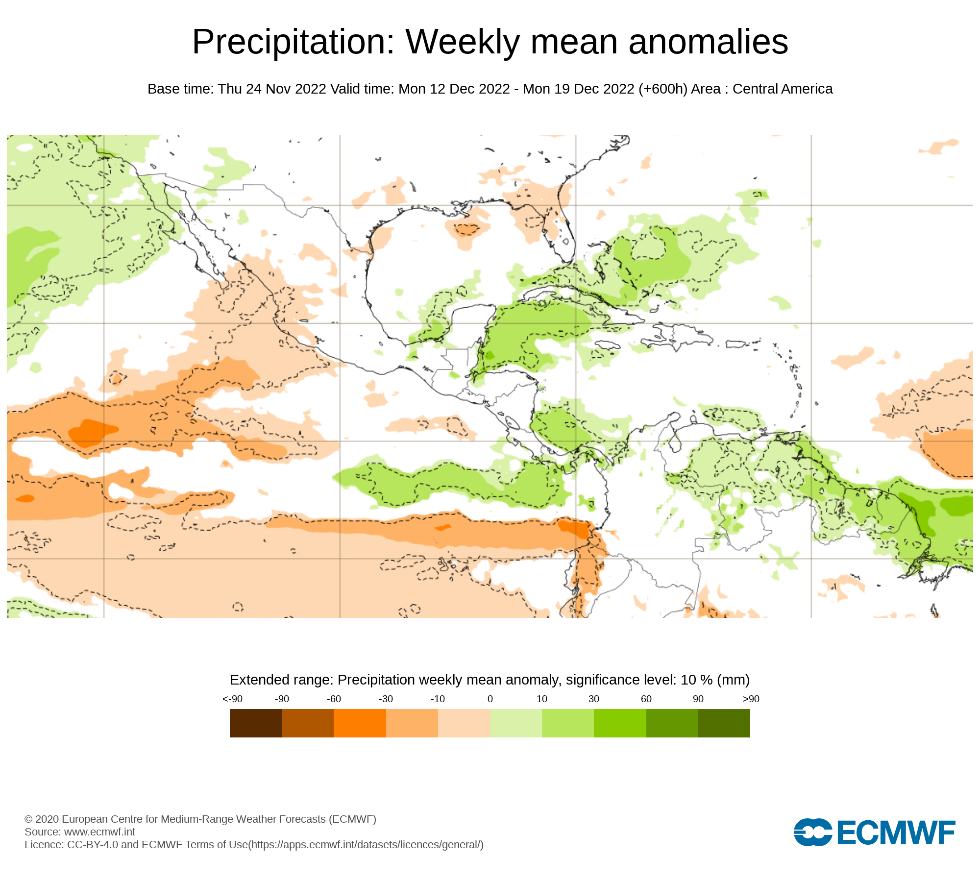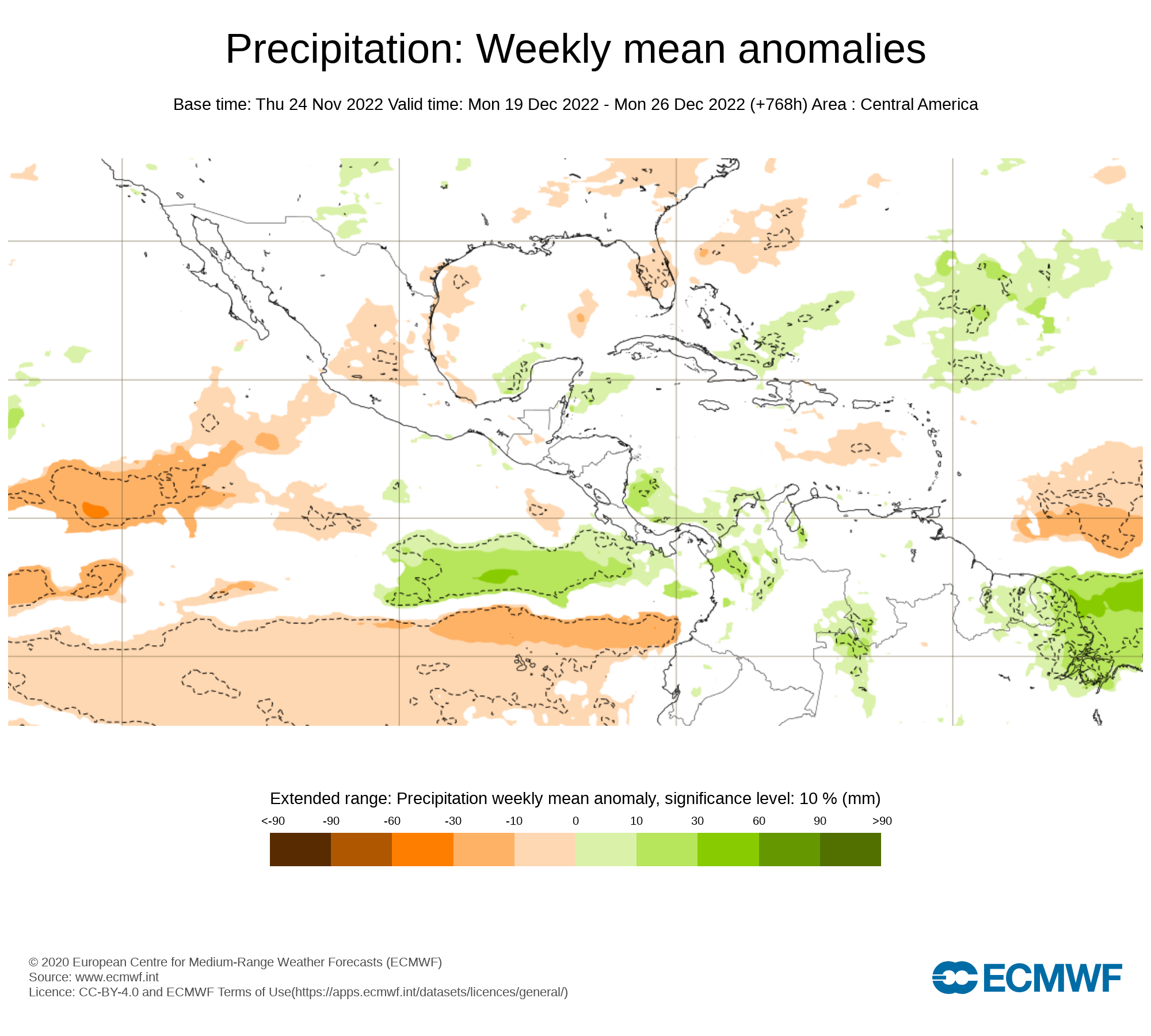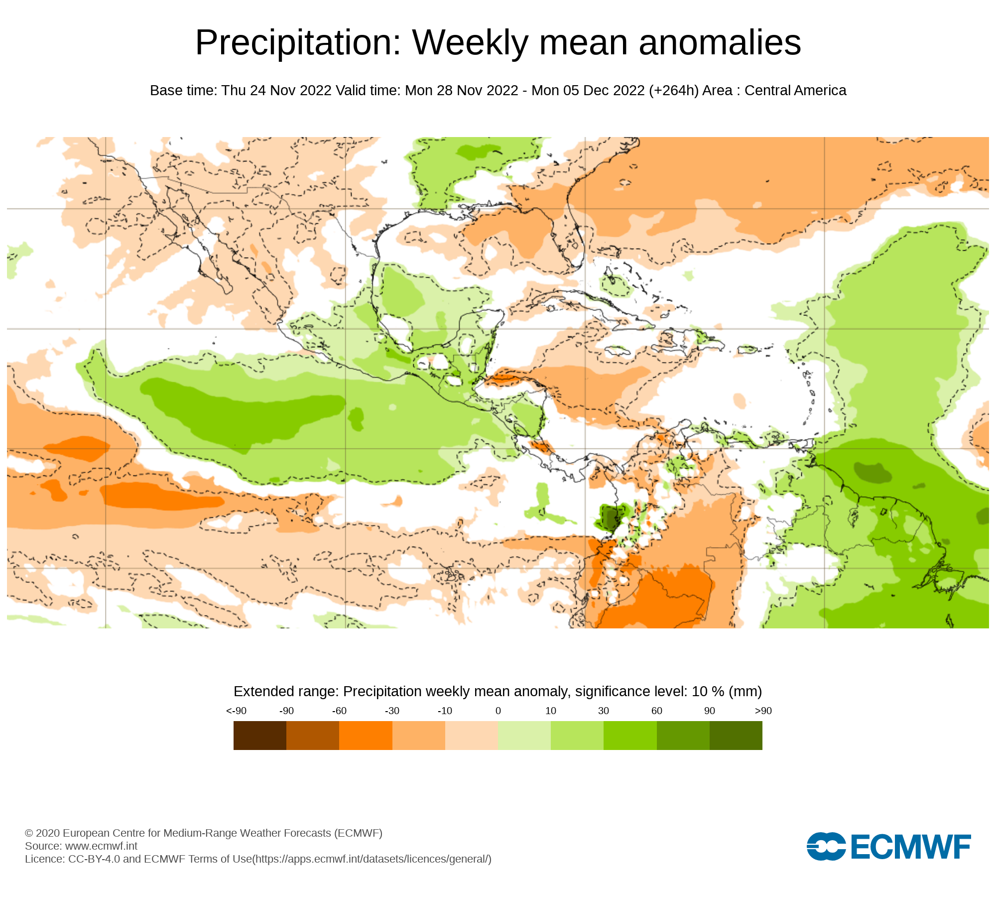 El pronostico semanal emitido por European Centre for Medium-Range Weather Forecast (ECMWF), se esperan eventos de precipitaciones promedio sobre el territorio nacional. Anomalías positivas al este de Bolívar.