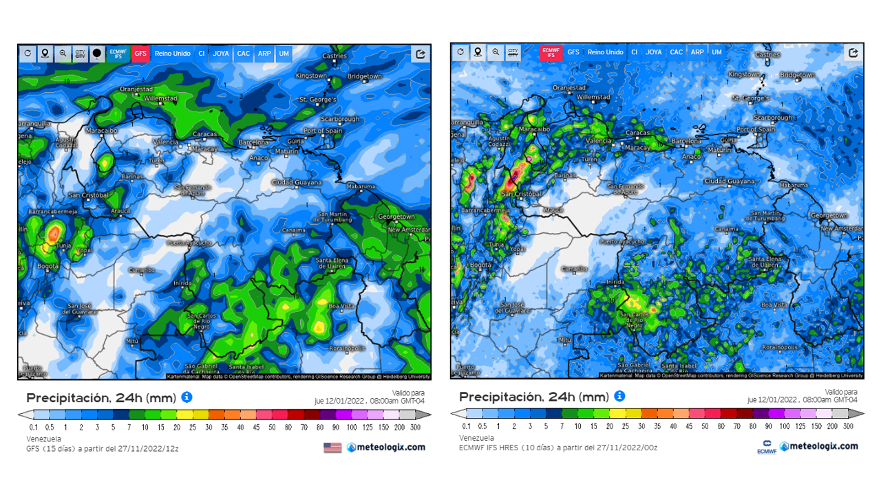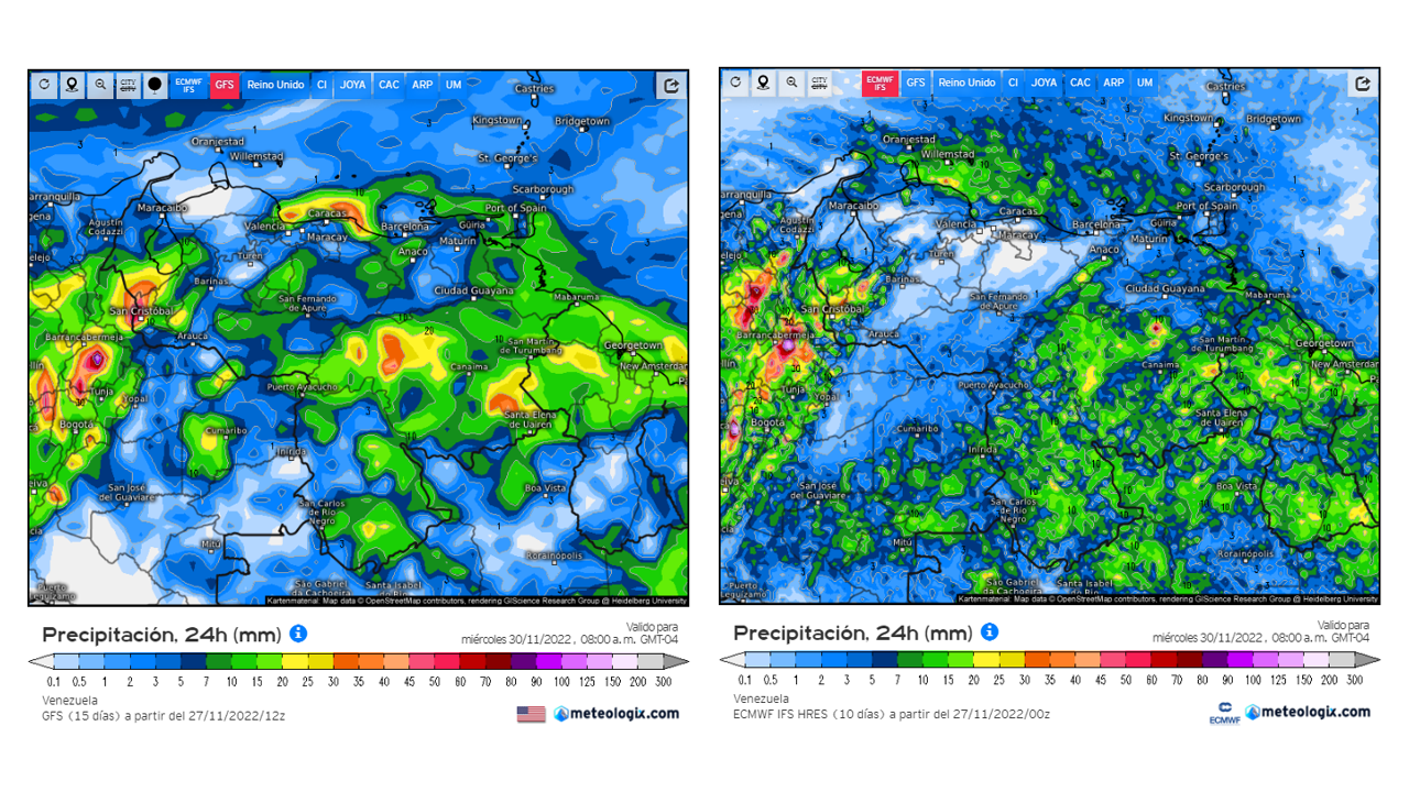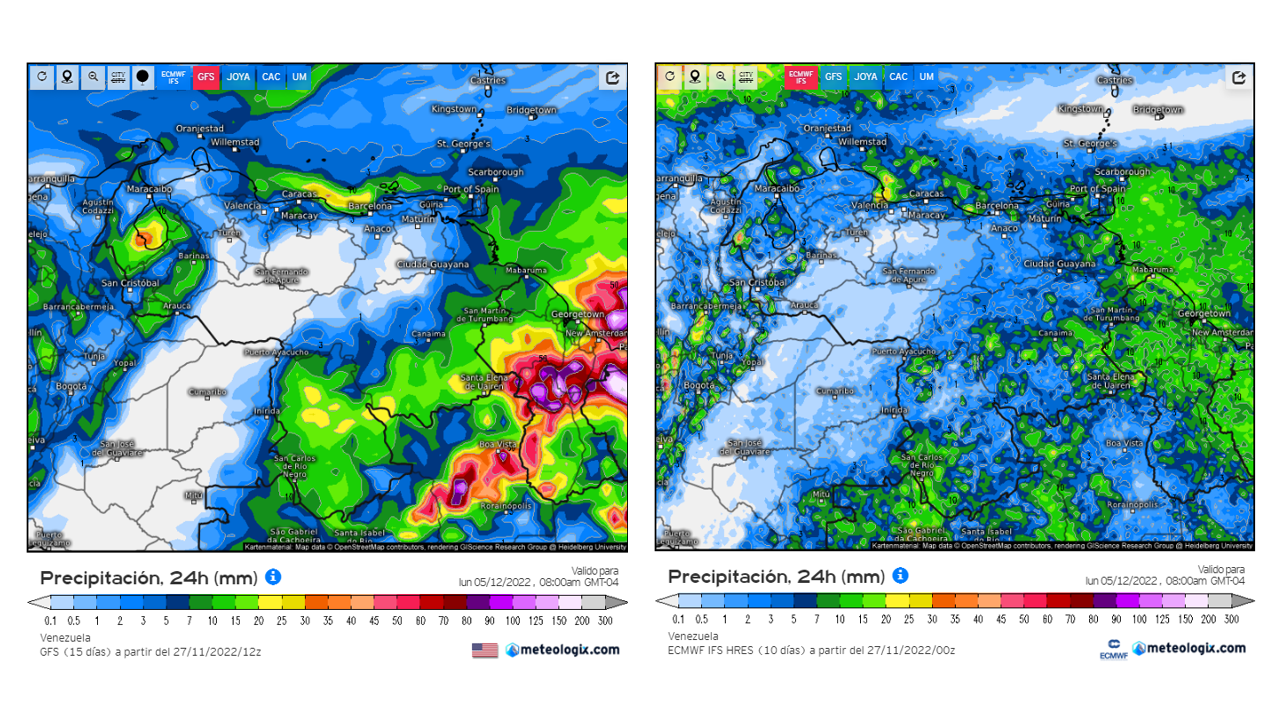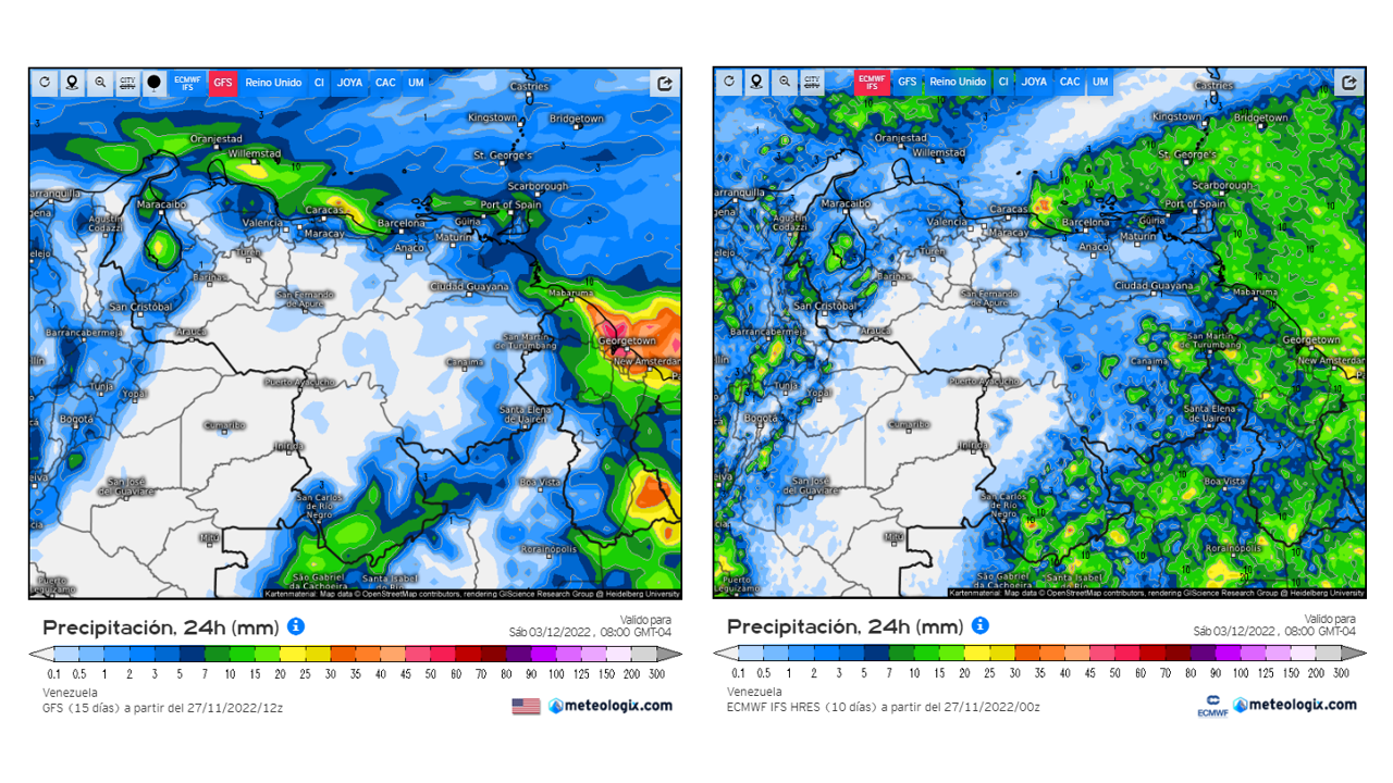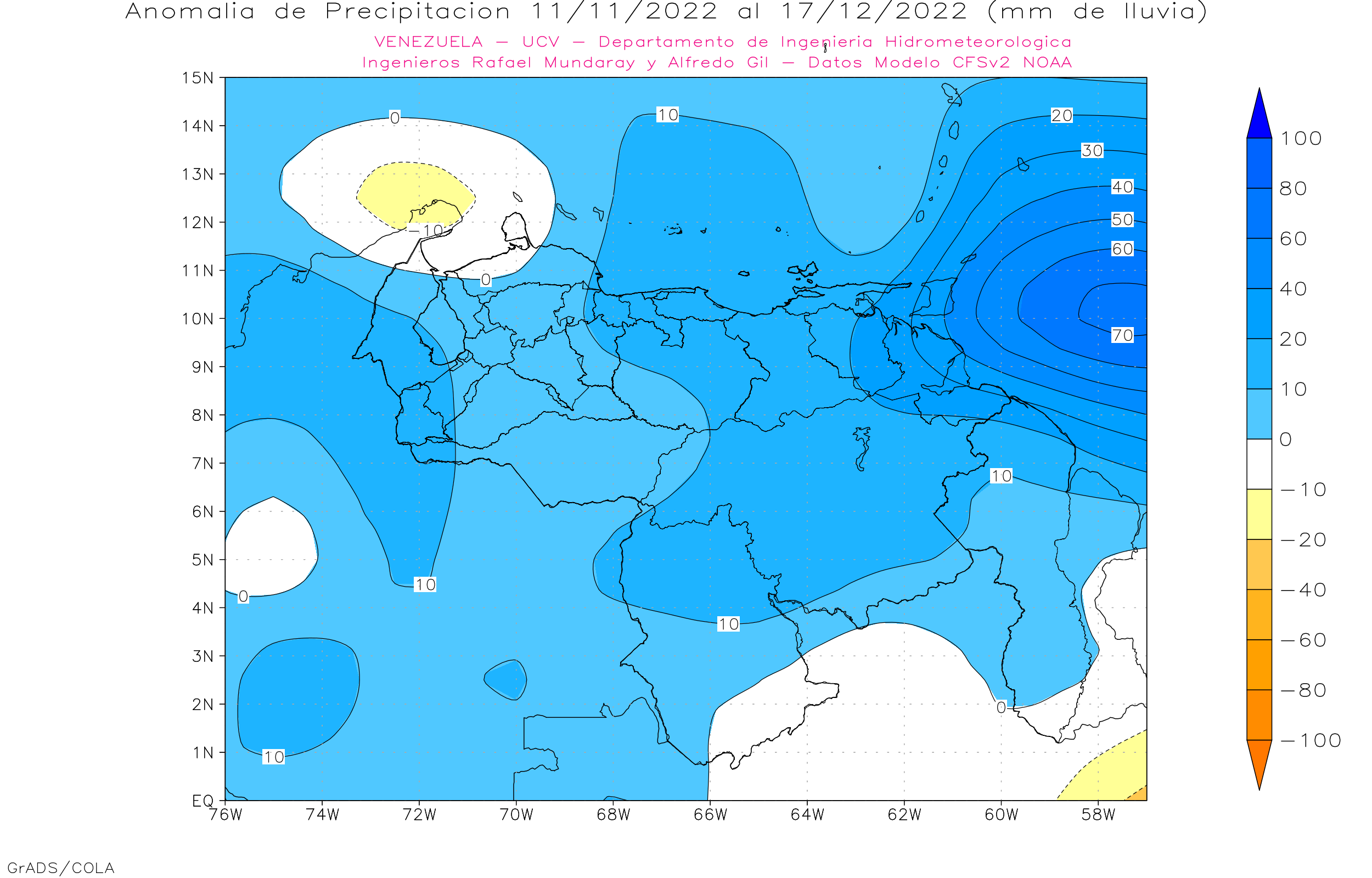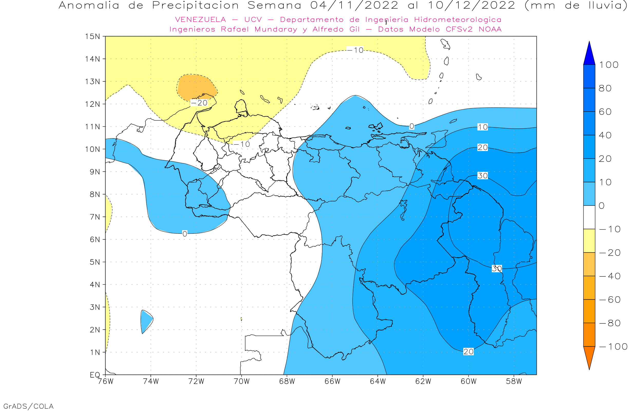 El modelo GFSv2 prevé en general eventos de precipitaciones dentro del promedio histórico en casi todo el territorio nacional. Las anomalías positivas mas importantes sobre el oriente, oeste de Bolívar y norte de Amazonas.