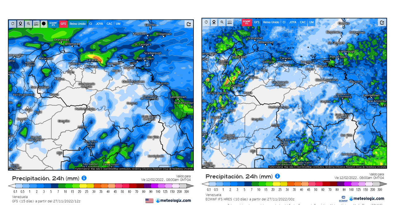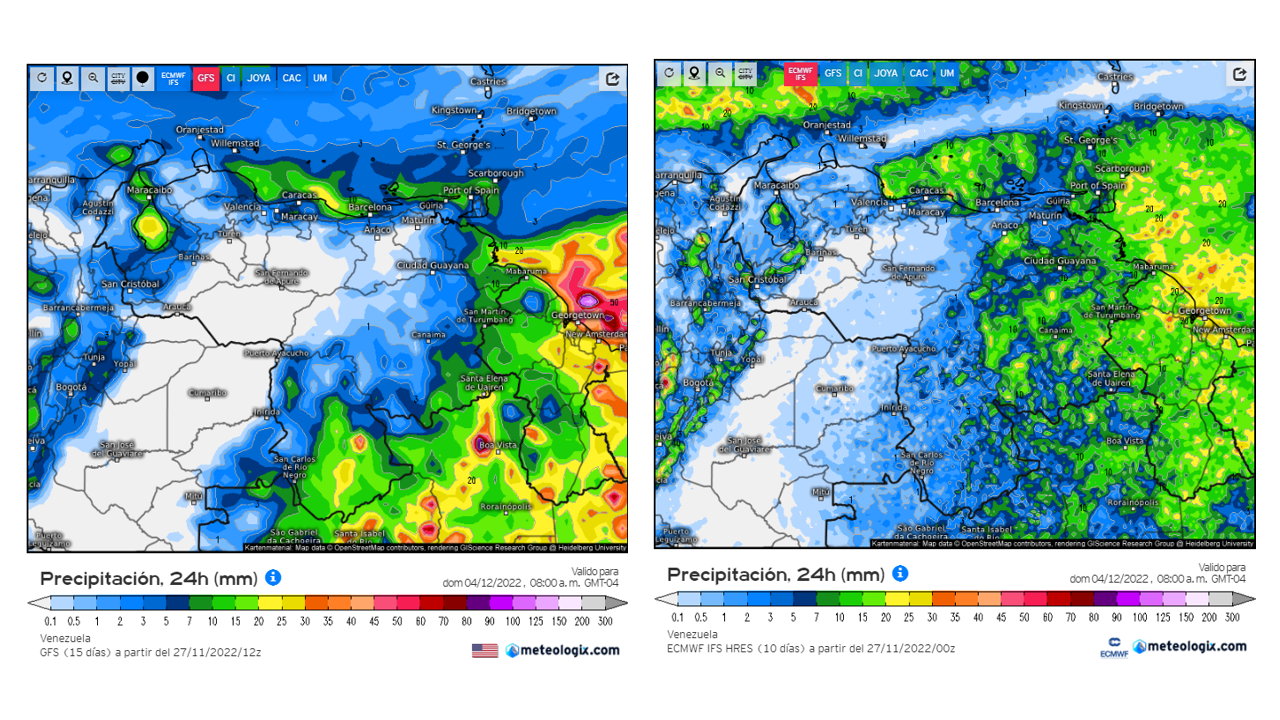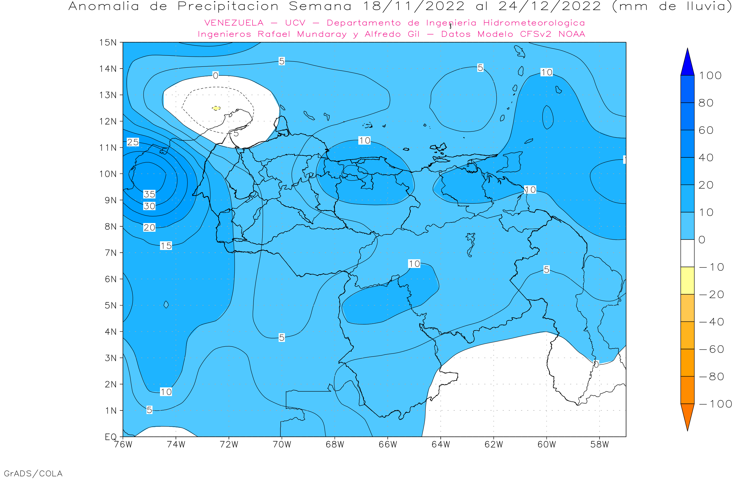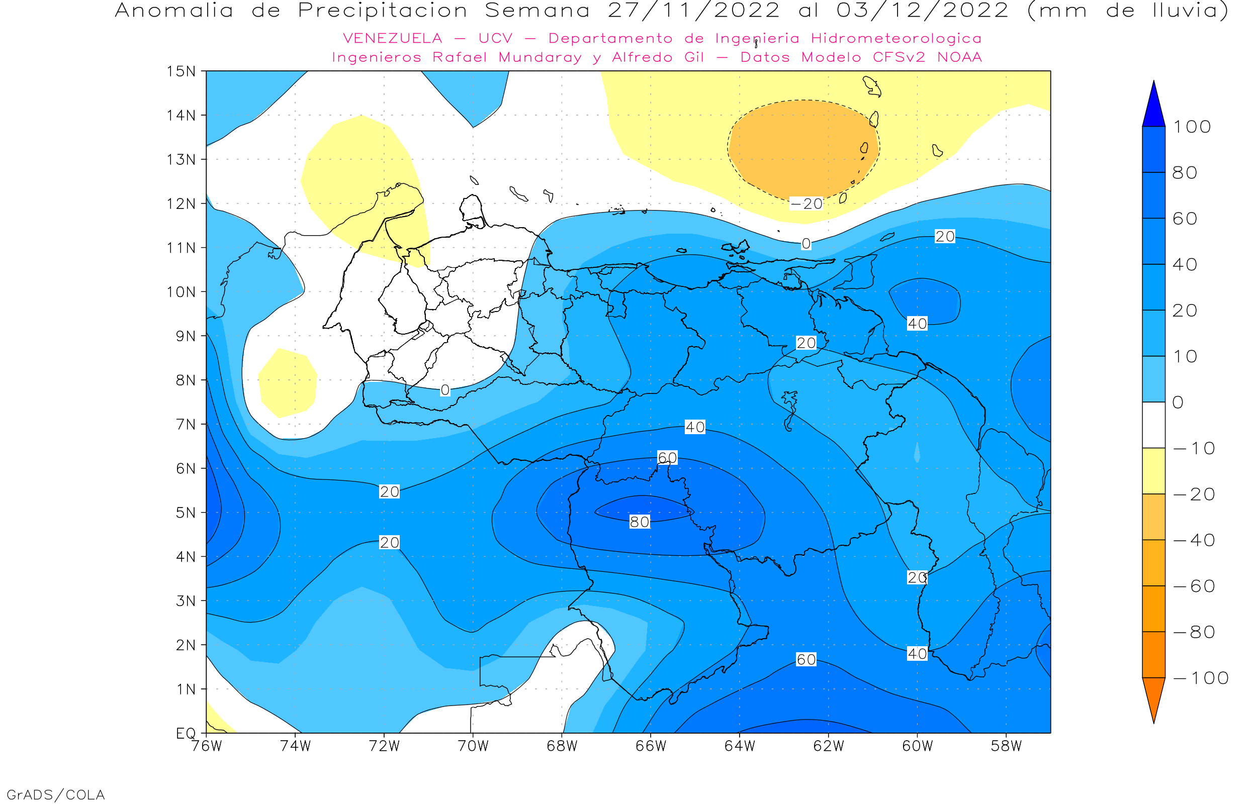 Pronostico de Anomalías Semanales para Venezuela, del 27/11 al 24/12/2022, usando datos del Modelo CFSv2 de NOAA y ECMWF.