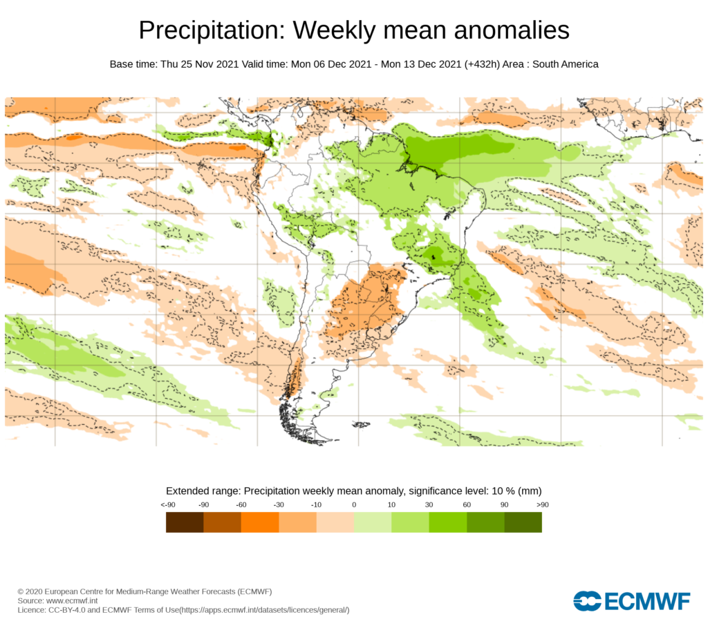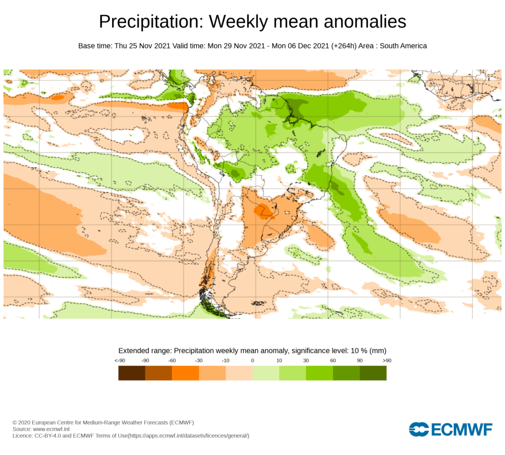 El pronostico semanal emitido por European Centre for Medium-Range Weather Forecast (ECMWF), se prevé anomalías negativas al norte y centro del país y al sur con precipitaciones cercanas al promedio.