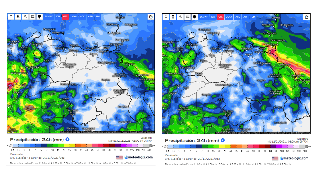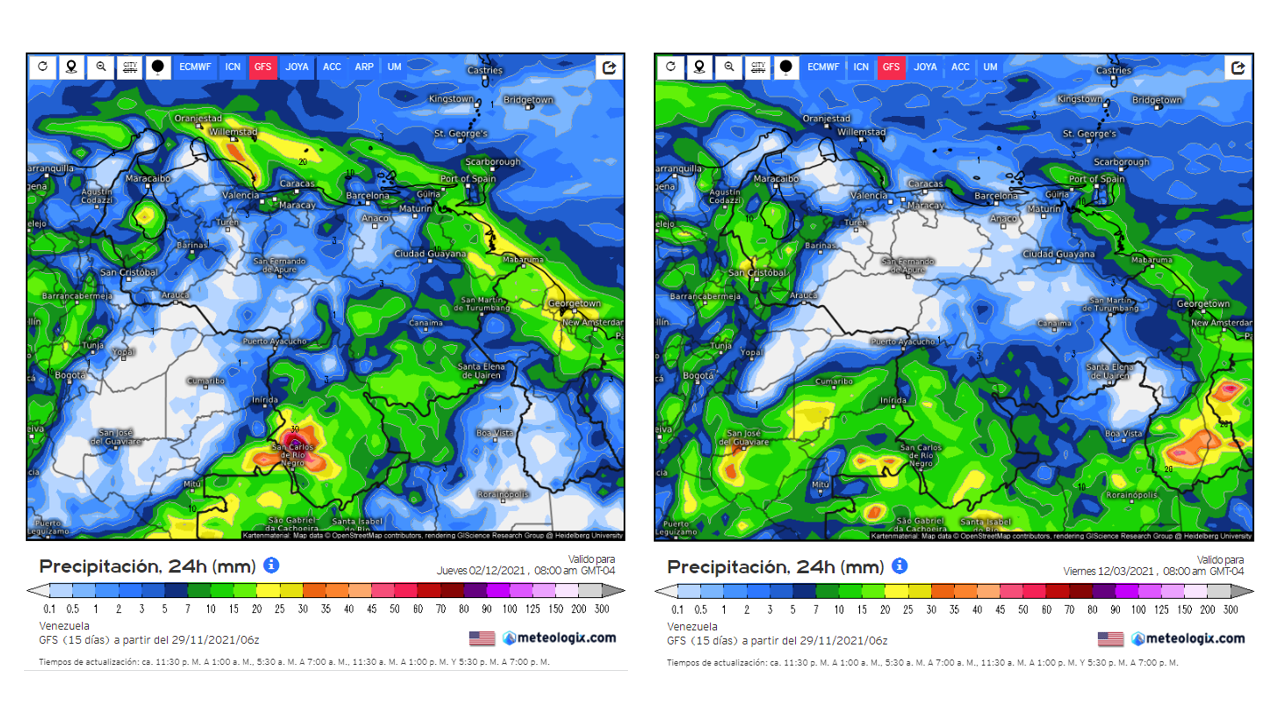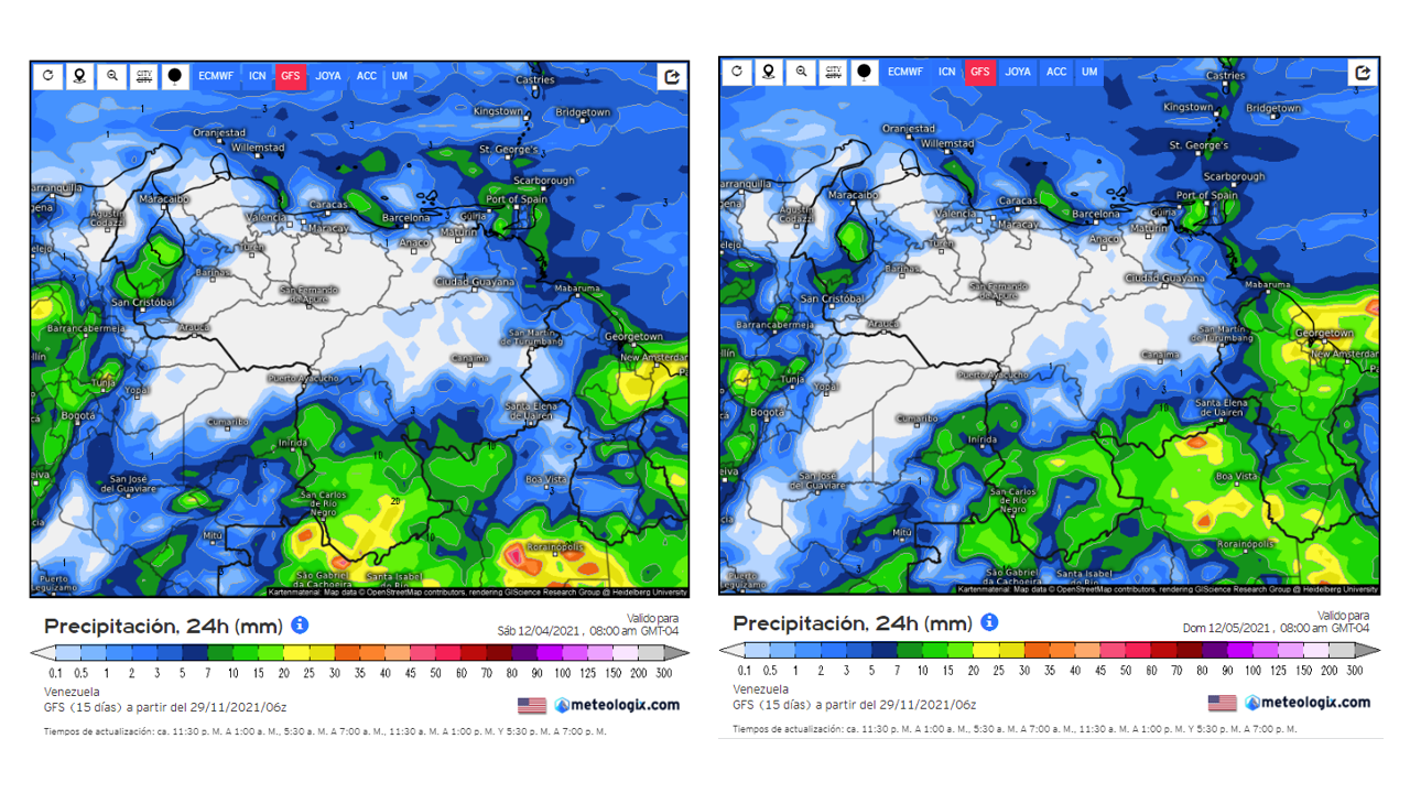 En el pronostico diario del modelo GFS del 29 de noviembre hasta al 05 de diciembre, la semana comienza con eventos de precipitaciones en el Zulia y el oriente del país, a mitad de semana se extiende al sur y mantediendose en el oriente y Zulia, mejorando al final de la semana, solo se mantienen las lluvias en Amazonas.