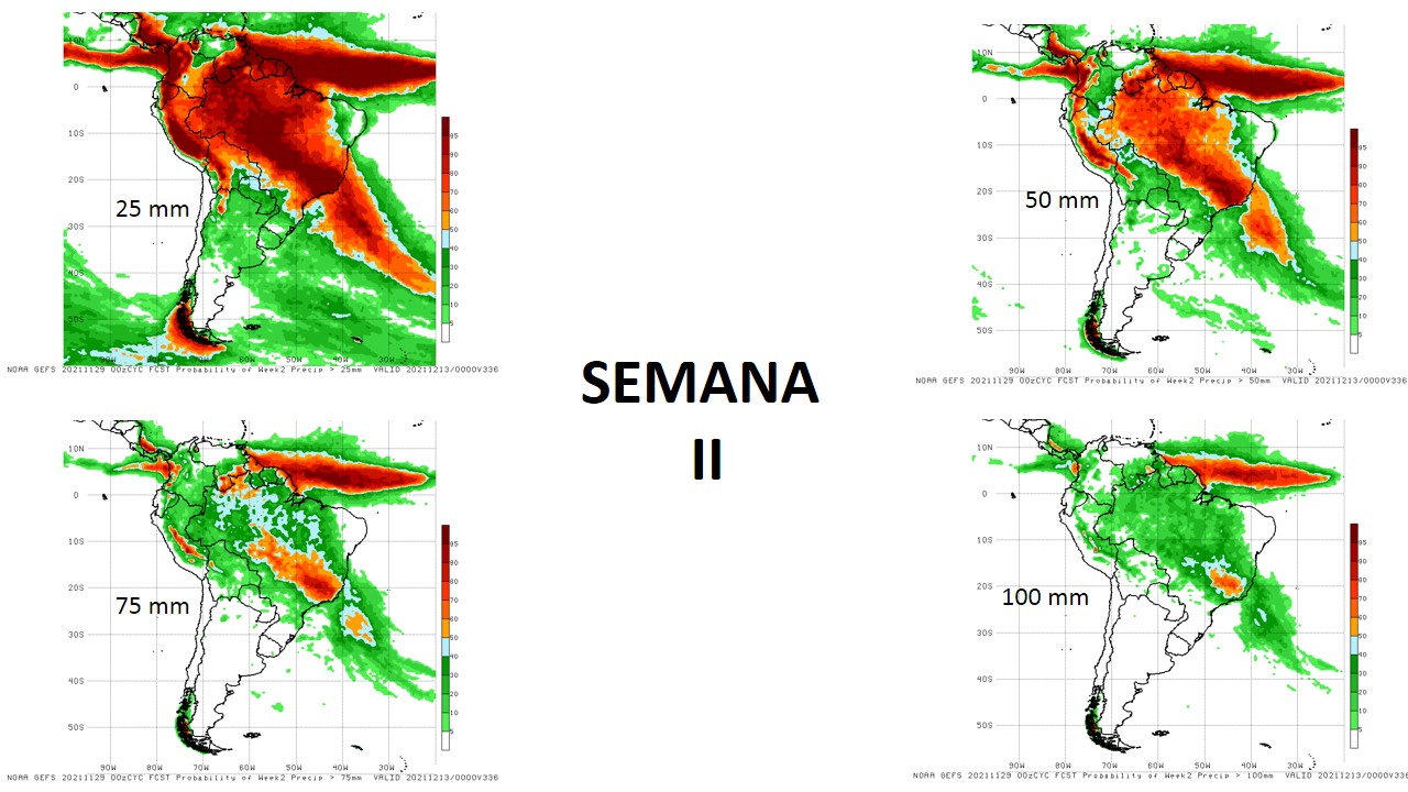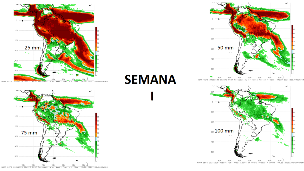 Las Probabilidades de excedencia total de precipitación para semana del 29 de noviembre al 06 de diciembre, superiores a 25, 50, 75 y 100 mm, se prevé que las mayores probabilidades para precipitaciones de 25 mm se esperan Región andina, oriente y sur del país, para eventos de 50 mm las mayores probabilidades al sur de Bolívar, lago de Maracaibo y Amazonas, lluvias de 75 y 100 mm se reducen las áreas y se observan pequeños puntos en Amazonas.