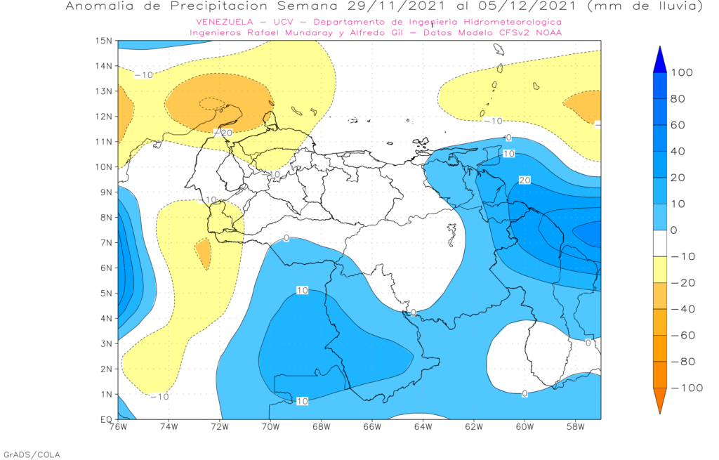 En la semana del 29 de noviembre al 05 de diciembre se prevé en general eventos de precipitaciones cercanos al promedio, con anomalías negativas en Falcón y los andes, y positivas en Amazonas y oriente del país