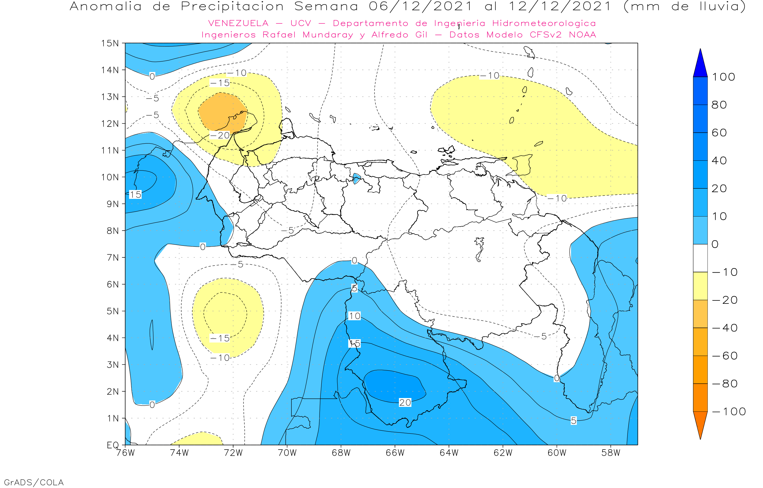 La semana del 06 al 12 de diciembre se prevé en general precipitaciones cercanas al promedio histórico, con anomalías positivas al sur y negativas al norte de Zulia.