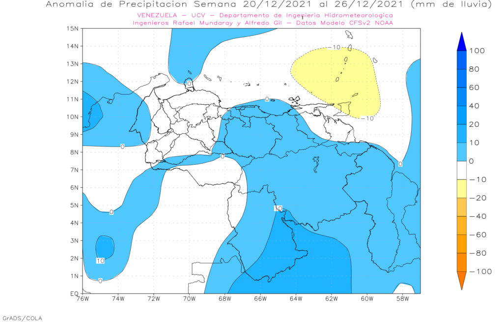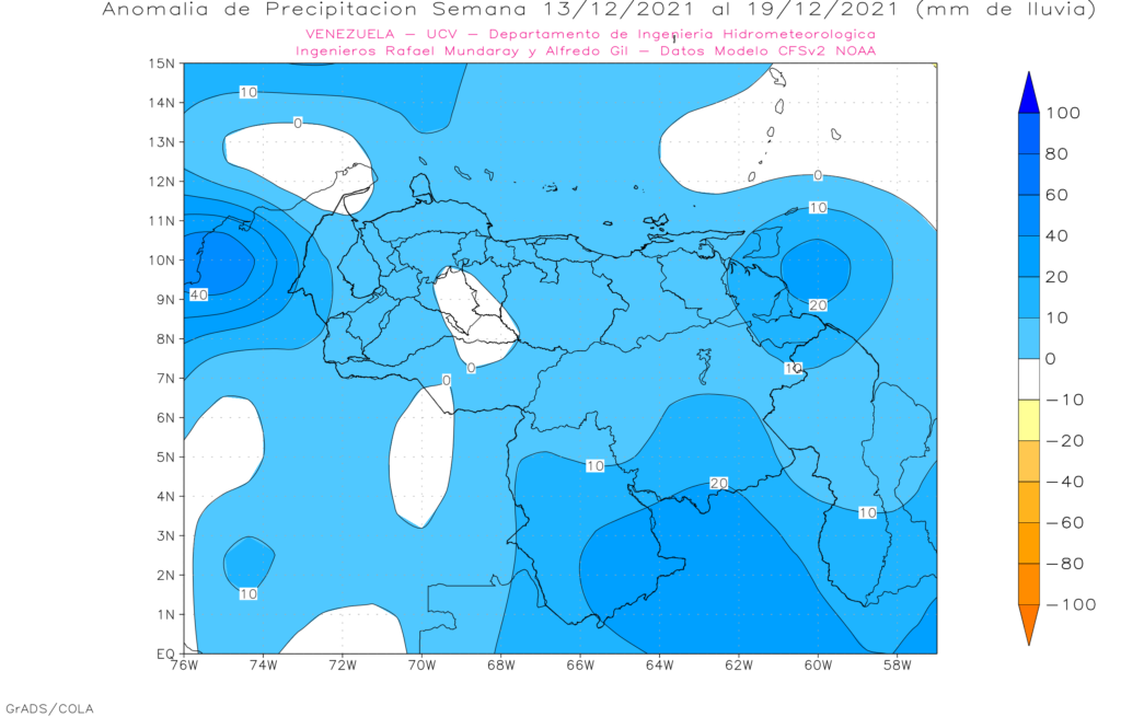 El pronostico semanal emitido por European Centre for Medium-Range Weather Forecast (ECMWF), se esperan precipitaciones cercanas al promedio en casi todo el territorio nacional, con anomalías negativas en los llanos occidentales y la región norte costera