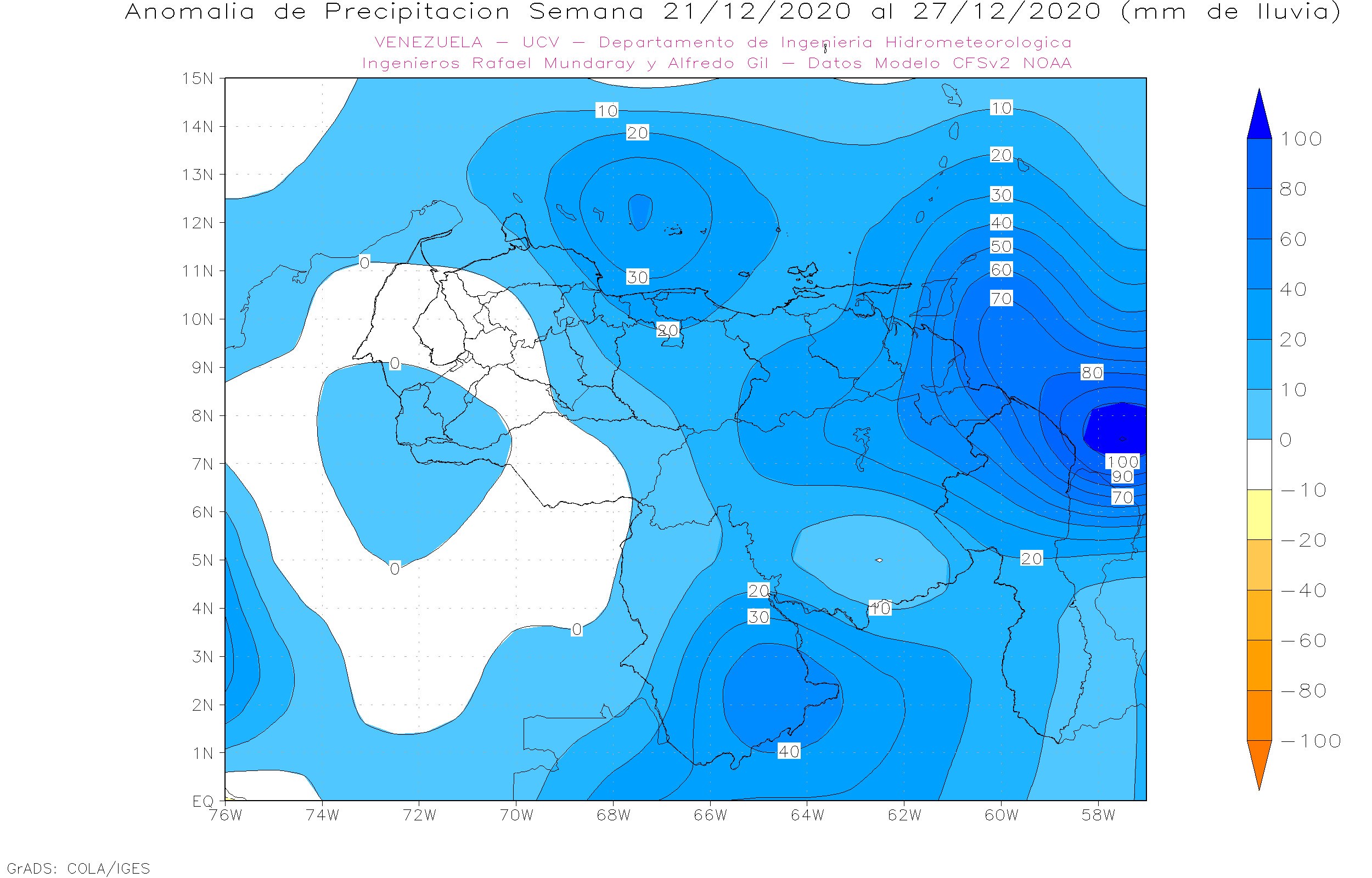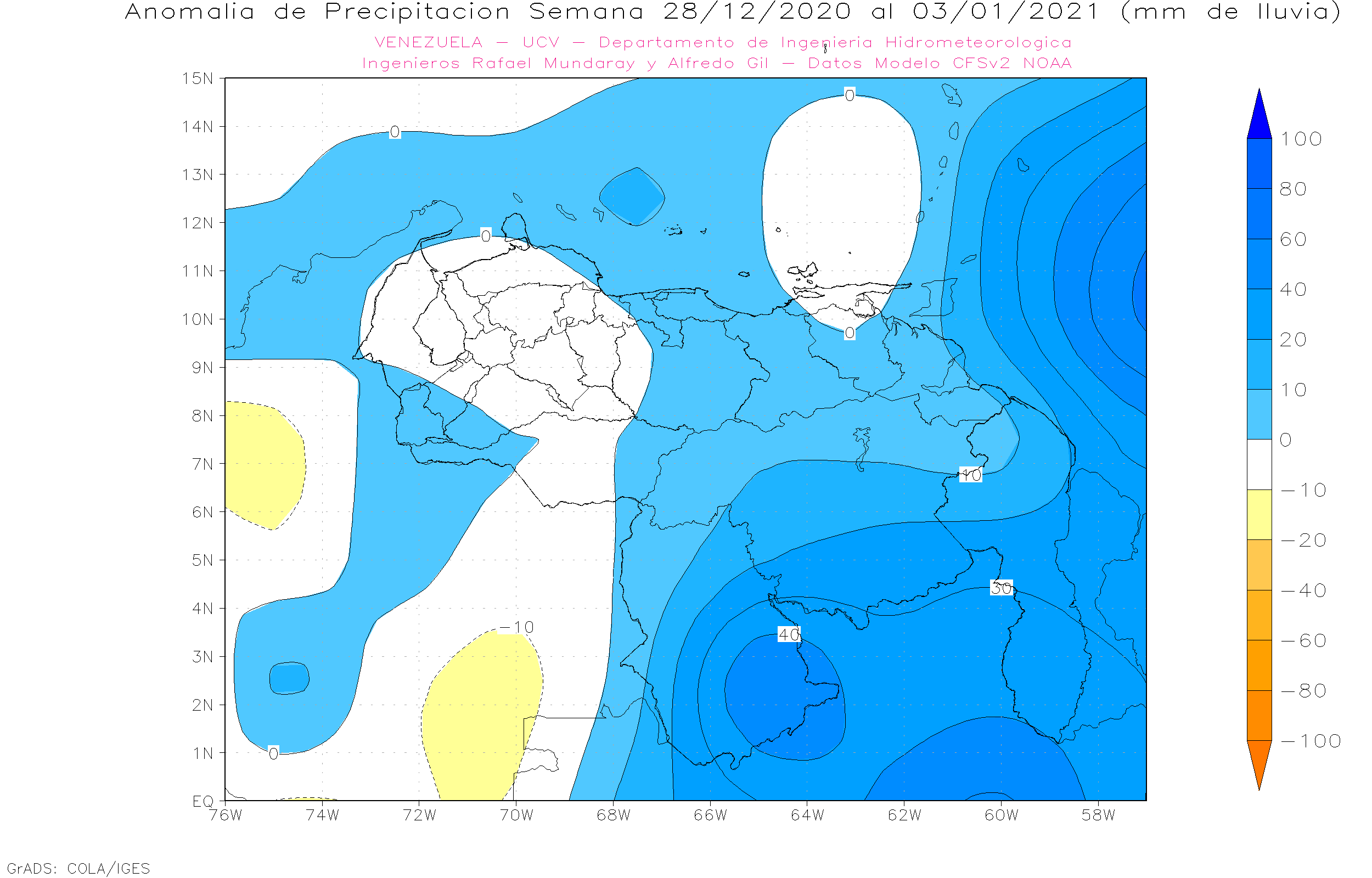 La semana del 28 de diciembre de 2020 al 03 de enero de 2021, se prevé general anomalías por encima de la media en casi todo el territorio nacional, las mas importantes se ubican al sur del país (sur de Bolívar y Amazonas)
