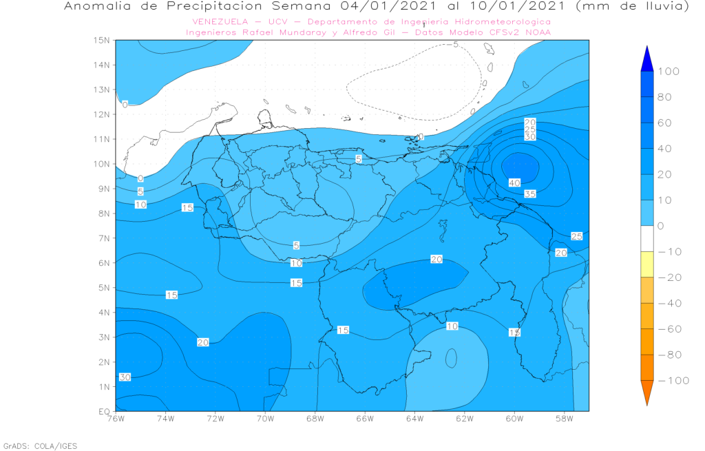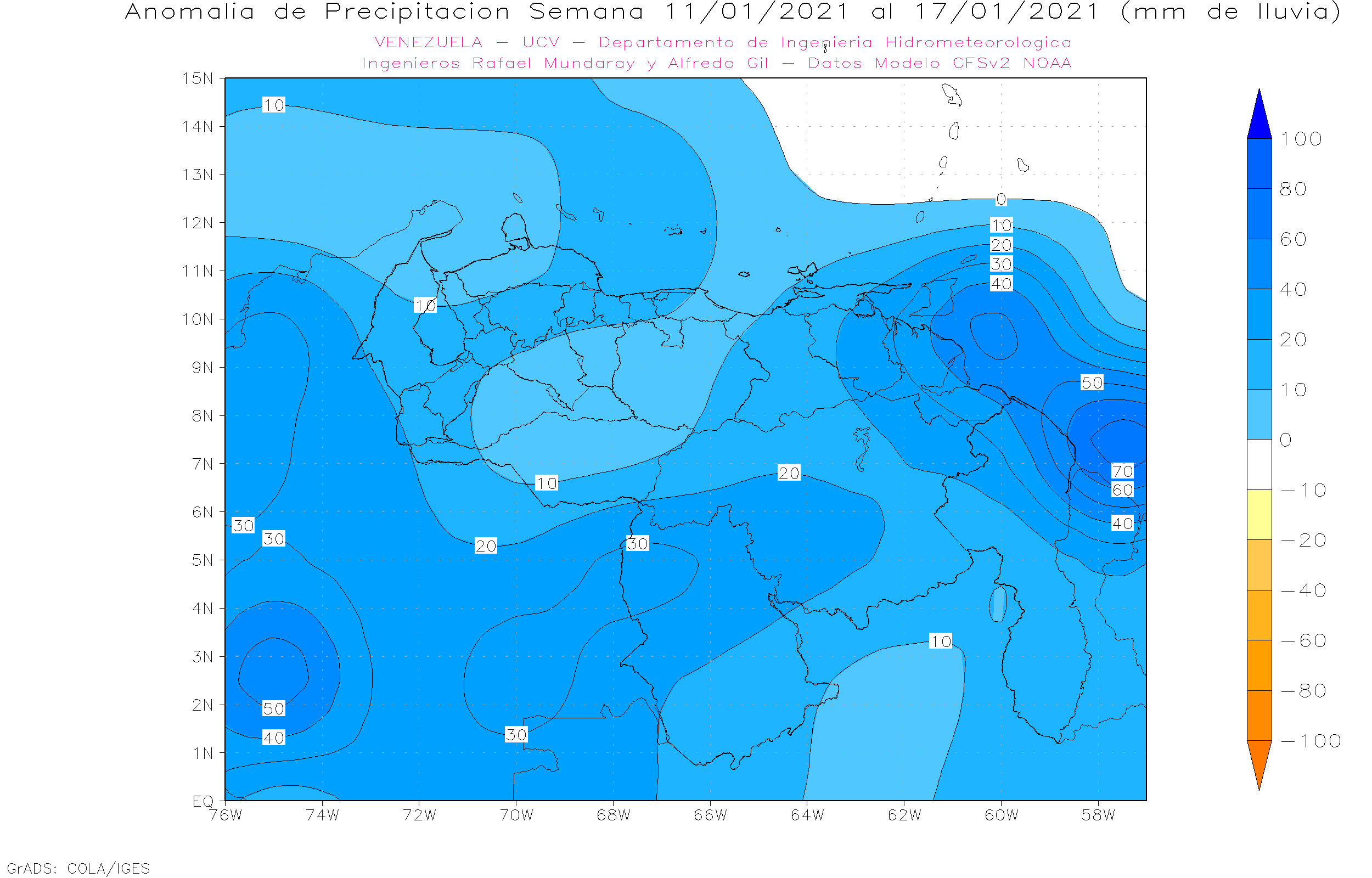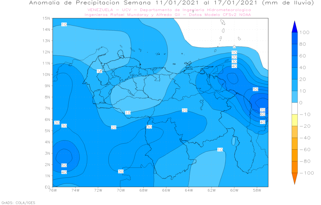 La semana del 11 al 17 de enero de 2021, se prevé en general anomalías por encima de la media sobre todo el territorio nacional, las principales anomalías se observan en el oriente y sur del país