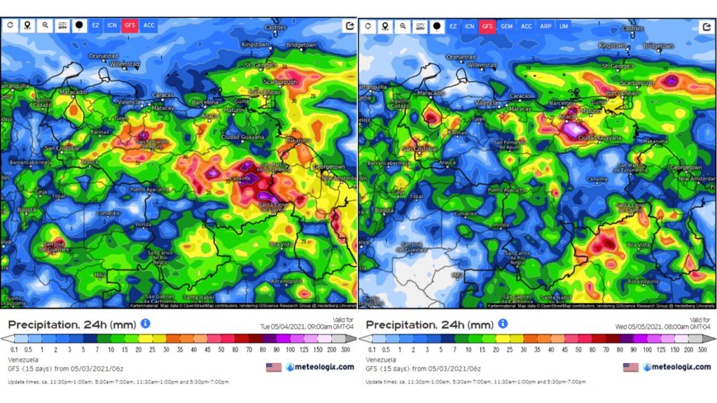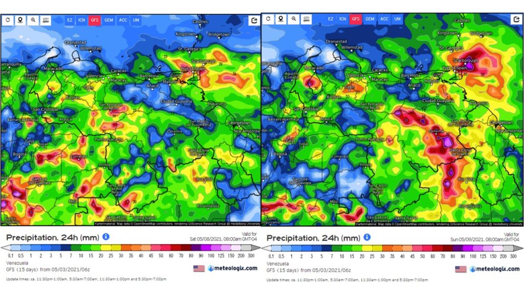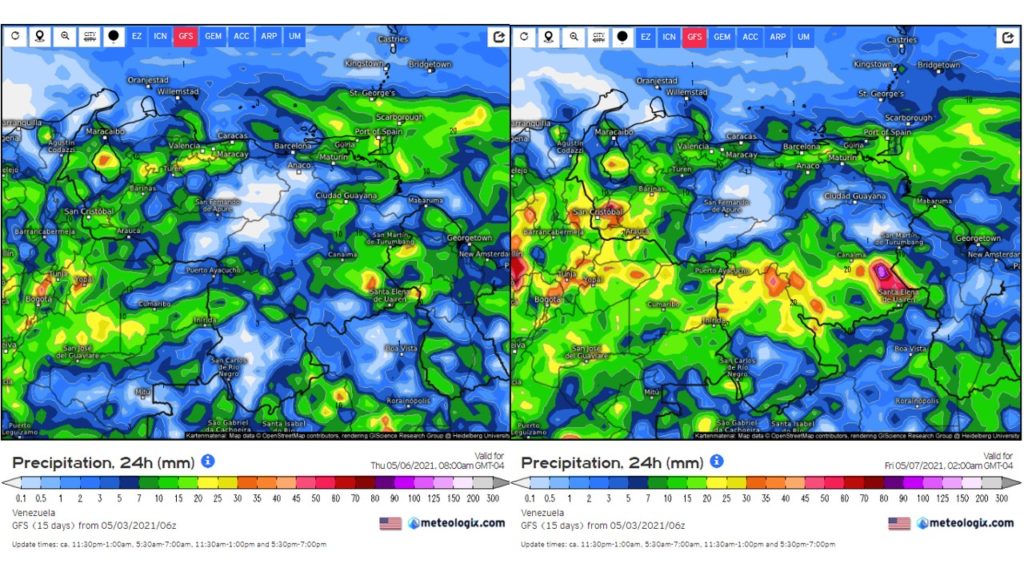 En el pronostico diario del modelo GFS del 03 al 09 de mayo, se prevé eventos de precipitaciones en casi todo el territorio nacional, los mas importantes, bolívar,, llanos occidentales, Mongas y Delta Amacuro.