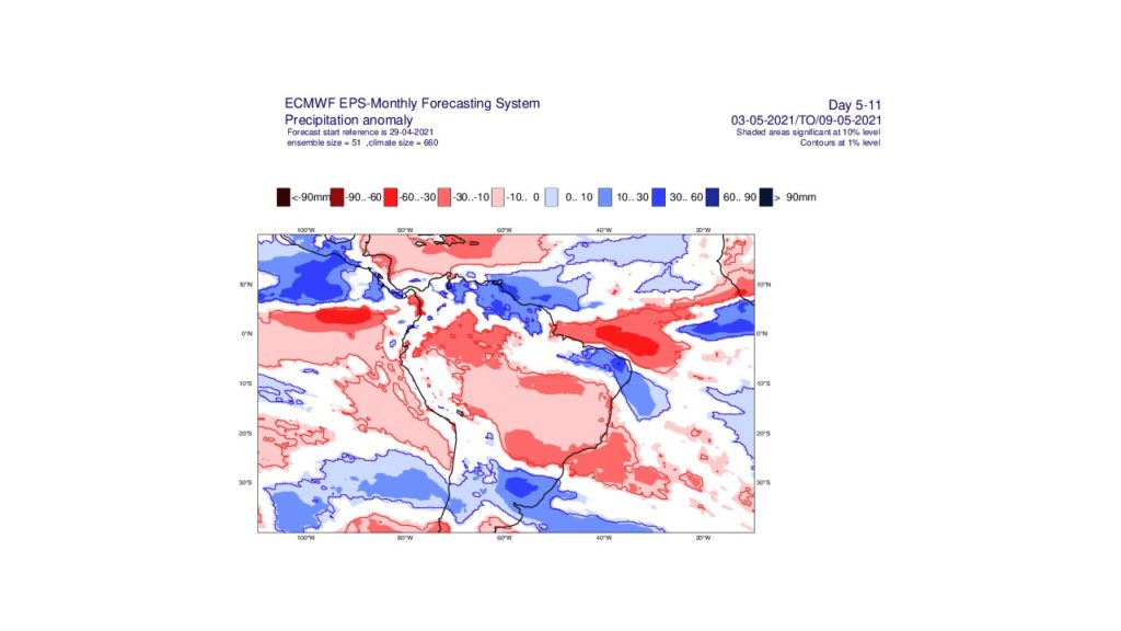 Al comparar el pronostico semanal de anomalías del CFSv2 con el emitido por European Centre for Medium-Range Weather Forecast (ECMWF), se observa la coincidencia de anomalías de positivase precipitacines en gran parte del país, pero los mas importante se pronostican Oriente y llanos ocidentales.
