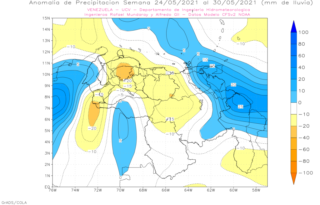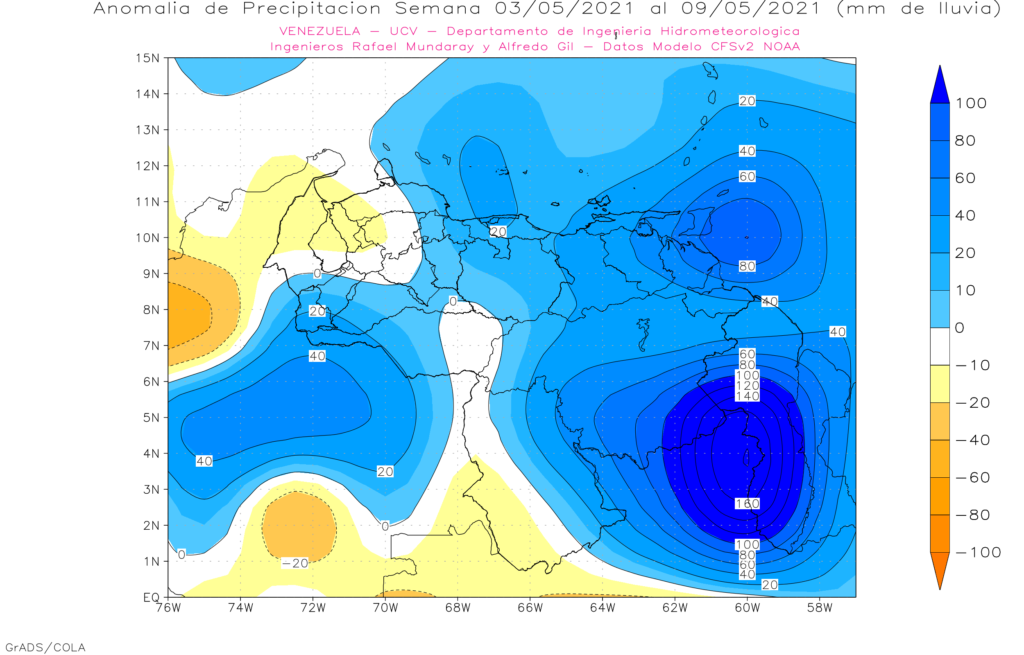 La semana del 03 al 09 de mayo, se prevé en gran parte del país anomalías positivas de precipitación, excpetuando norte de Zulia y suroeste de Amazonas. Las pricnipales anomalías positivas se esperan en Bolívar, los andes, Delta Amacuro y oeste de Monagas