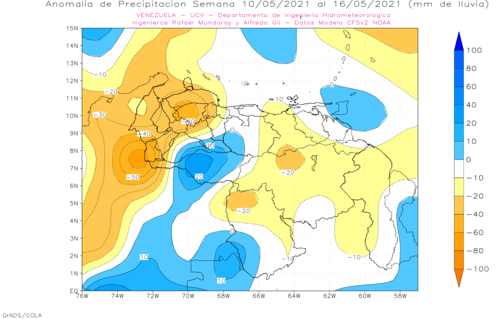 La semana del 10 al 16 de mayo, se prevé en general sobre casi todo el país anomalías negativas, las mas importantes en los andes y estados occidentales. Anomalías positiva en Apure y este de Barinas.