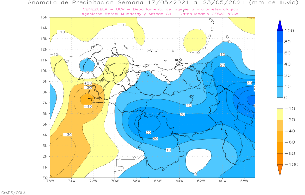 La semana del 17 al 23 de mayo,se prevé anomalías positivas en Bolívar, Amazonas y Delta Amacuro. Anomalías negativas en el occidente del país.
