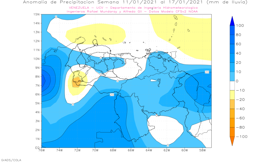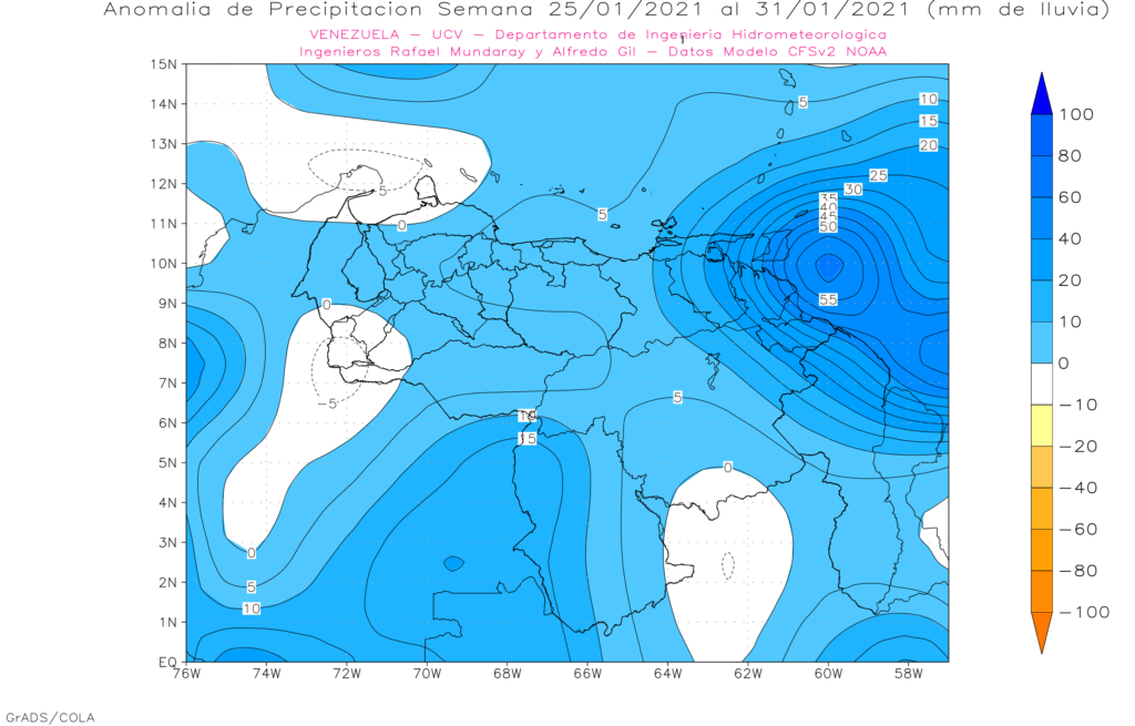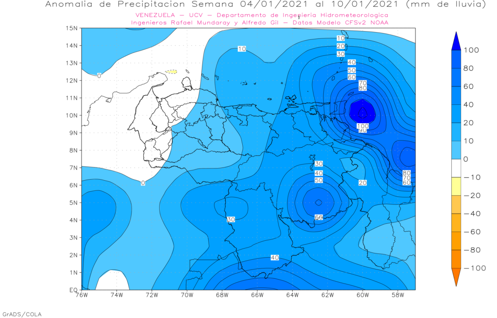 La semana del 04 al 10 de enero, se prevé en general anomalías positivas en casi todo el territorio nacional, las anomalías positivas mas importantes se presentaran al sur (cuenca del Caroní), y Oriente (Delta Amacuro y Monagas) del país