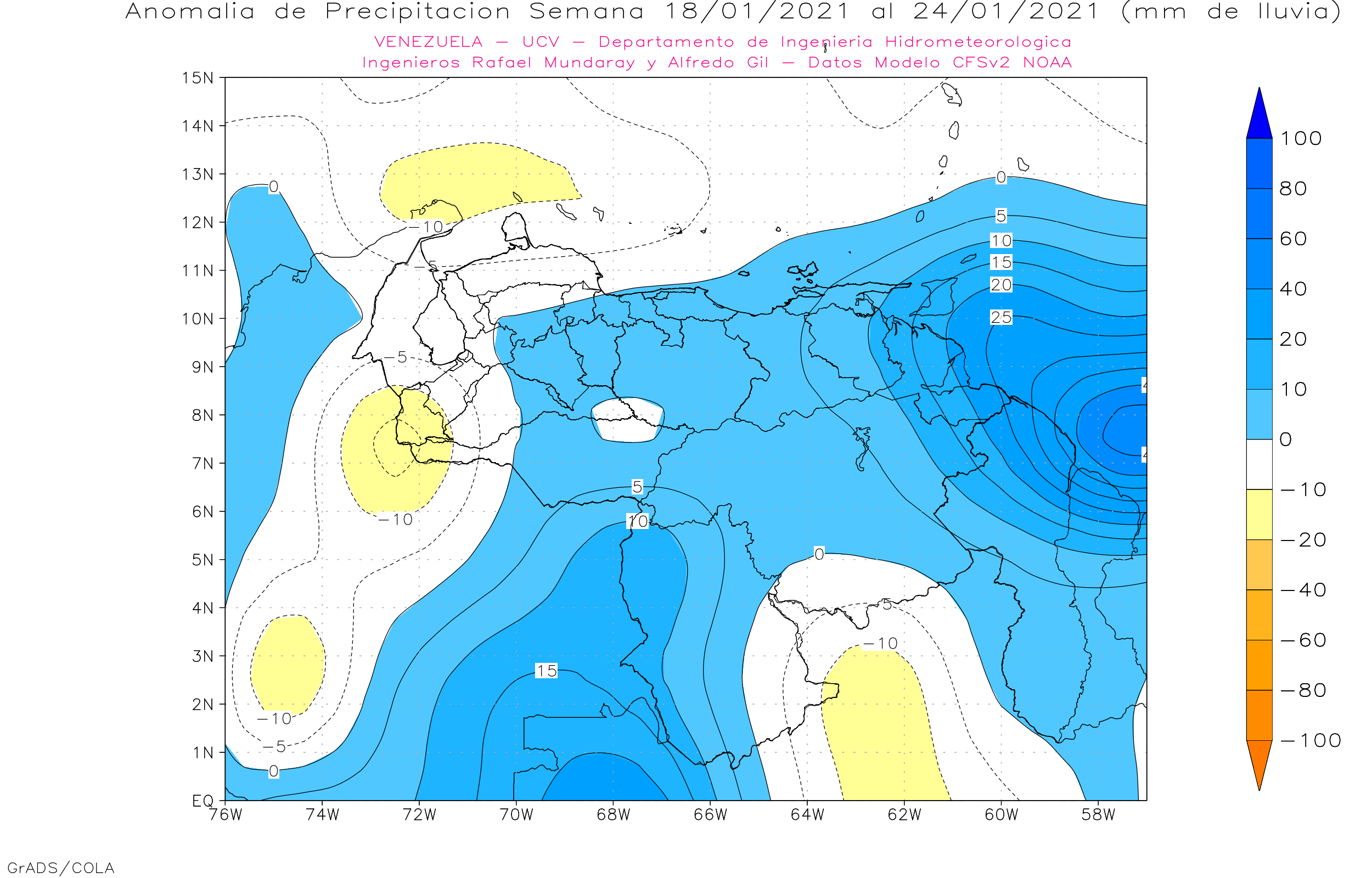 La semana del 18 al 24 de enero, se prevé en general sobre casi todo el territorio nacional lluvias cercana a la media histórica, exceptuando el Delta Amacuro con anomalías positivas y los andes con anomalías negativas.