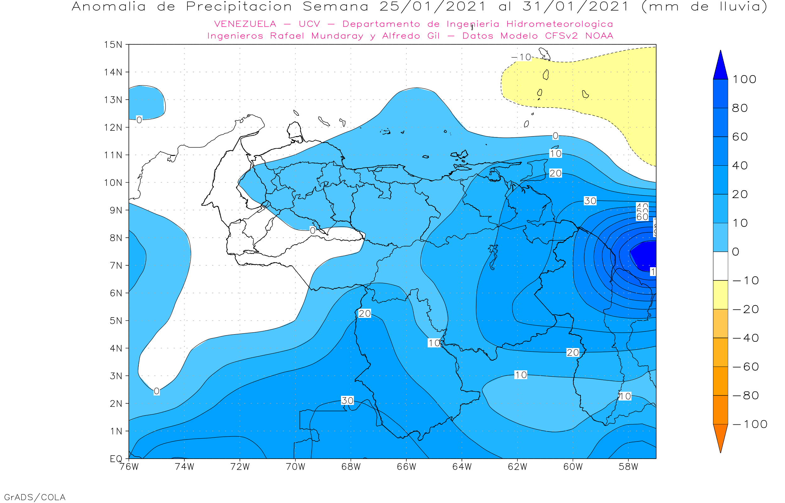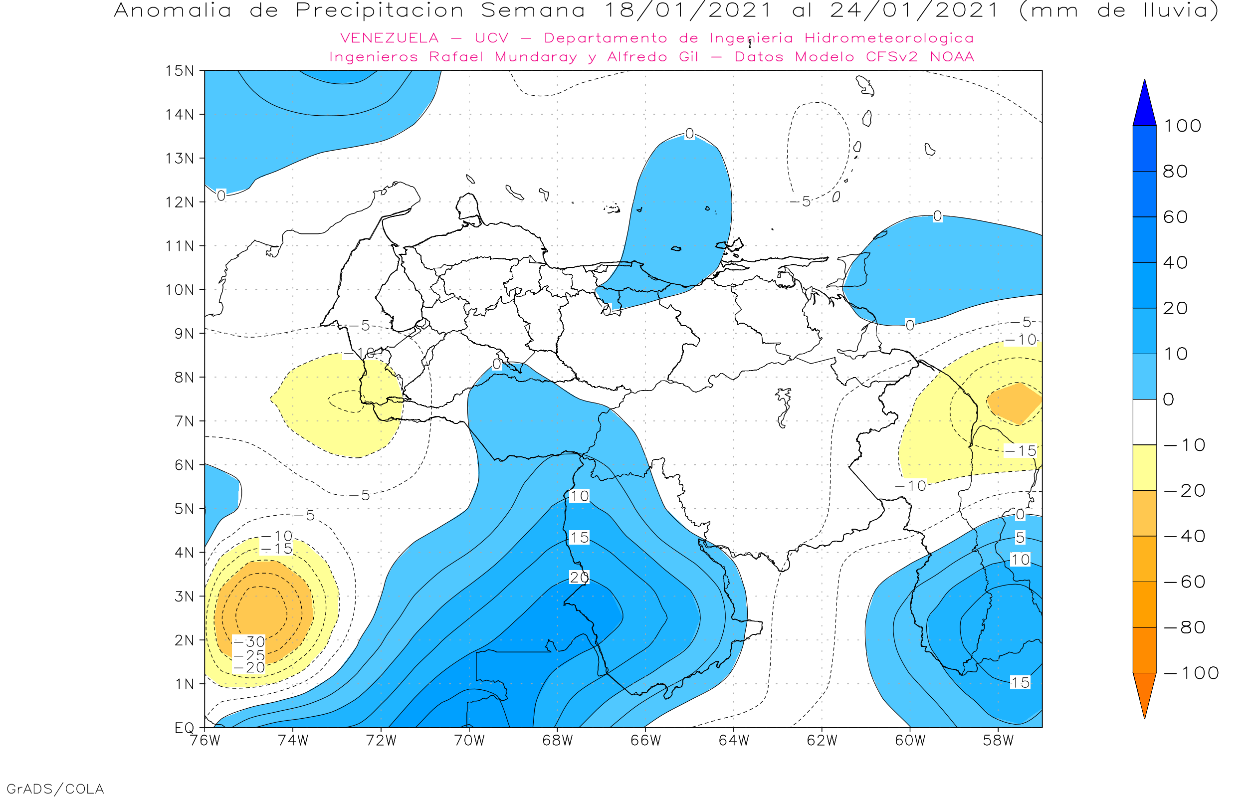 Pronostico subestacional de Anomalías de Precipitaciones Semanales para Venezuela, entre 18 de enero y el 14 de febrero 2021, usando datos del Modelo CFSv2 de NOAA.