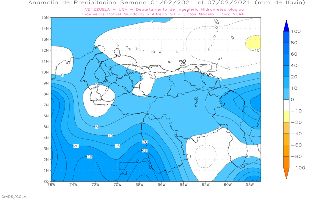 La semana del 18 al 24 de enero de 2021, se prevé en general sobre el territorio nacional de precipitaciones cercano a la media, anomalías negativas en la región de los andes y positivas en le estado Amazonas. Estamos en la temporada de escasas precipitaciones y esta semana se debe comportar de esta manera.