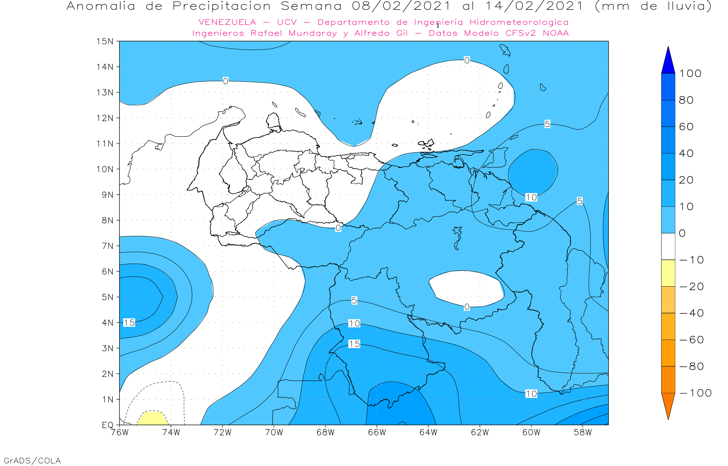 La semana del 08 al 14 de febrero de 2021, se prevé que la condiciones sea similar a la semana anterior, eventos de precipitaciones cercano a la media y anomalías positivas en el estado Amazonas.