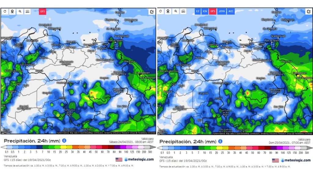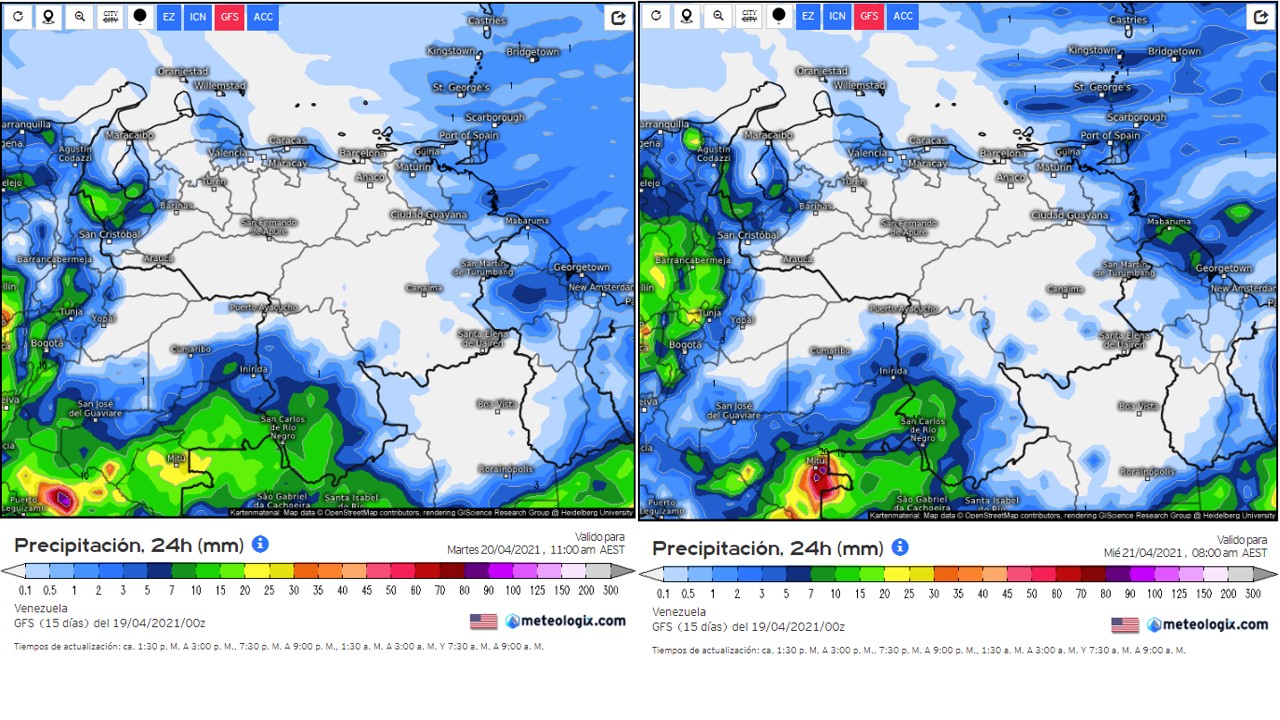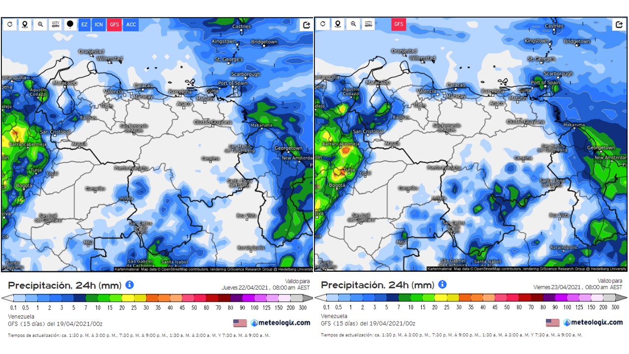 El pronostico diario de precipitaciones desde 20 /04 al  25/04, los primeros días las lluvias se ubican hacia la región de los andes, sur del lago de Maracaibo y sur de Amazonas, y al final del periodo se incrementan las lluvias hacia oriente y se mantiene sobre los andes y sur de lago de Maracaibo.