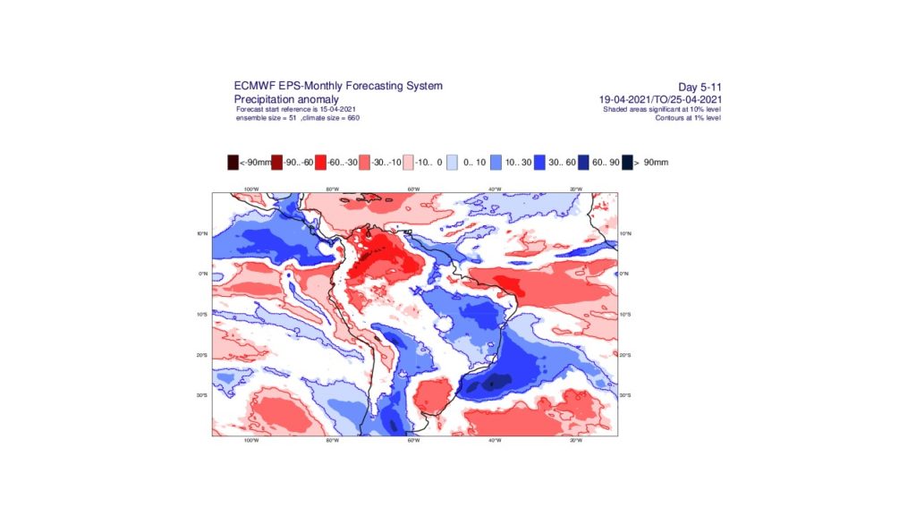 PRONOSTICO DE ANOMALÍAS SEMANALES DE PRECIPITACIÓN, DURANTE EL PERIODO DEL 19/04 AL 16/05 DE 2021