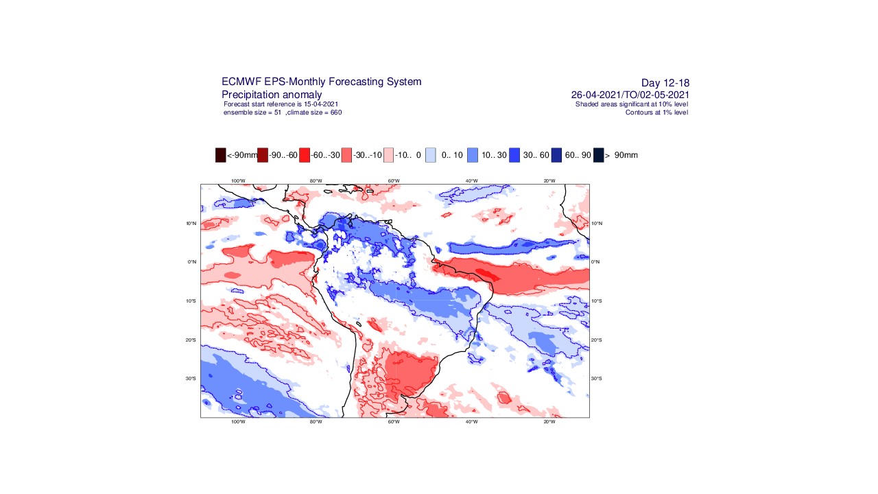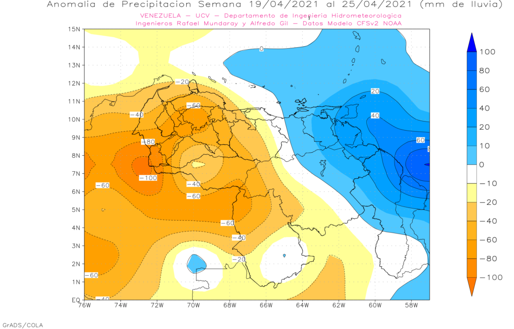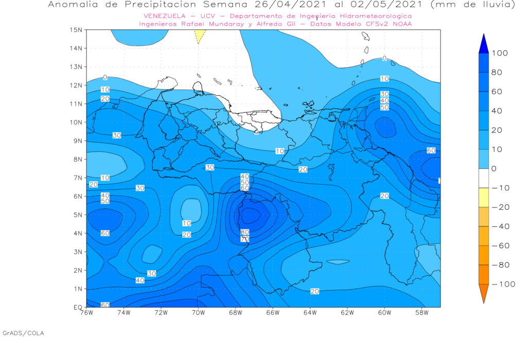 La semana del 26 de abril al 02 de mayo de 2021, se prevé en general sobre casi todo el país, anomalías positivas de precipitaciones, las mas importantes al sur, los andes, llanos occidentales y Delta Amacuro.