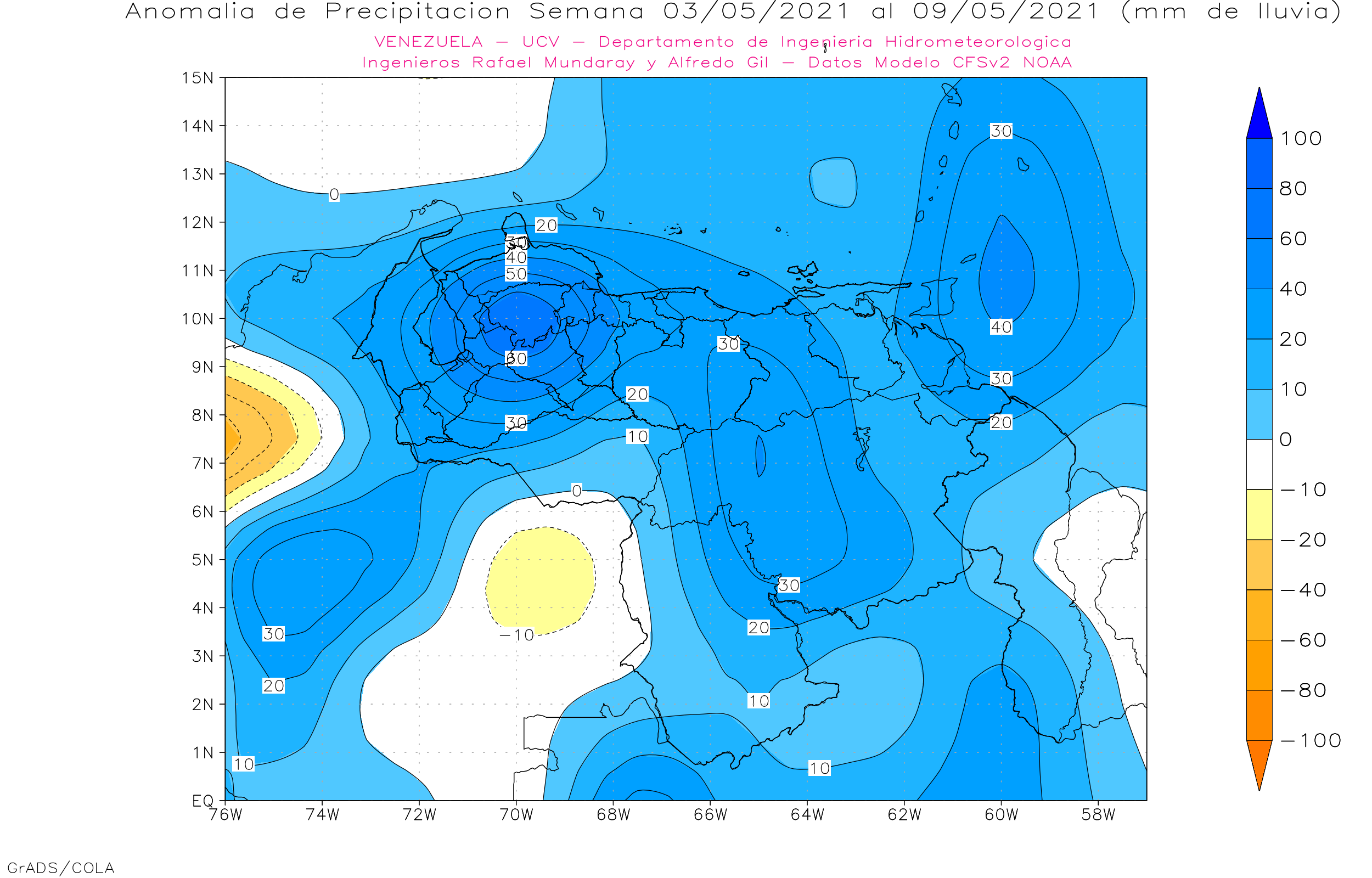 Las semana del 03 al 09 de mayo de 2021, se prevé en general sobre casi todo el país anomalías positvas de precipitaciones, las importantes en los estados occidentales y Delta Amacuro.