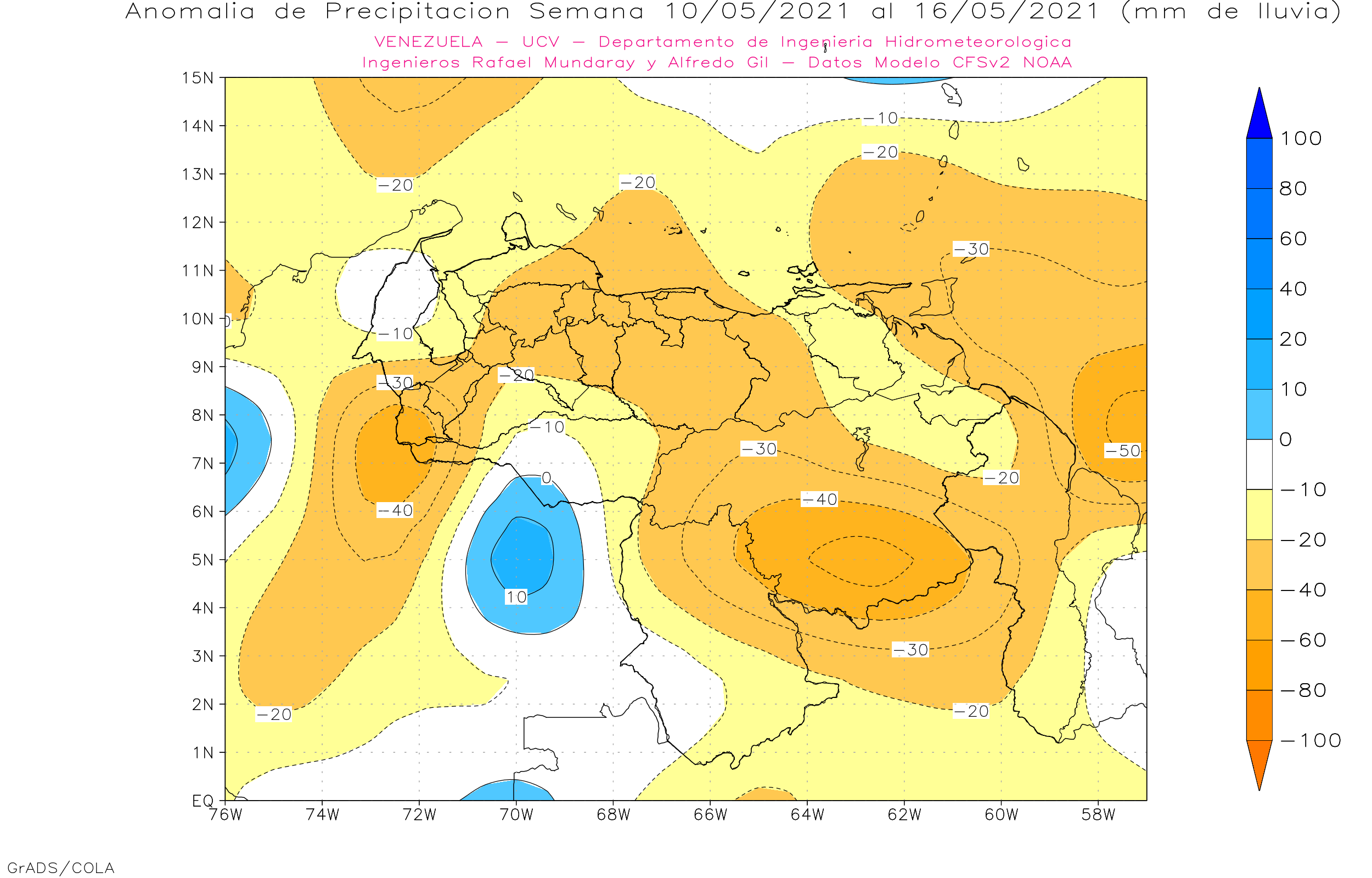 Las semana del 10 al 16 de mayo de 2021, se prevé un cambio importante, se esperan anomalías negativas en casi todo el teeritorio nacional, las mas importante en Bolívar y Tachira.