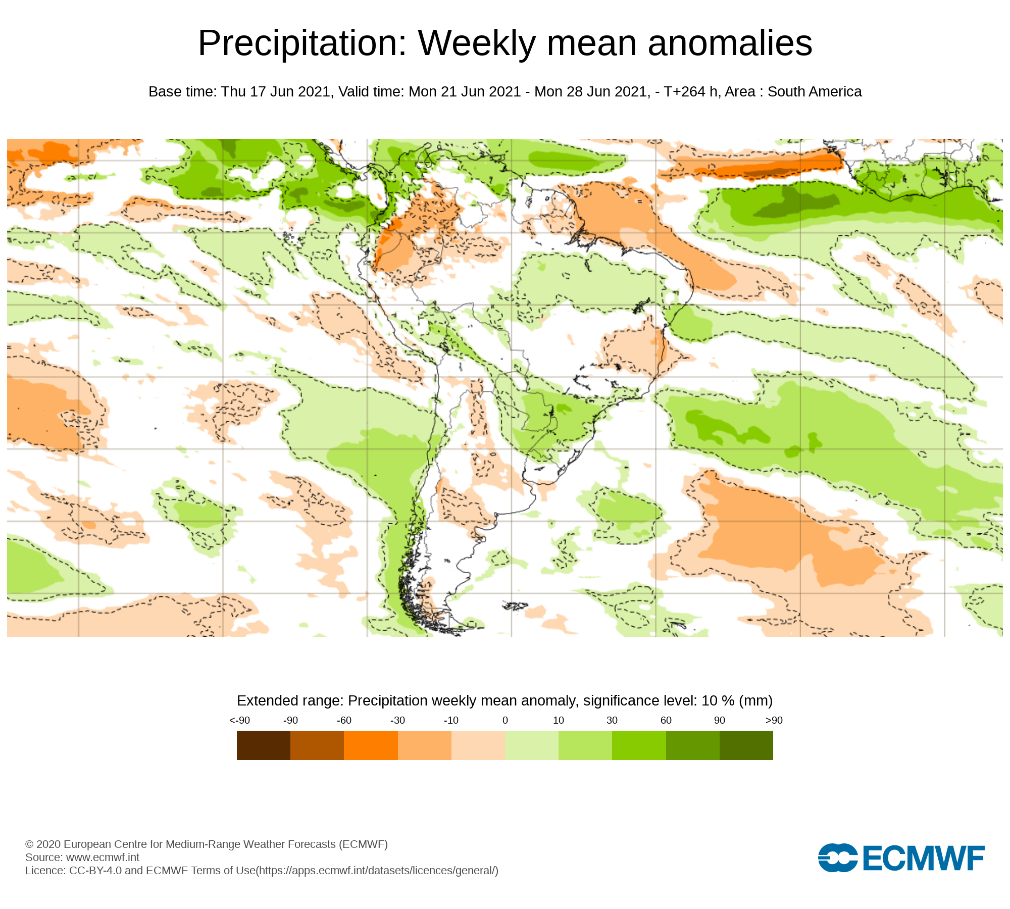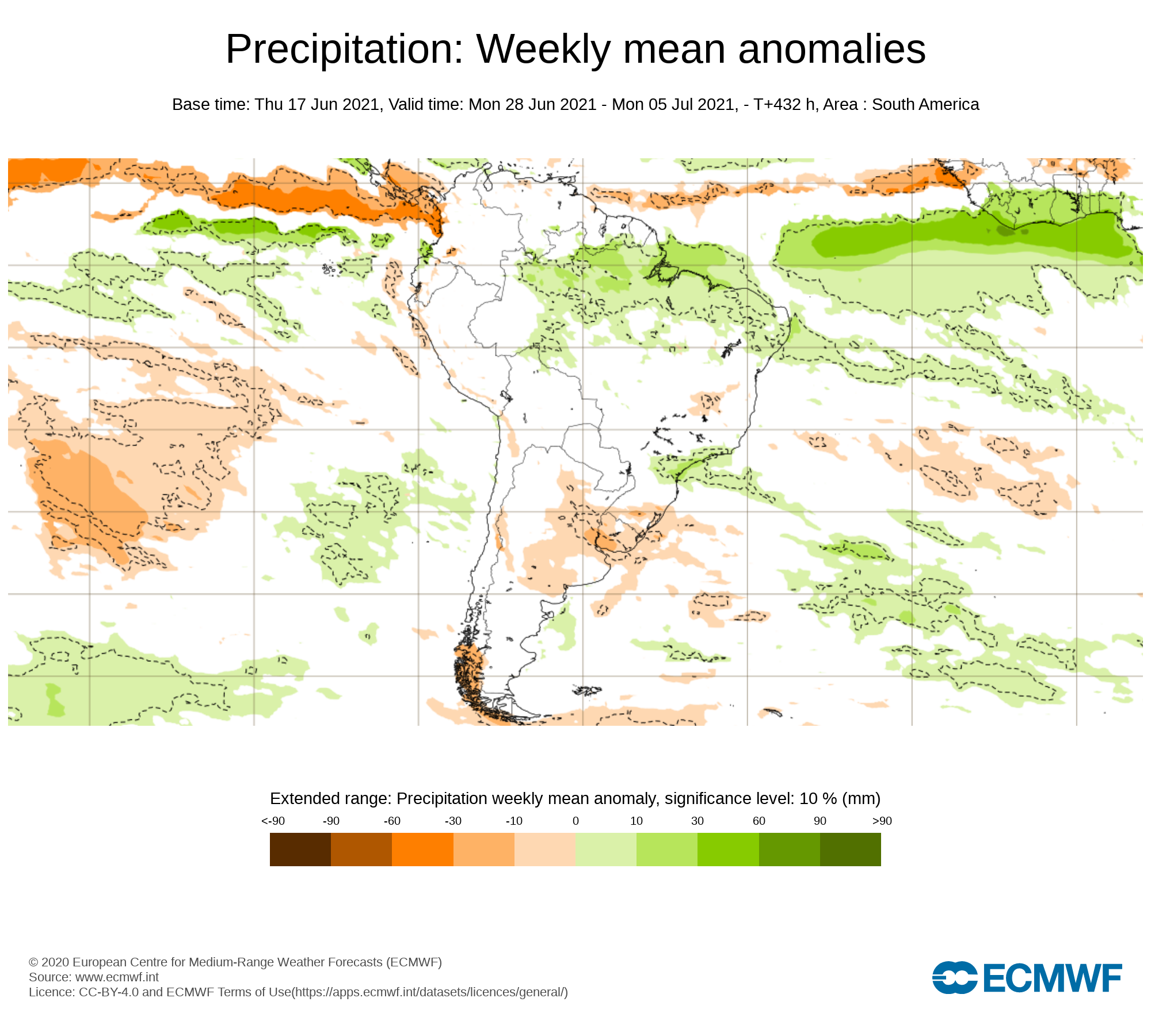 Al comparar el pronostico semanal de anomalías del CFSv2 con el emitido por European Centre for Medium-Range Weather Forecast (ECMWF), se observa similitud al norte del país con precipitaciones cercanas a la media histórica, y diferencia la sur, donde prevé eventos promedios de lluvia.