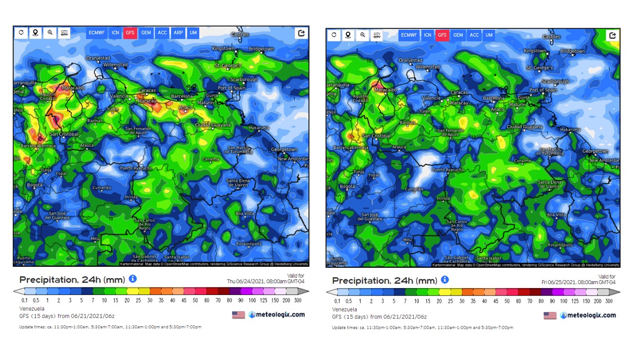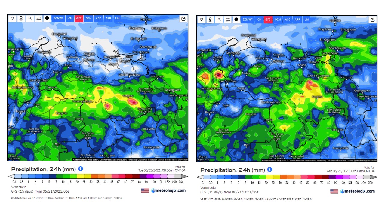 En el pronostico diario del modelo GFS del 21 al 27 de junio, con la llegada de la onda tropical ubicada en 45° W, a partir del miércoles, debe generar eventos de precipitaciones a lo largo del país, durante su desplazamiento sobre el país. Los eventos mas importantes durante esta semana se esperan que ocurran el sur de país.