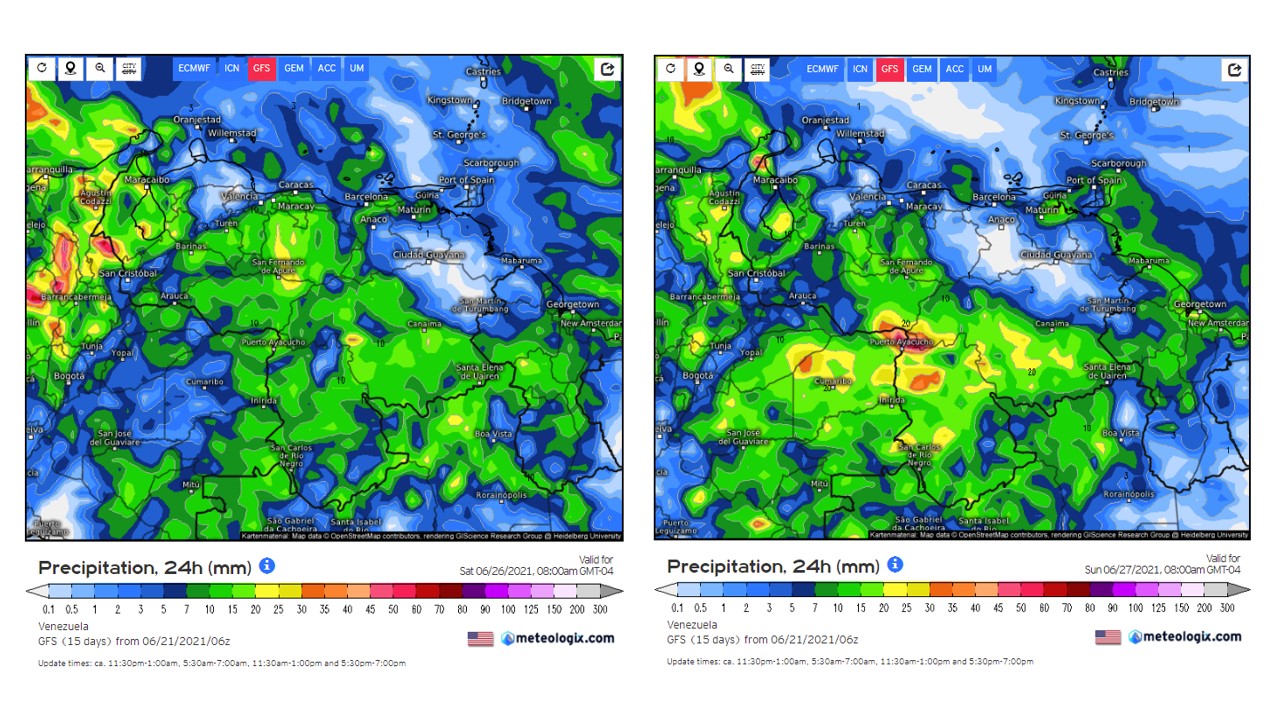 En la semana del 21 al 27 de junio se prevé en general eventos de precipitaciones cercanos al promedio histórico, las anomalías positivas mas alta se esperan en el Zulia.
