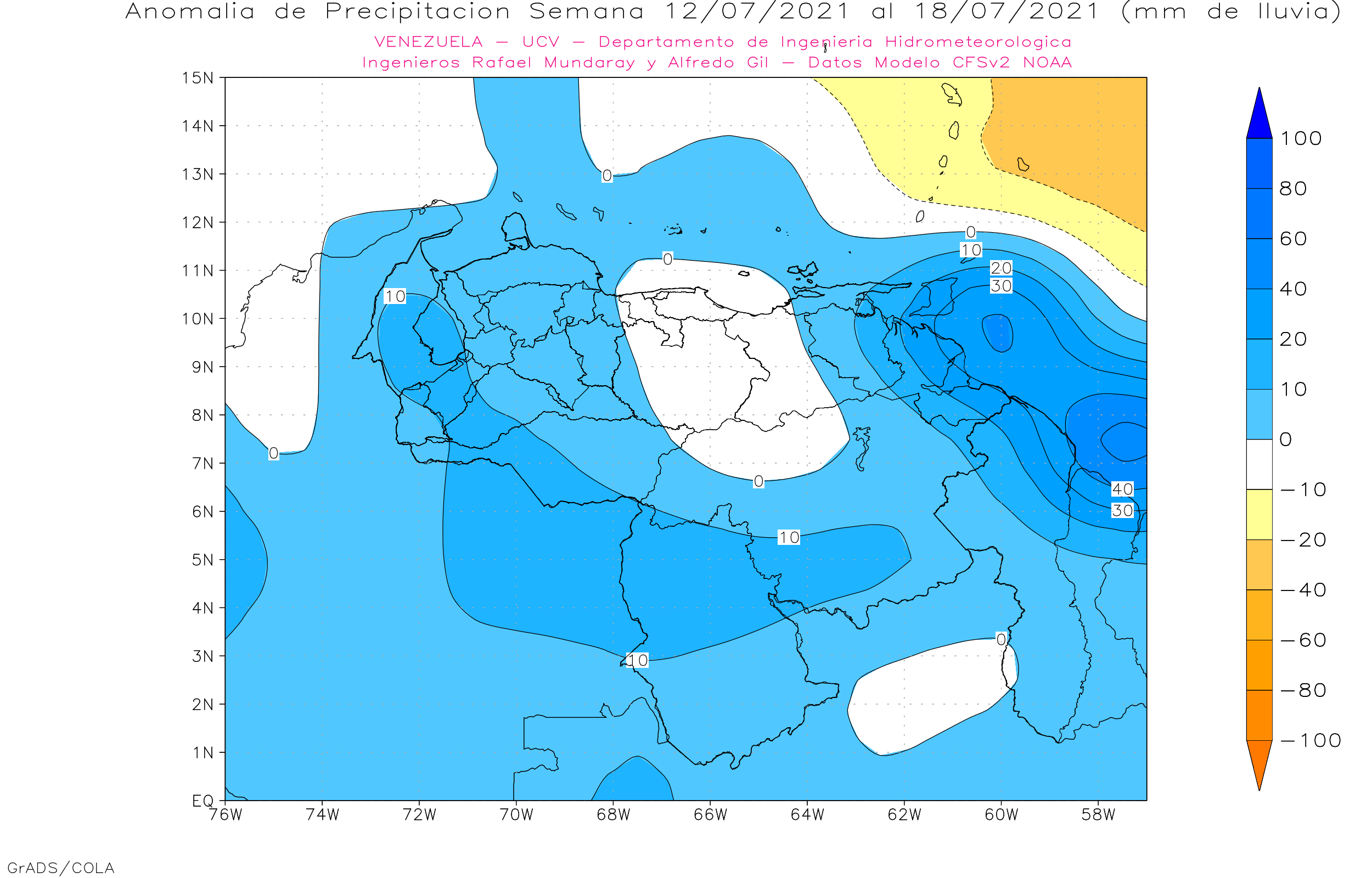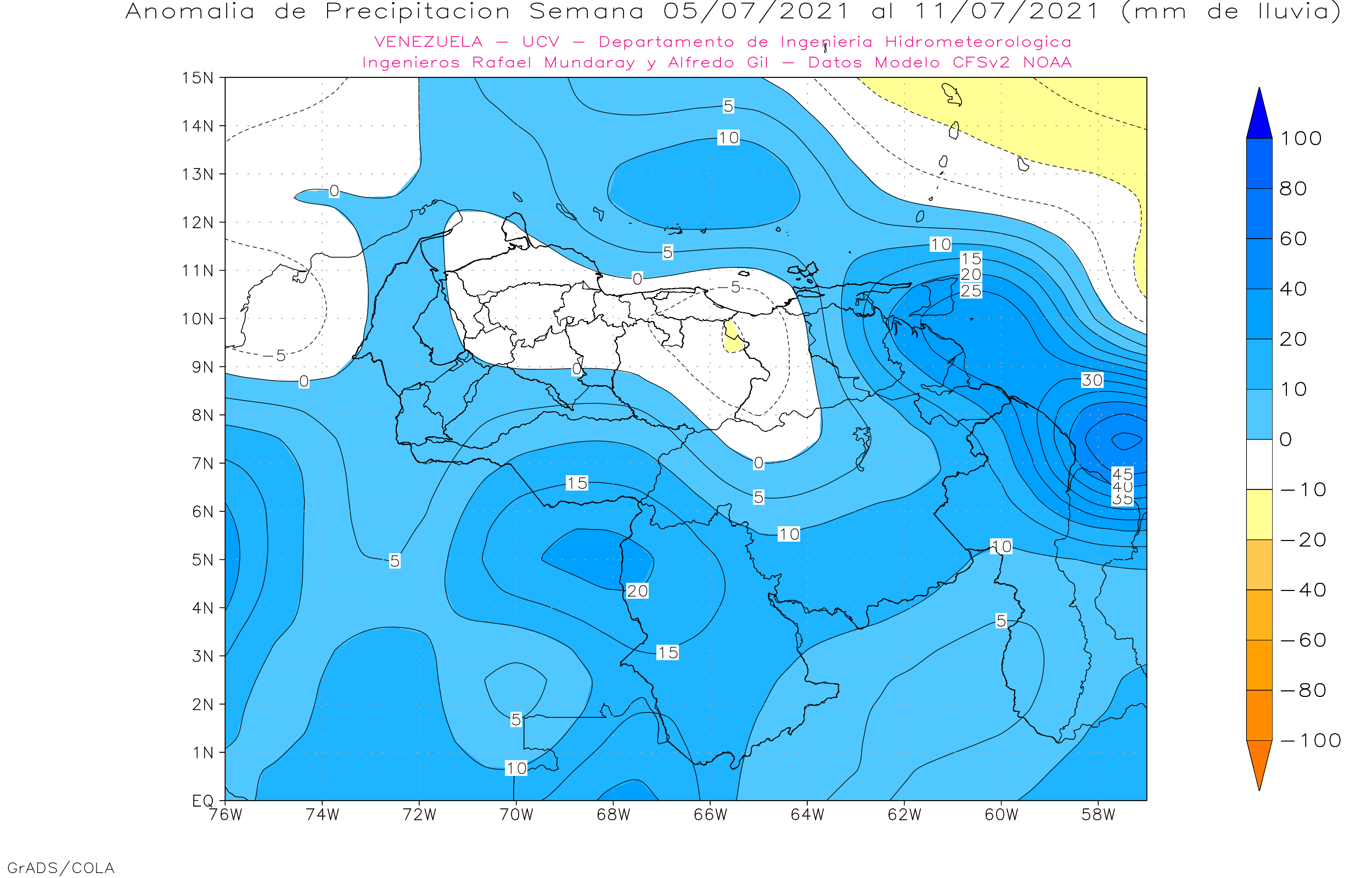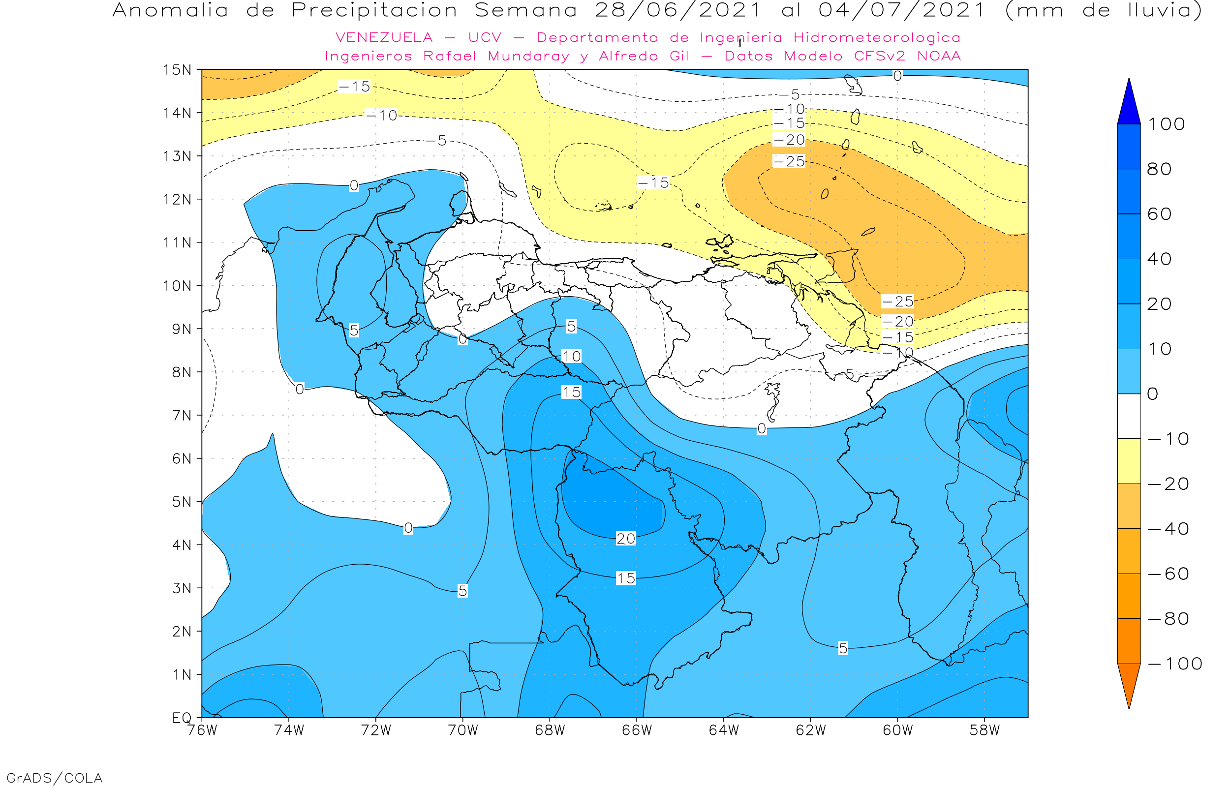 Semanales para Venezuela, del 21/06 al 18/07 de 2021, usando datos del Modelo CFSv2 de NOAA.