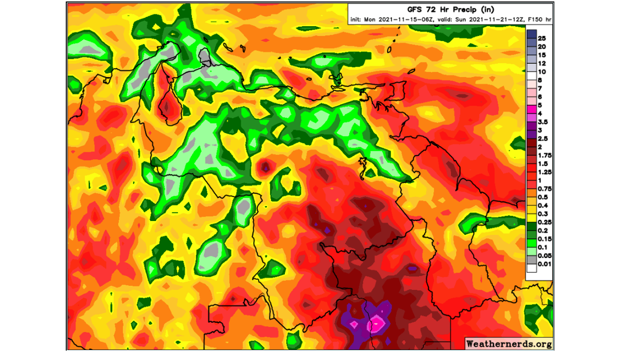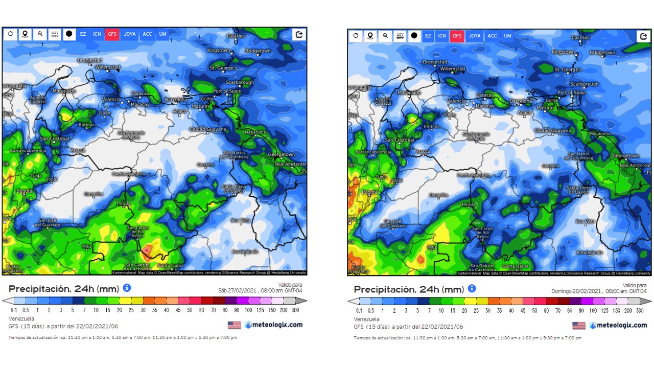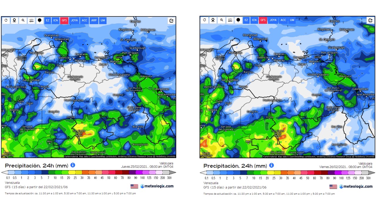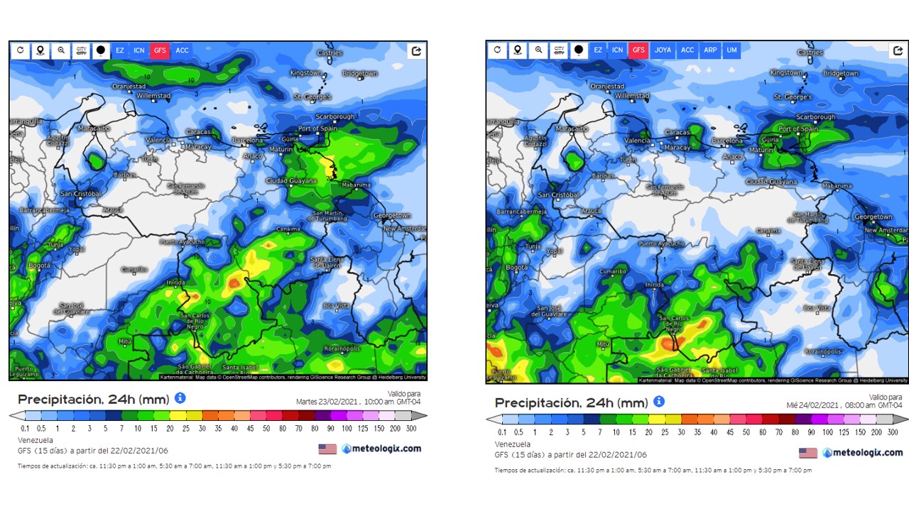 Los principales eventos de precipitaciones entre 22 al 28 de febrero, se prevé en Amazonas, Monagas, Sucre, Delta Amacuro, sur de Bolívar, sur del lago de Maracaibo y los andes. (Fuente: https://meteologix.com/)