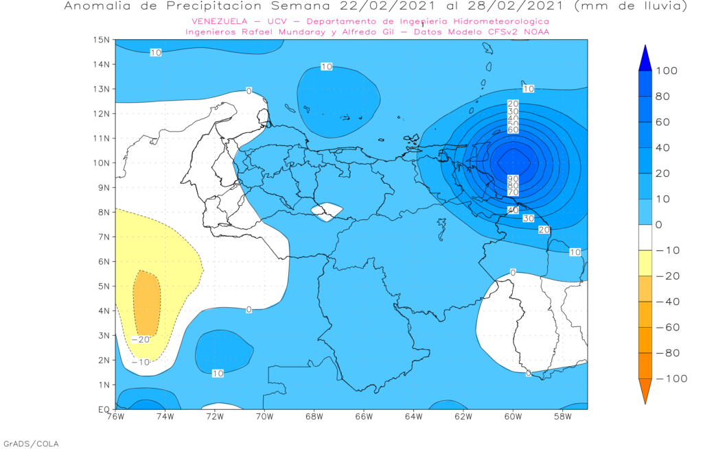 La semana del 22 al 28 de febrero, se prevé en general eventos de precipitaciones entre anomalías positivas y cercanas de la media. Las anomalías positivas mas importante se aprecian sobre Monagas, Sucre y Delta Amacuro.