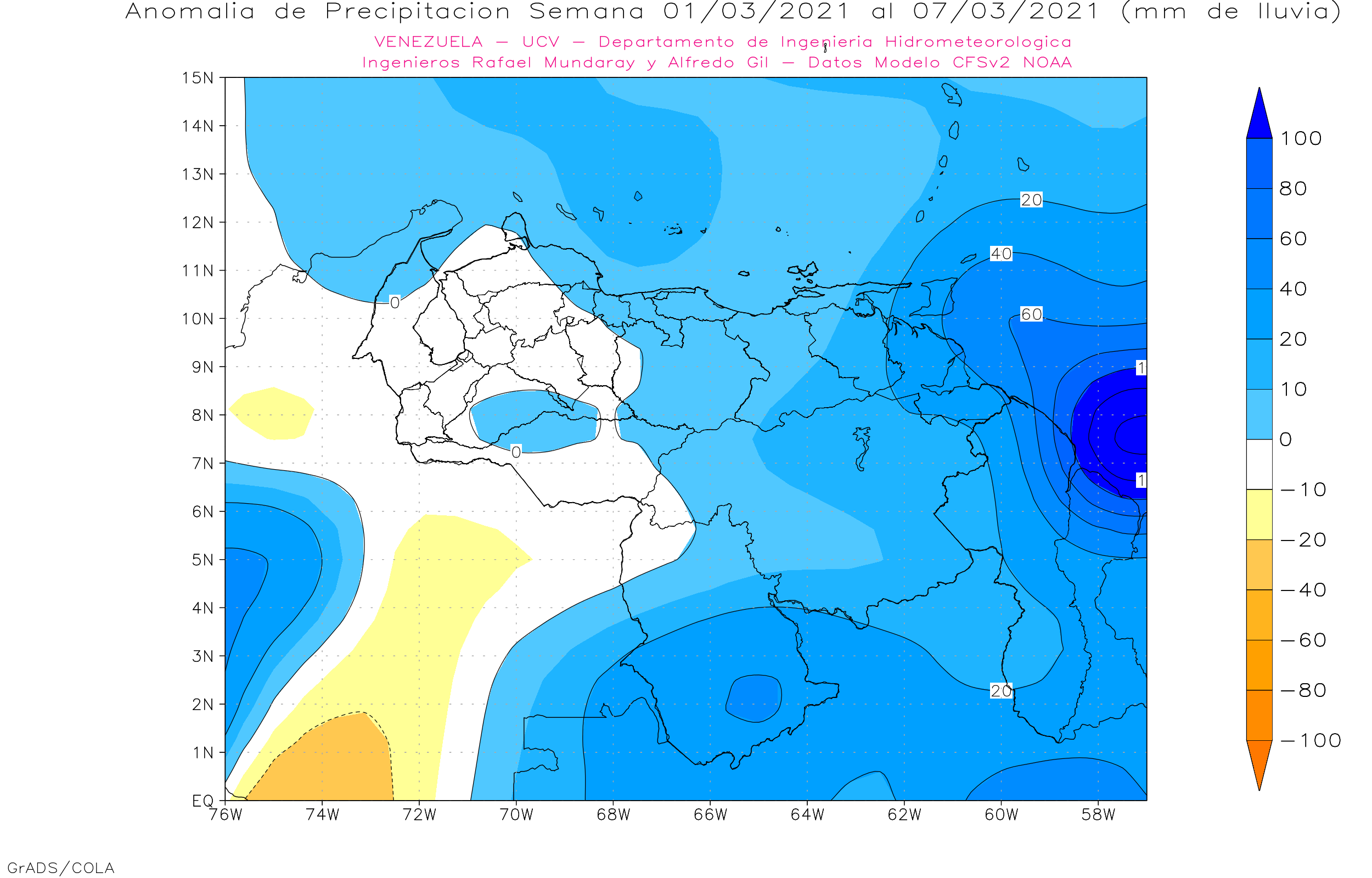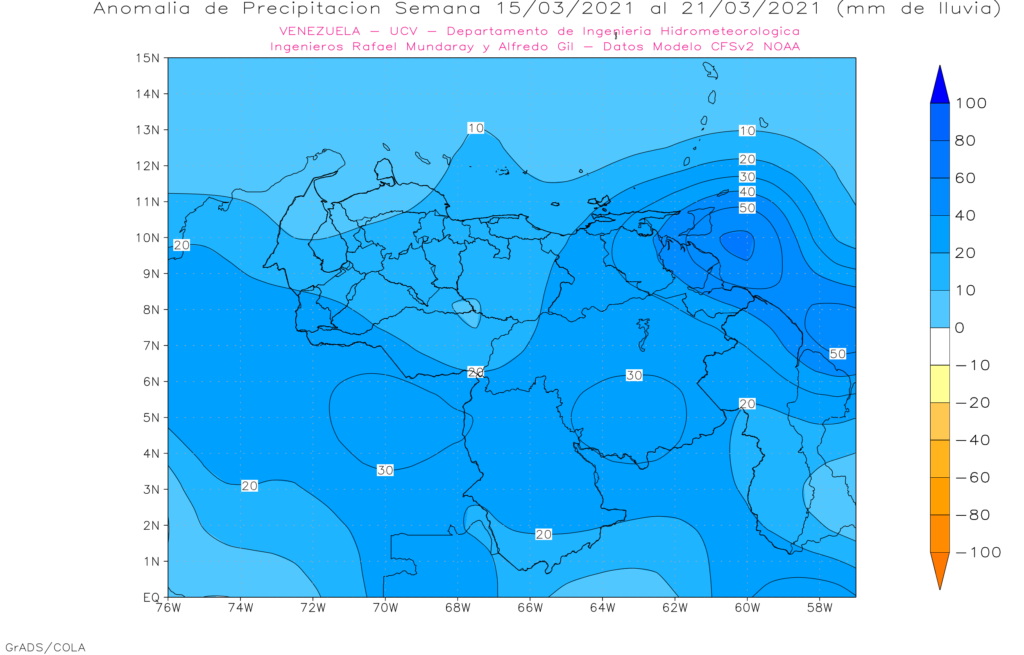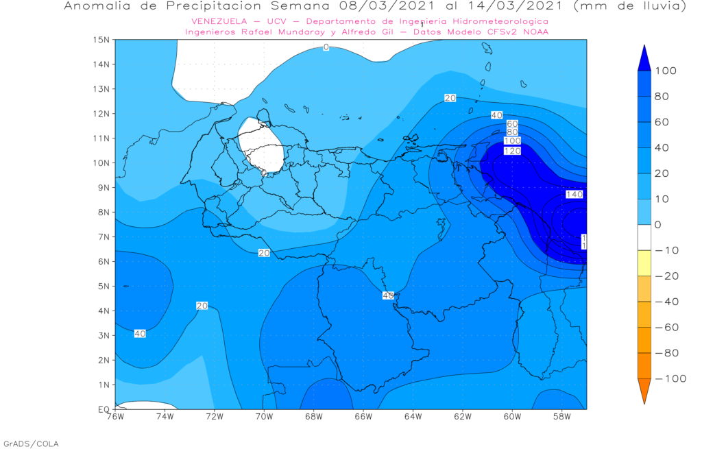 La semana del 15 al 21 de marzo, se prevé en general eventos de precipitaciones entre anomalías positivas y cercanas de la media, pero una gran parte del país se observaran anomalías positivas por encima de 20 mm, las mas importantes Delta Amacuro, Sucre, Monagas, Anzoategui, Bolívar, Amazonas y Táchira